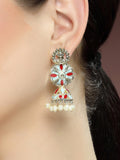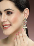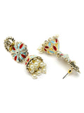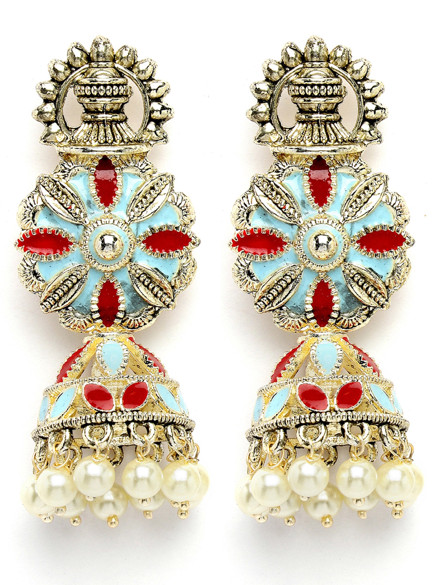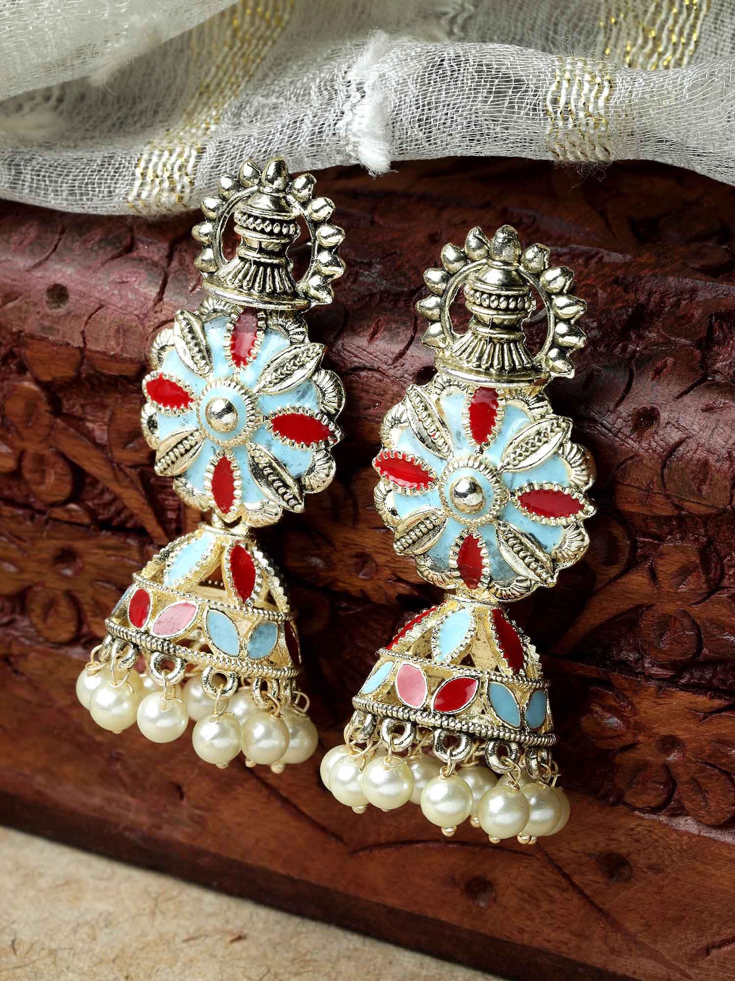 Karatcart Gold Plated Floral Design Red and Light Blue Meena Jhumki Earrings for Women