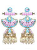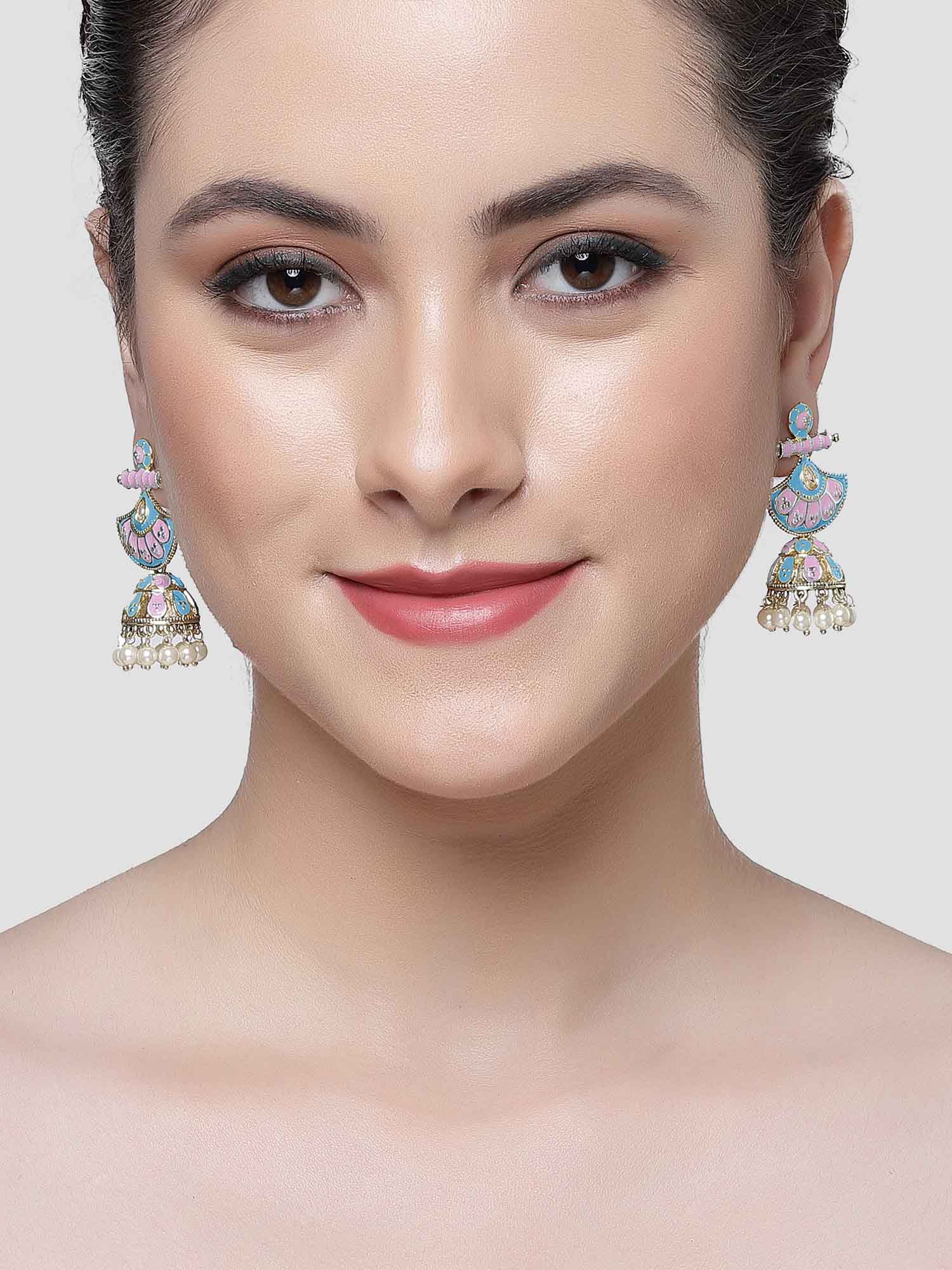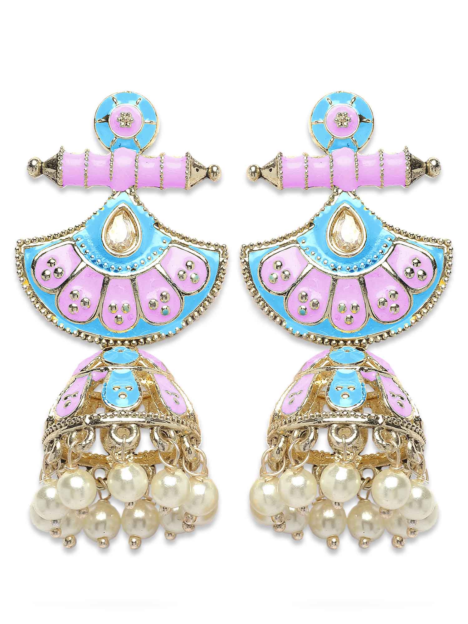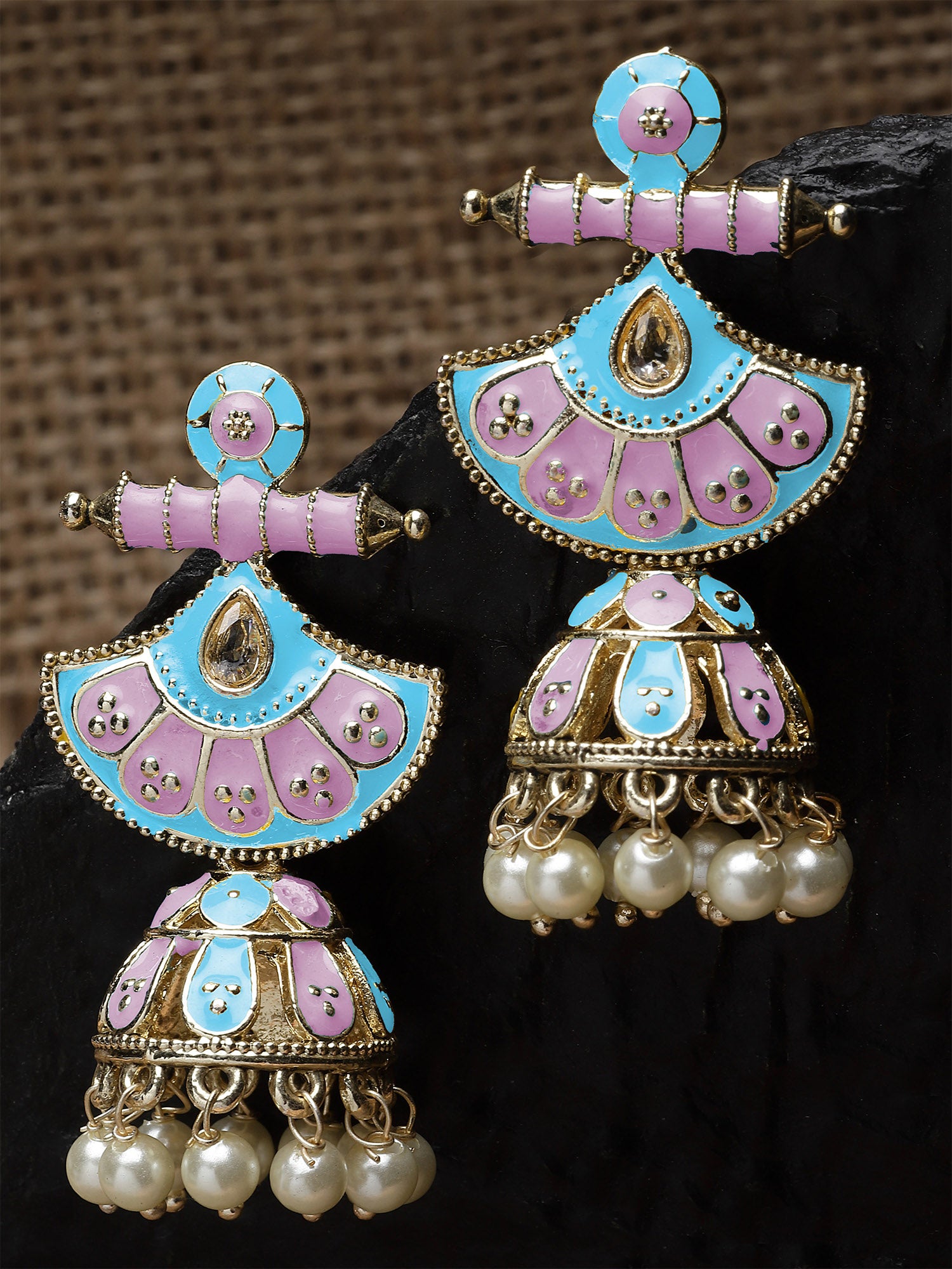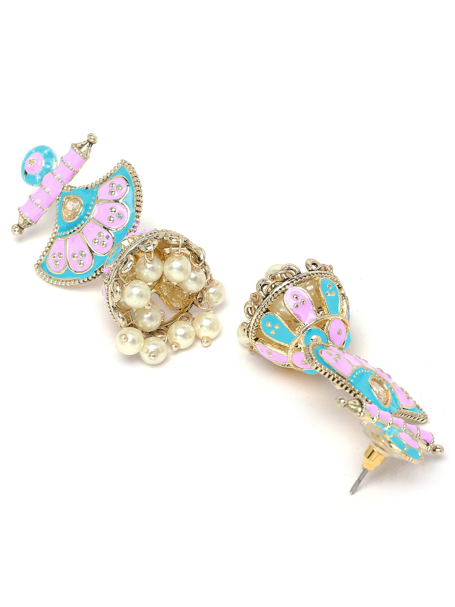 Karatcart Gold Plated Pink and Light Blue Meena Jhumki Earrings for Women