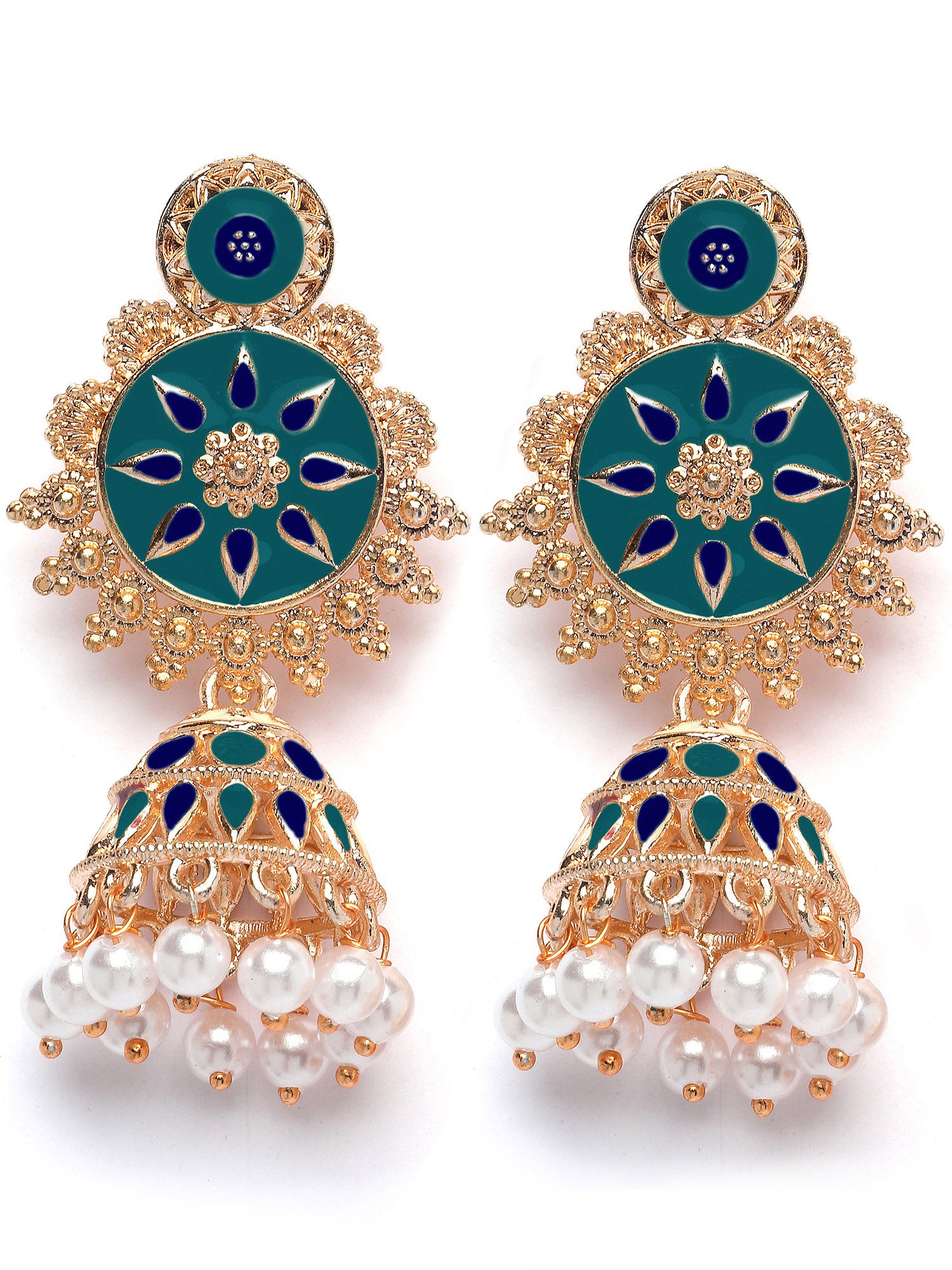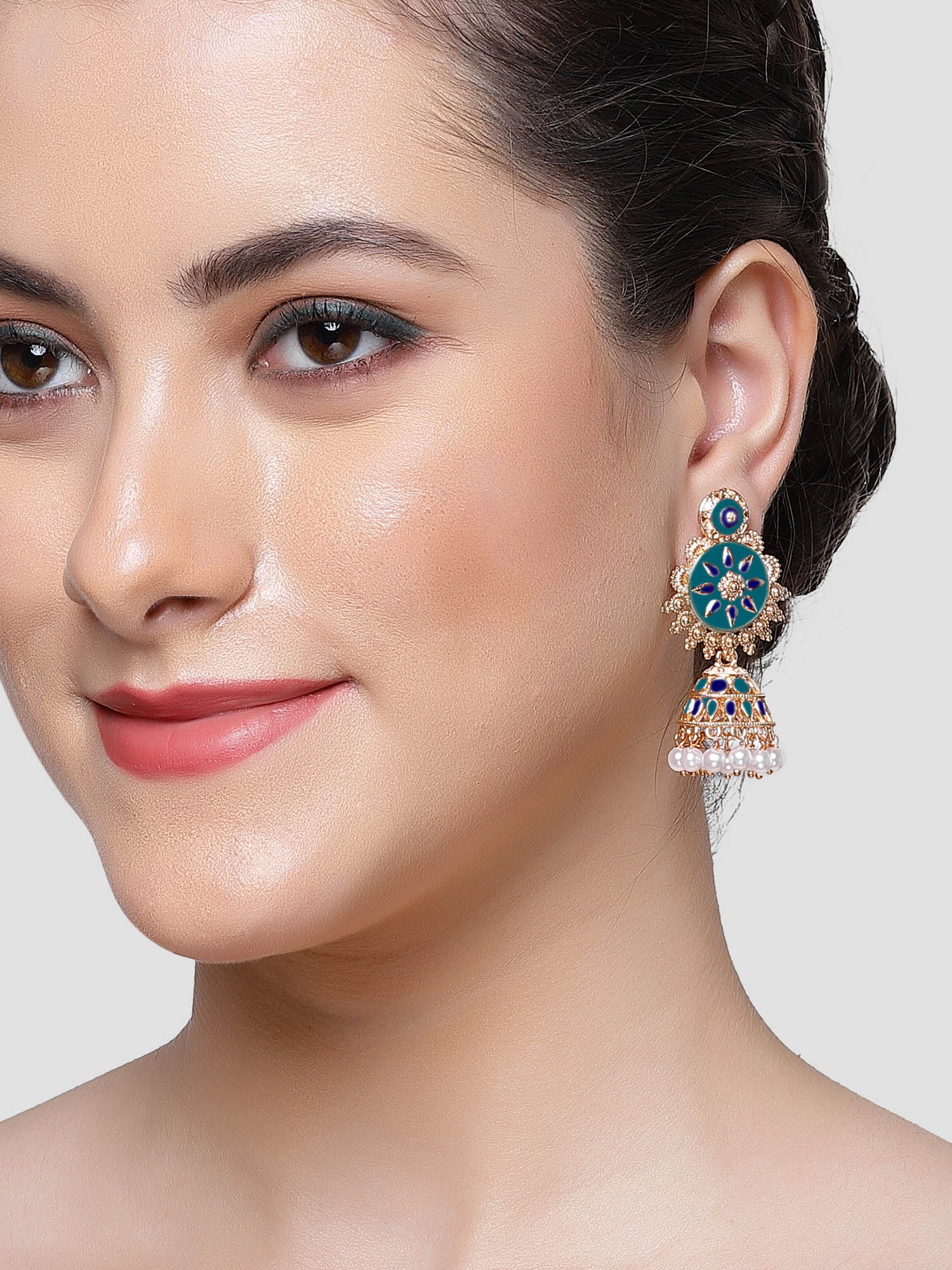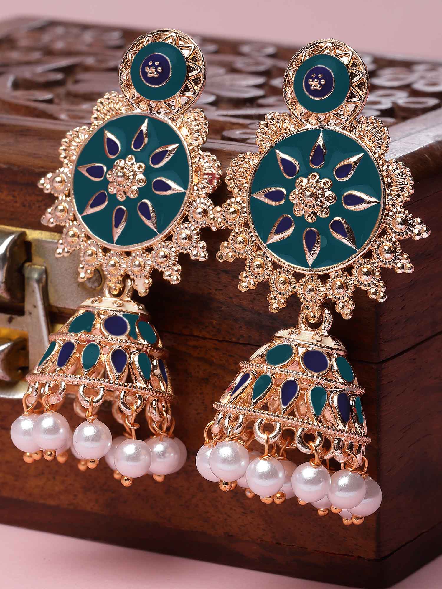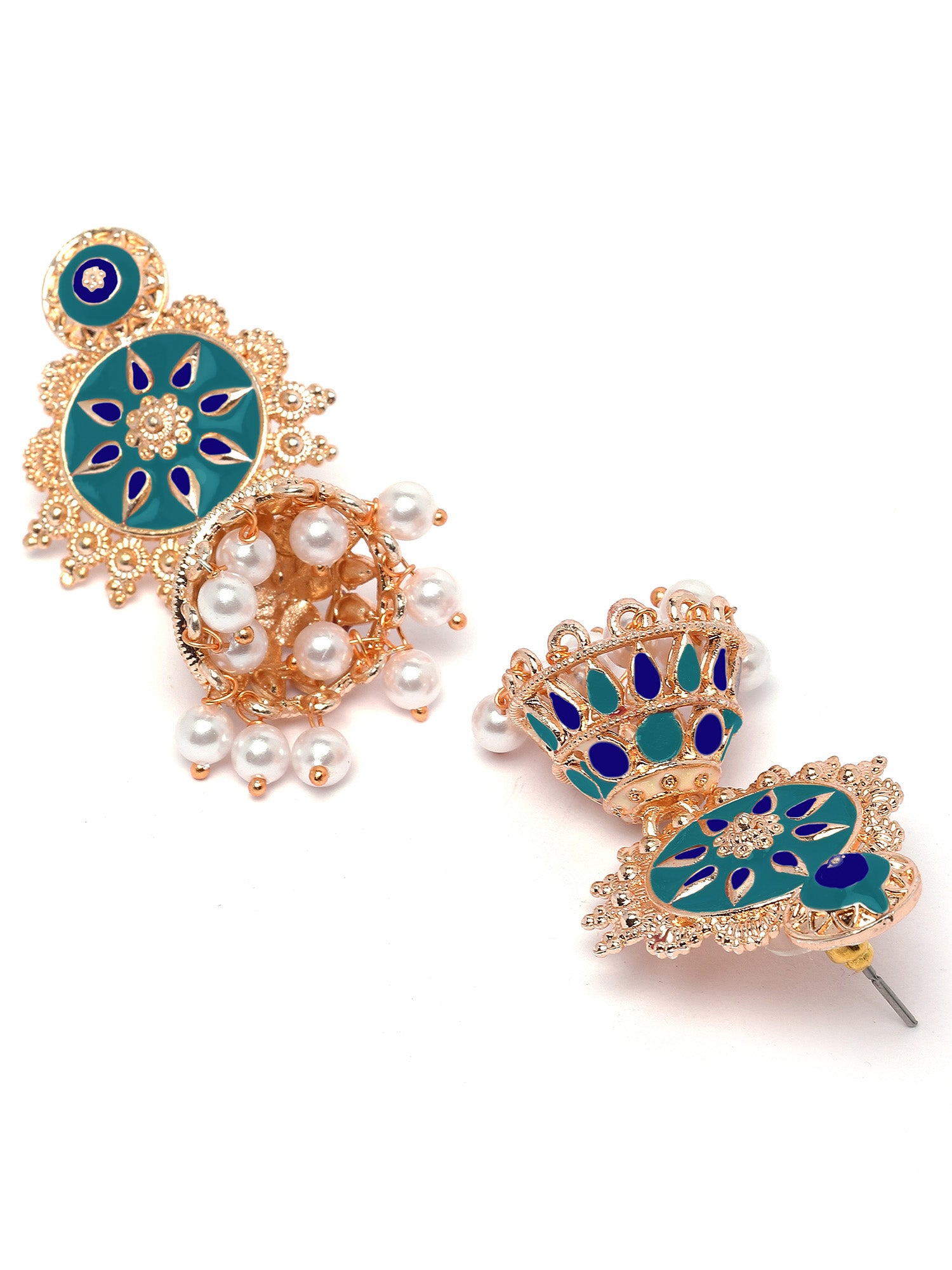 Karatcart Rose Gold Plated Blue Meena Floral Jhumki Earrings for Women