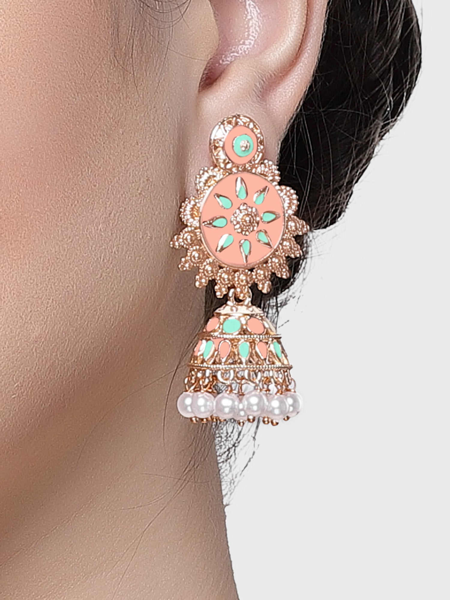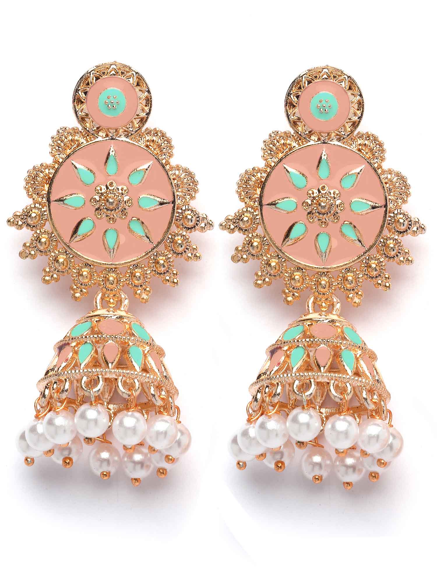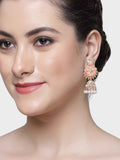 Karatcart Rose Gold Plated Pink and Light Blue Meena Floral Jhumki Earrings for Women