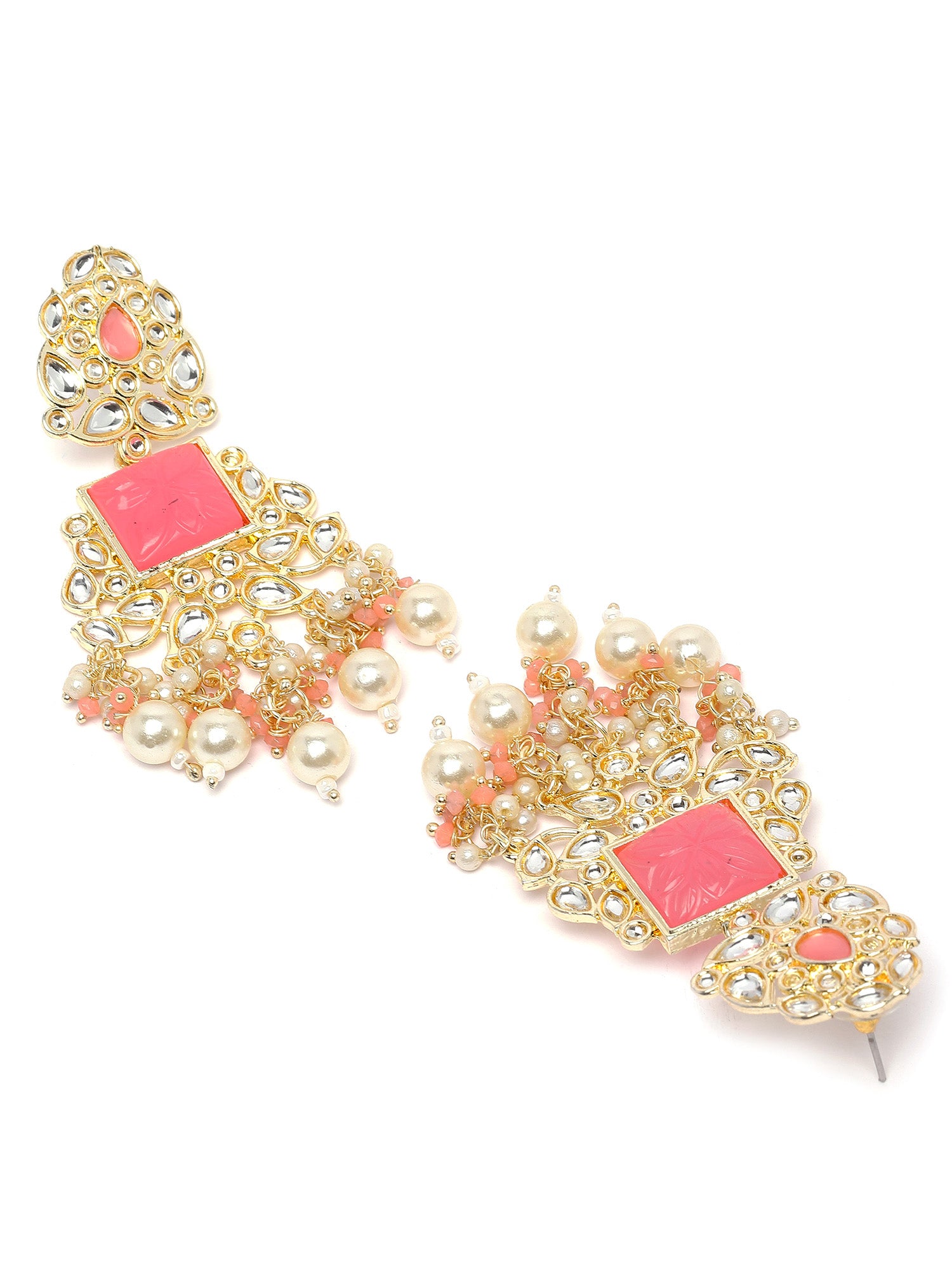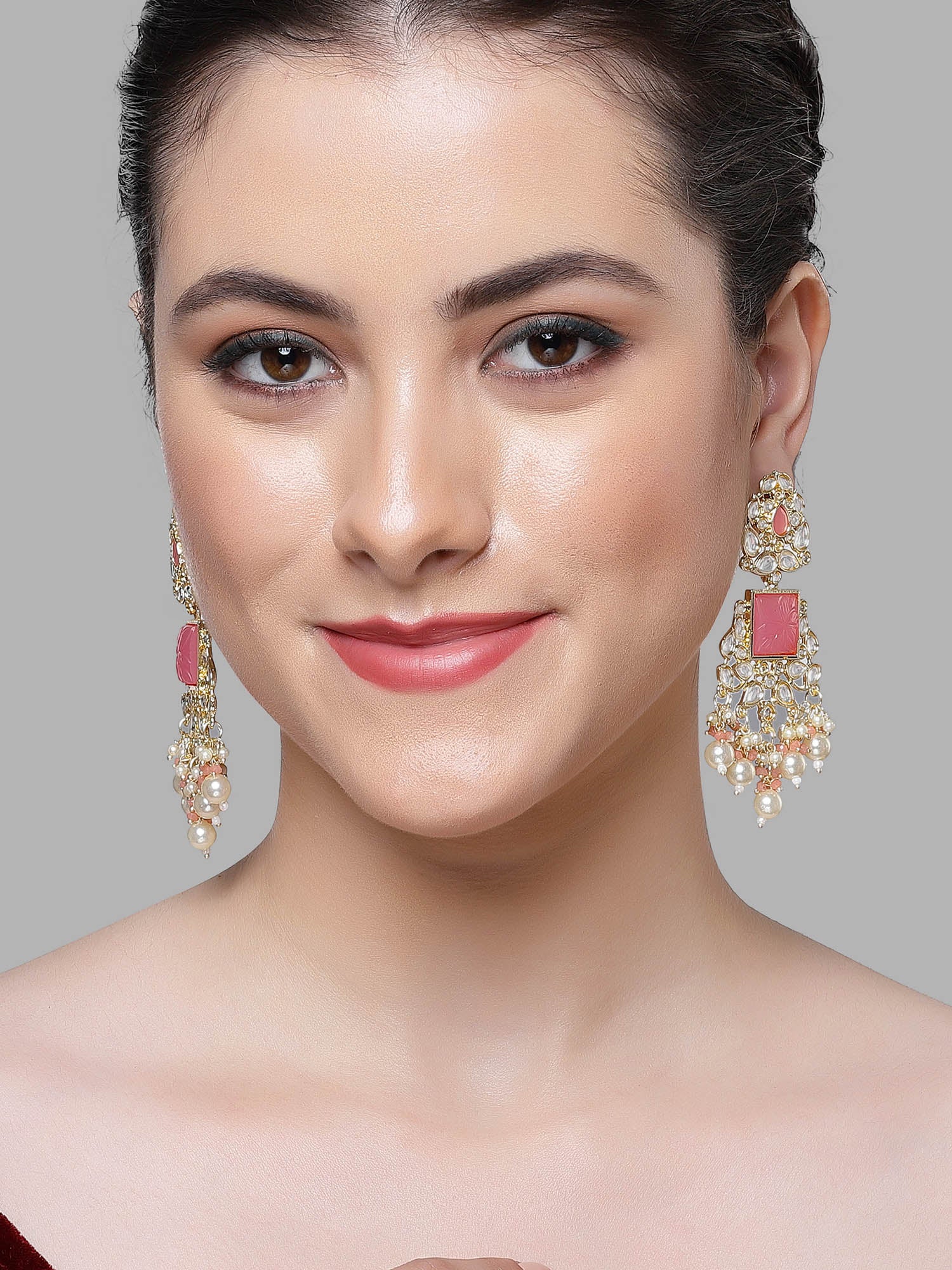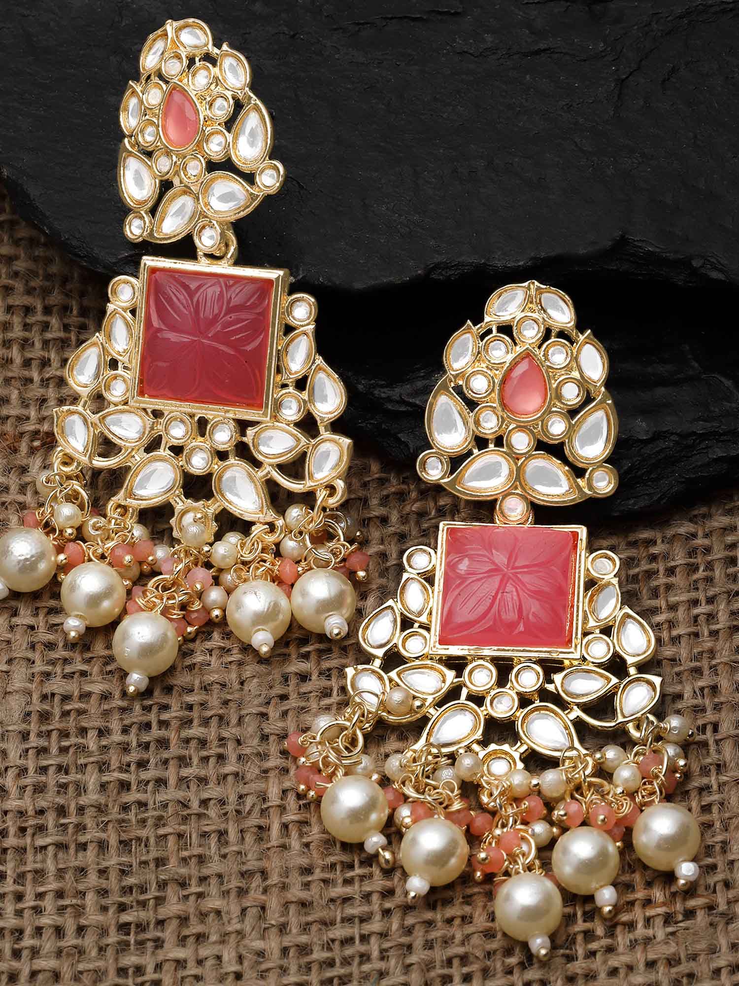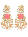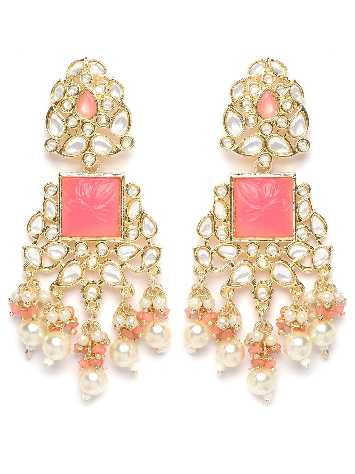 Karatcart Gold Plated Pink Carved Stone Kundan Drop Earrings for Women