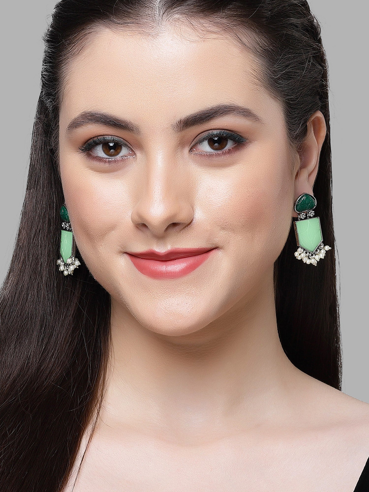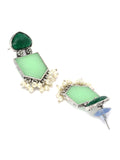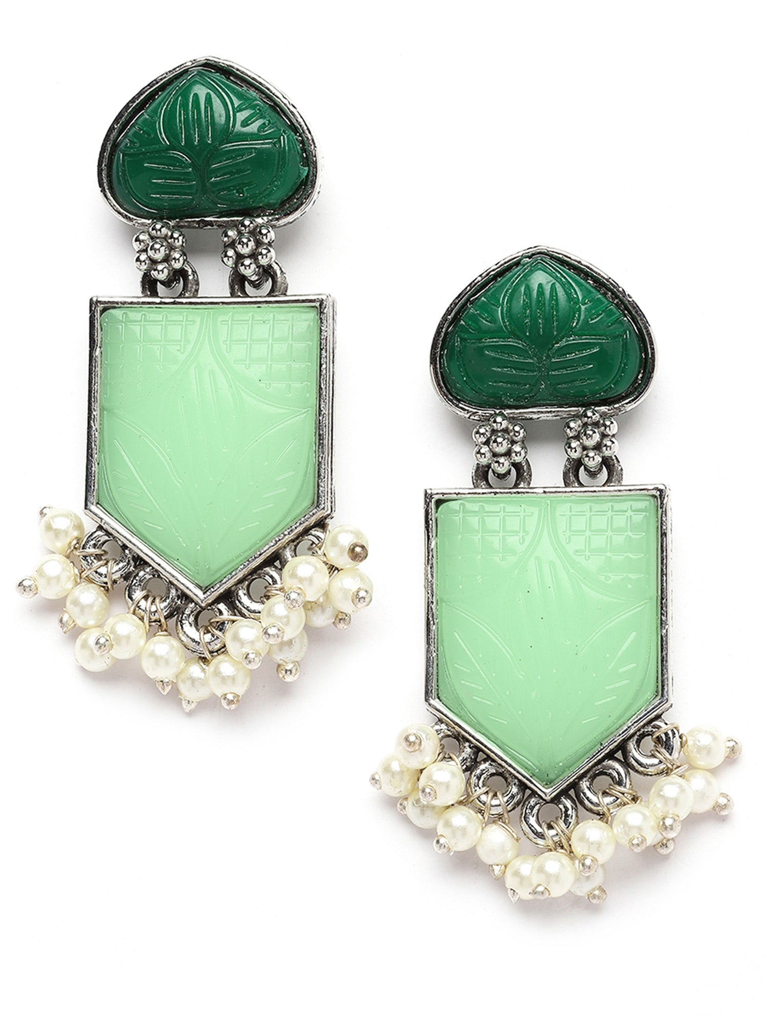 Karatcart Silver Tone Dark Green & Lime Green Carved Stone Studded Drop Earrings for Women