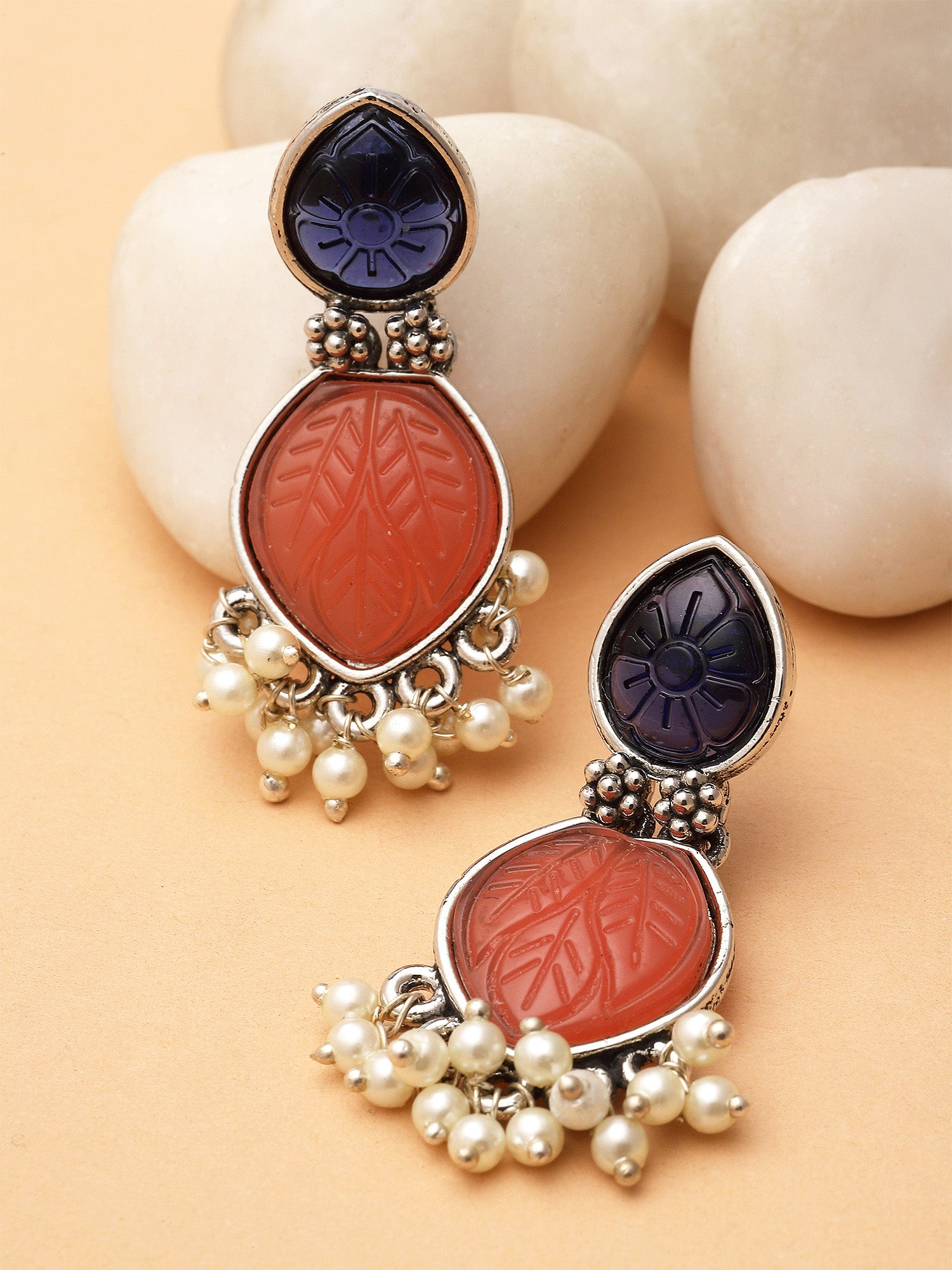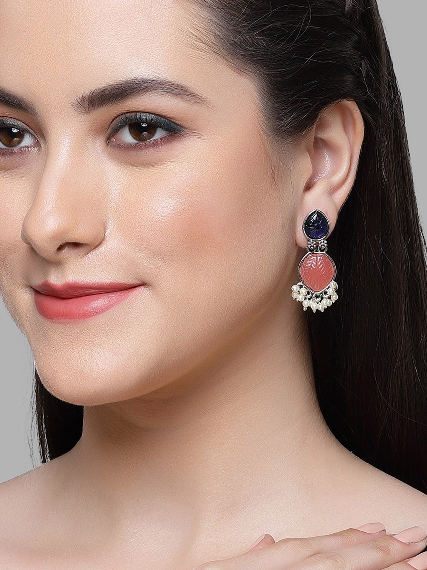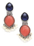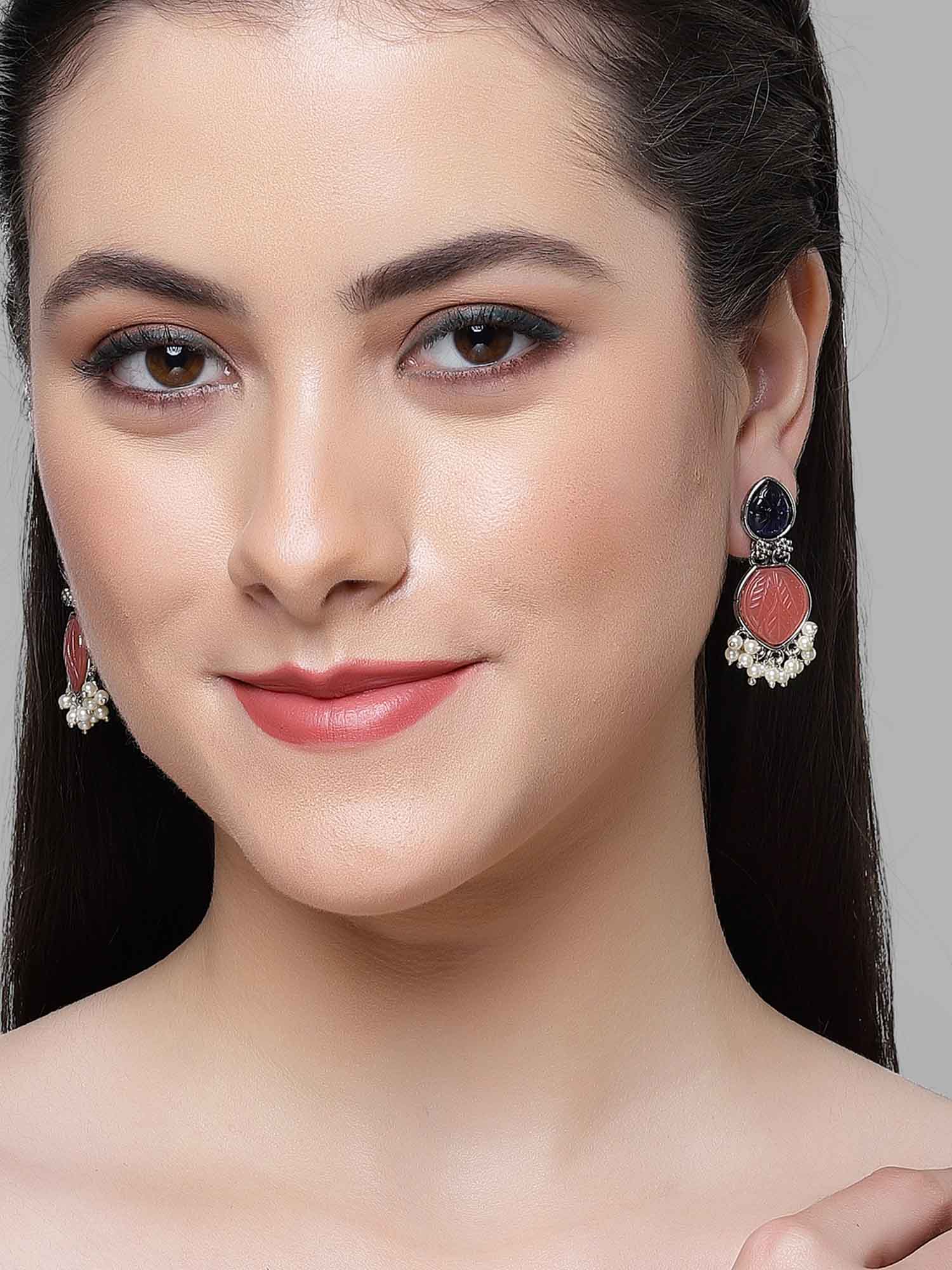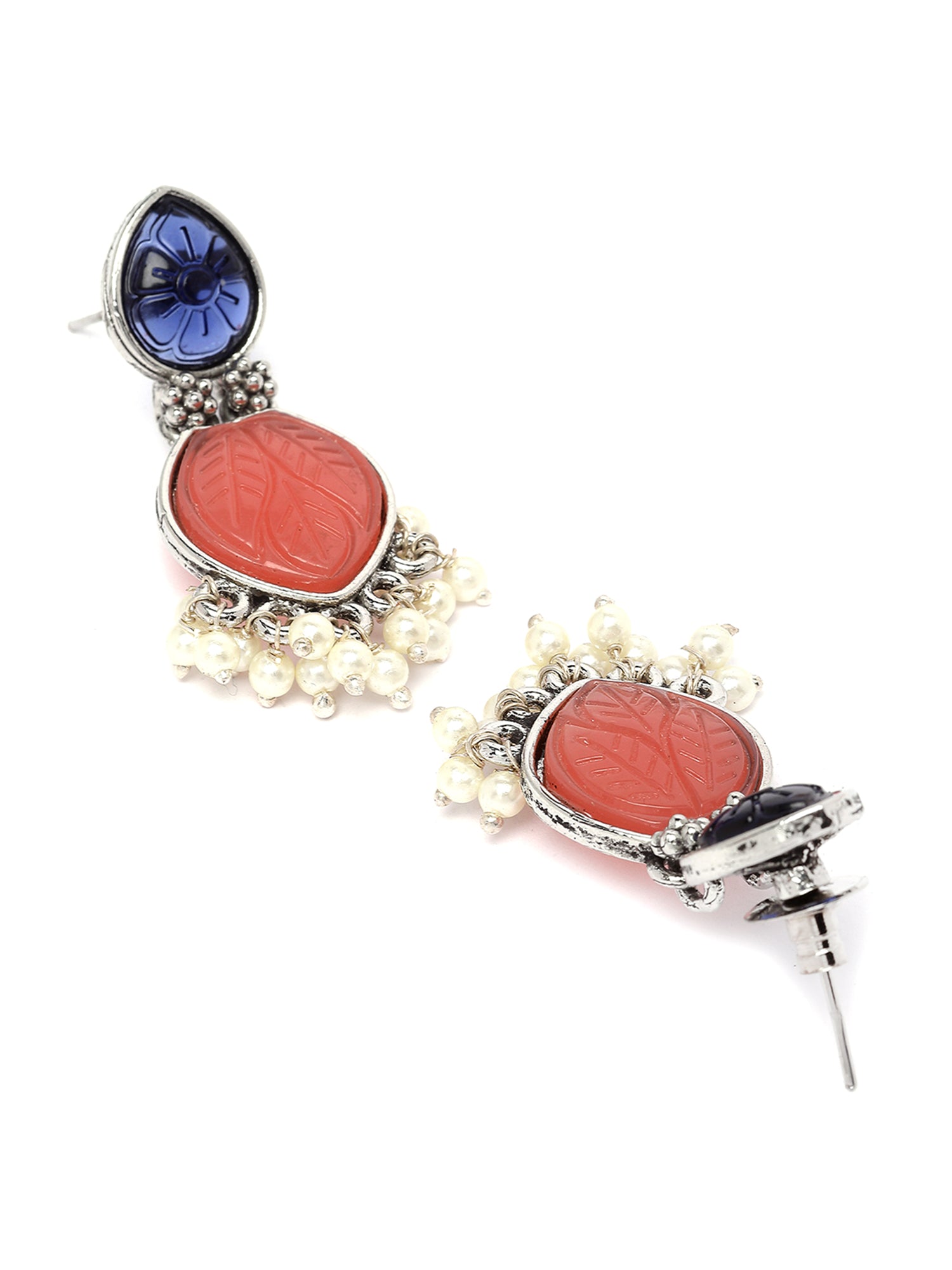 Karatcart Silver Tone Drop Shape Blue & Peach Carved Stone Studded Drop Earrings for Women