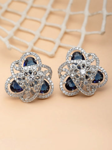 Karatcart Silver Plated Blue Cubic Zirconia Floral Design Stud Earrings for Women