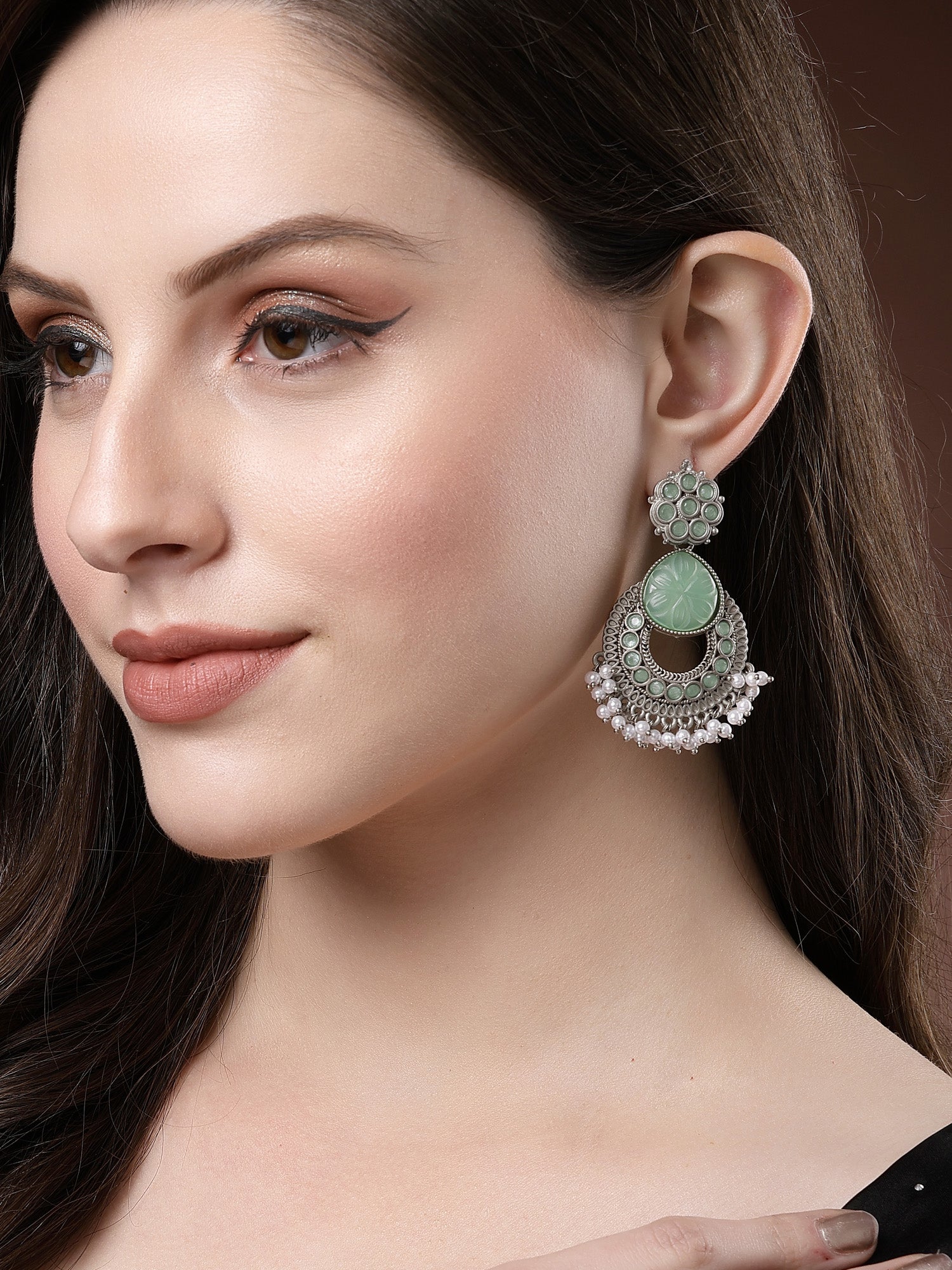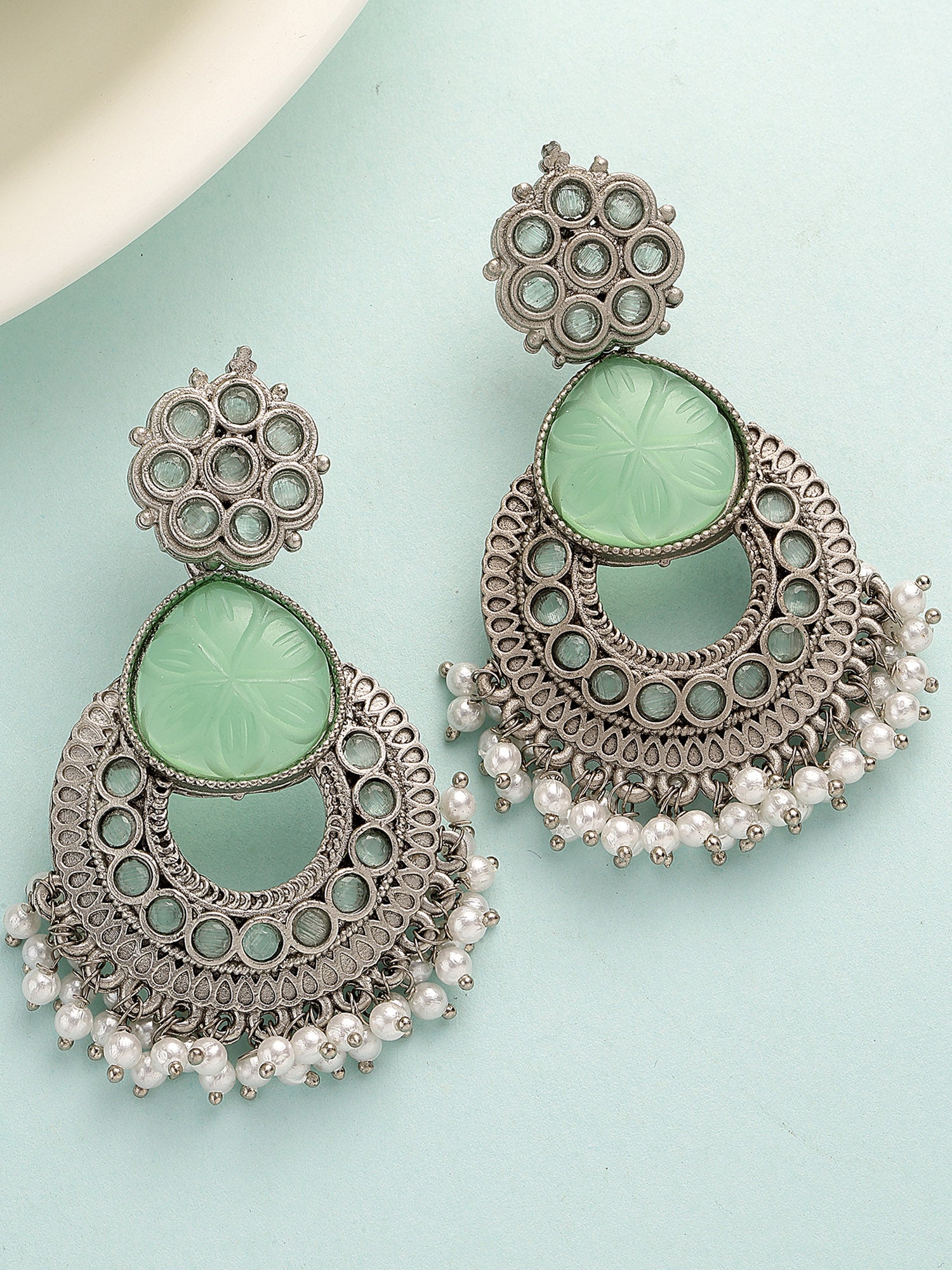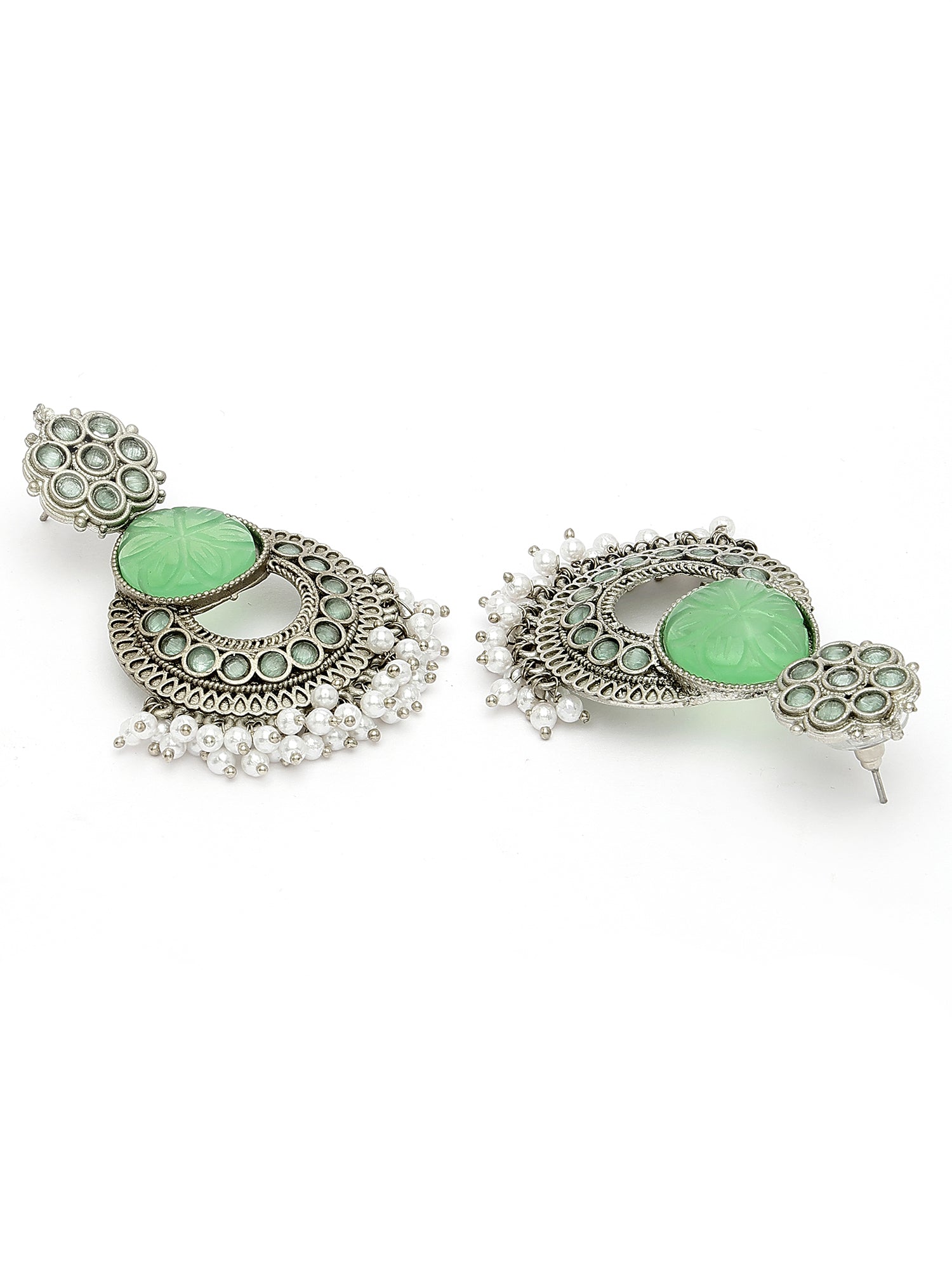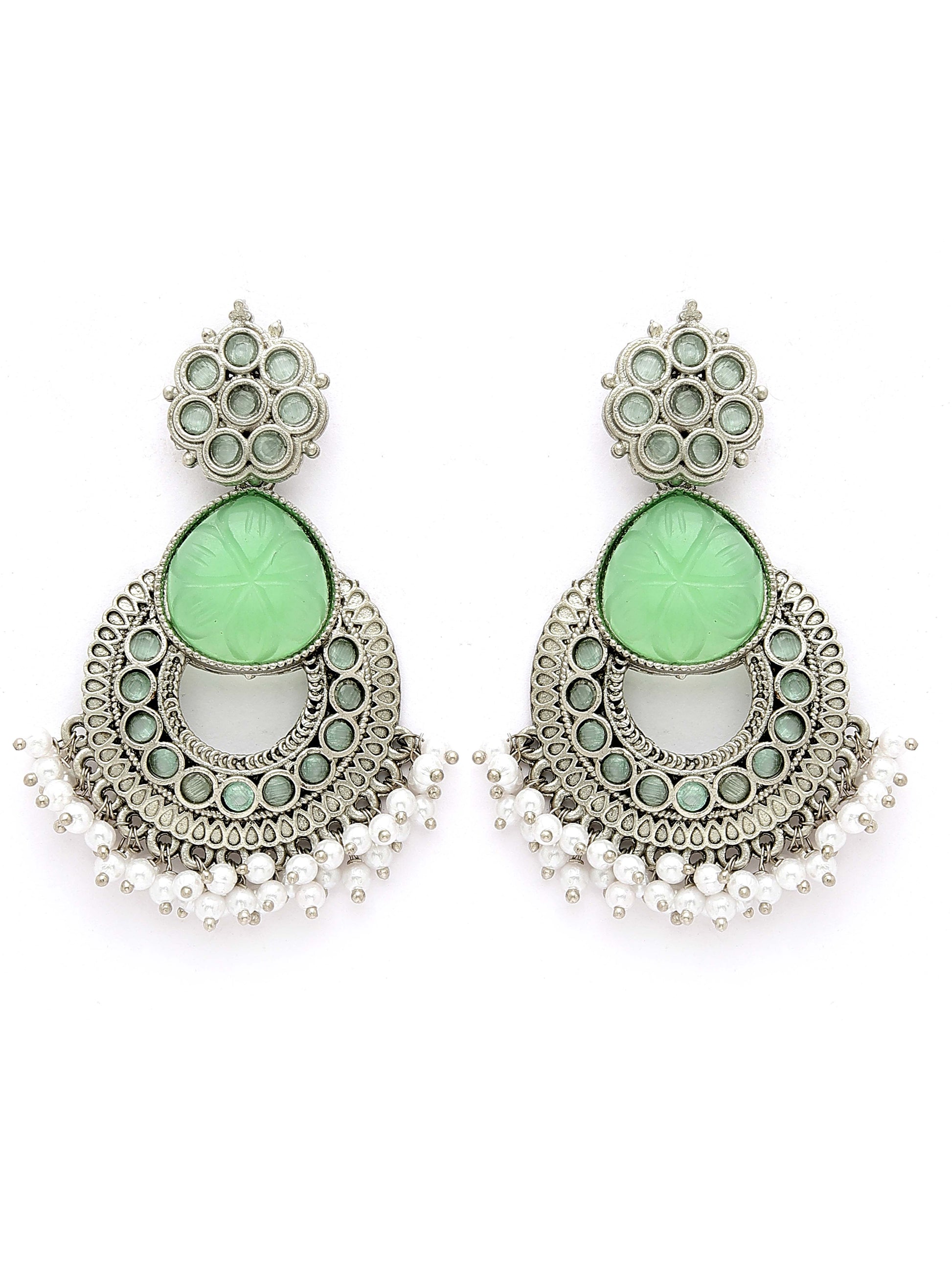 Karatcart Oxidised Silver Light Green Carved Stone Drop Earrings for Women