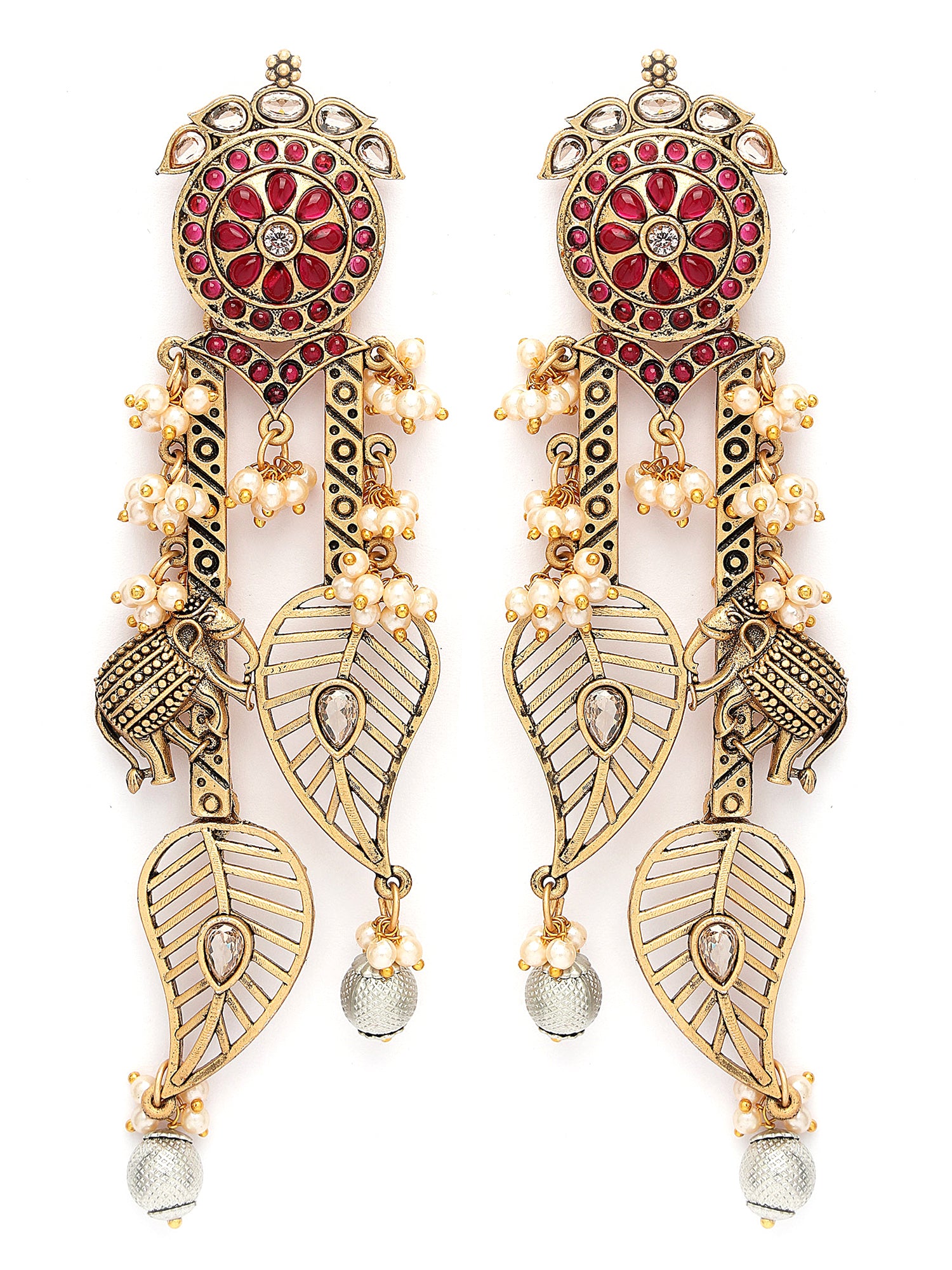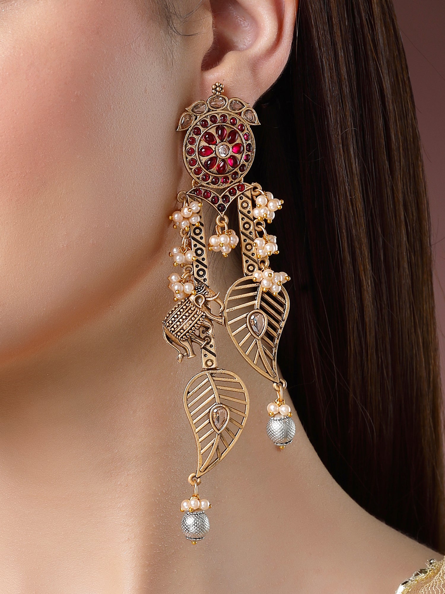 Our Antique Leaf and Elephant Motif Jhumki Earrings. These exquisite danglers blend a classic Indian look with a unique, modern design, featuring a graceful leaf shape and charming elephant motif. The lightweight construction ensures comfort, while the delicate pearl hangings add a touch of sophistication. Ideal for weddings, festivals, or any special occasion, these earrings enhance ethnic wear with their fashionable flair. Perfect for gifting or elevating your own jewelry collection,