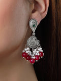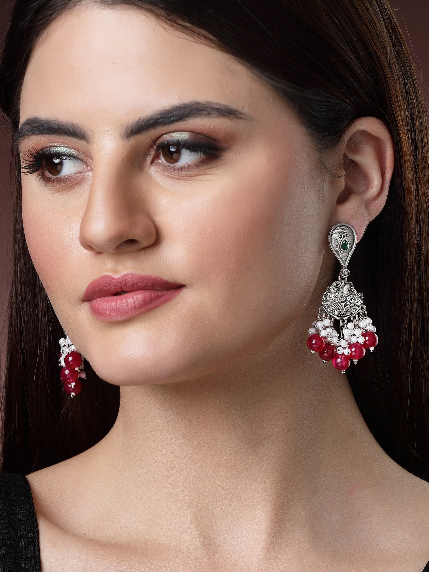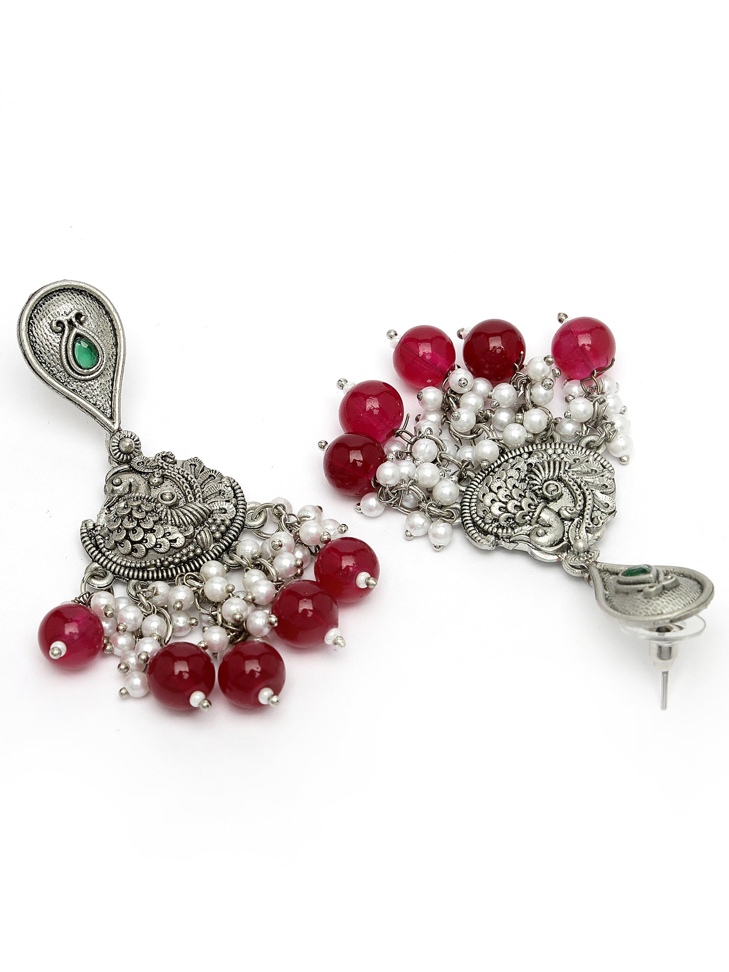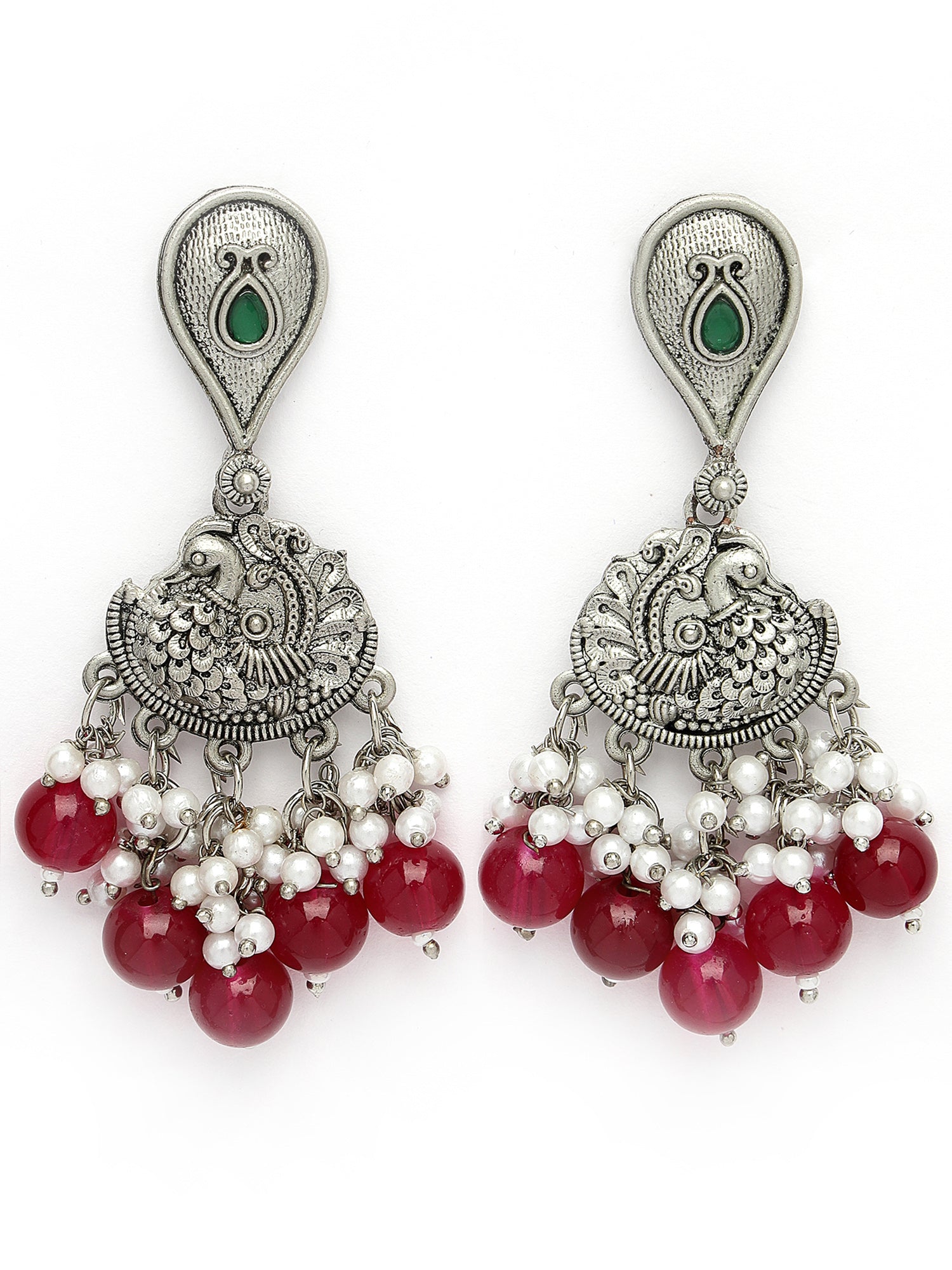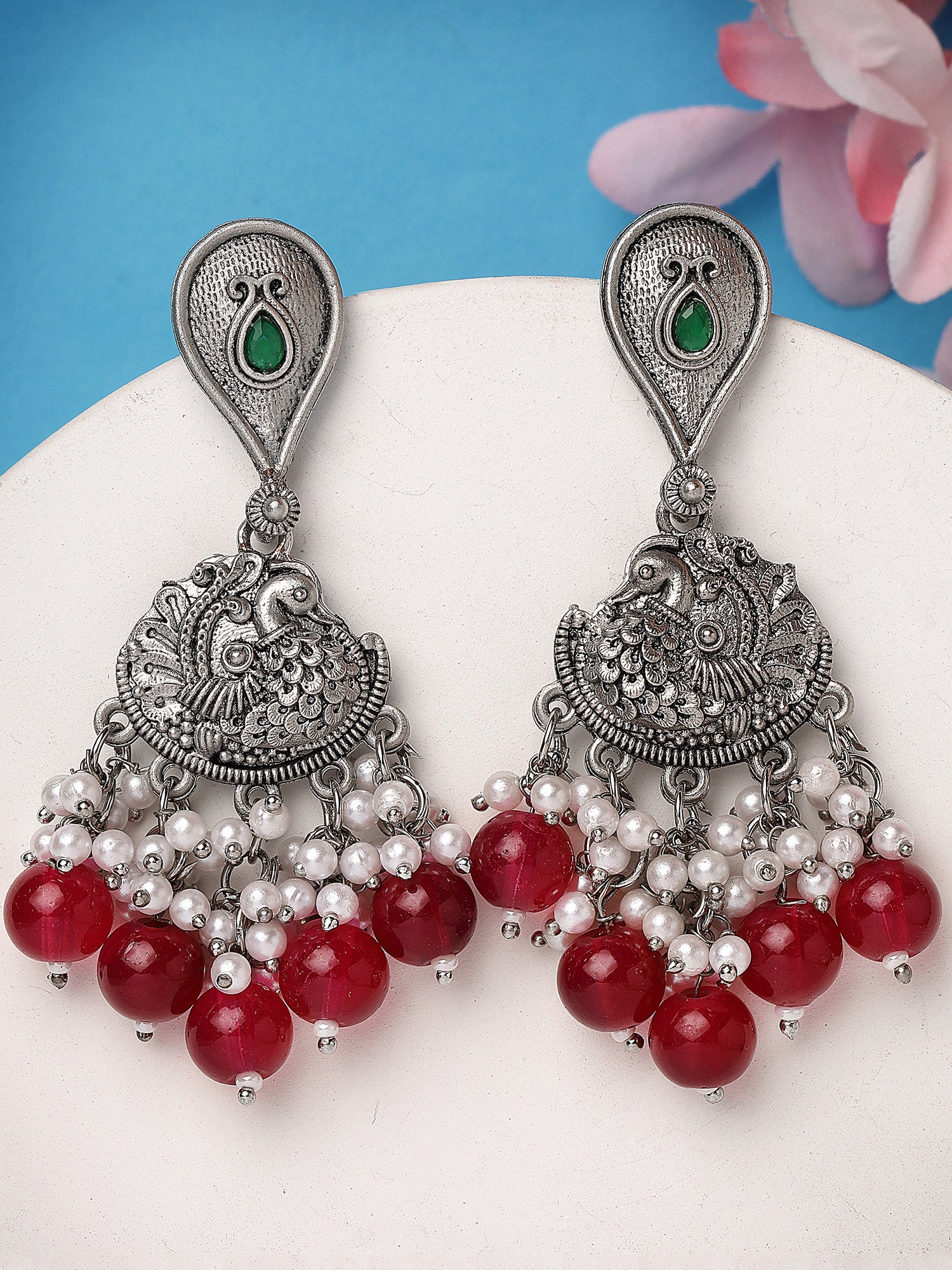 Karatcart Oxidised Silver Red Beads Peacock Design Kundan Drop Earrings for Women