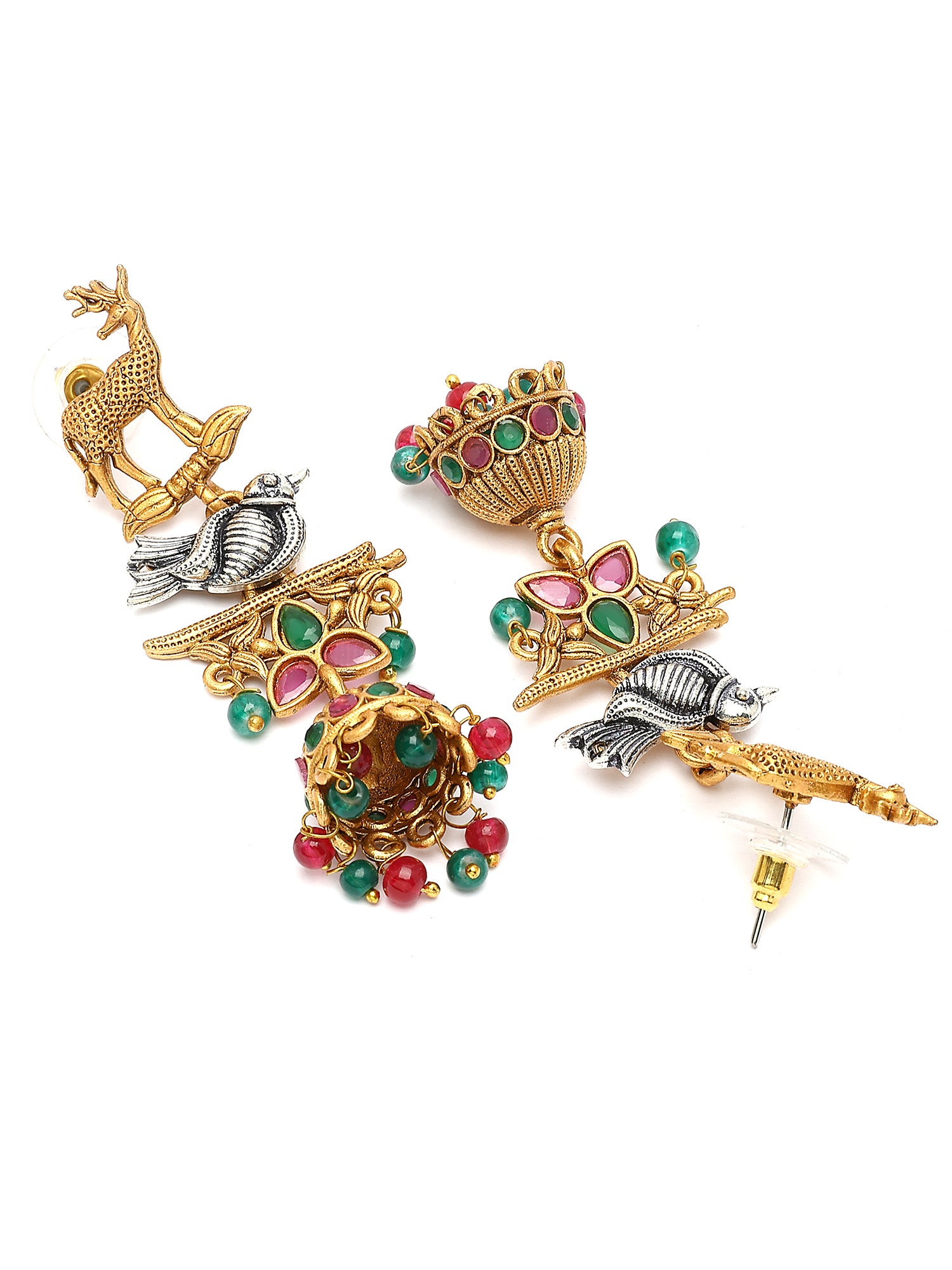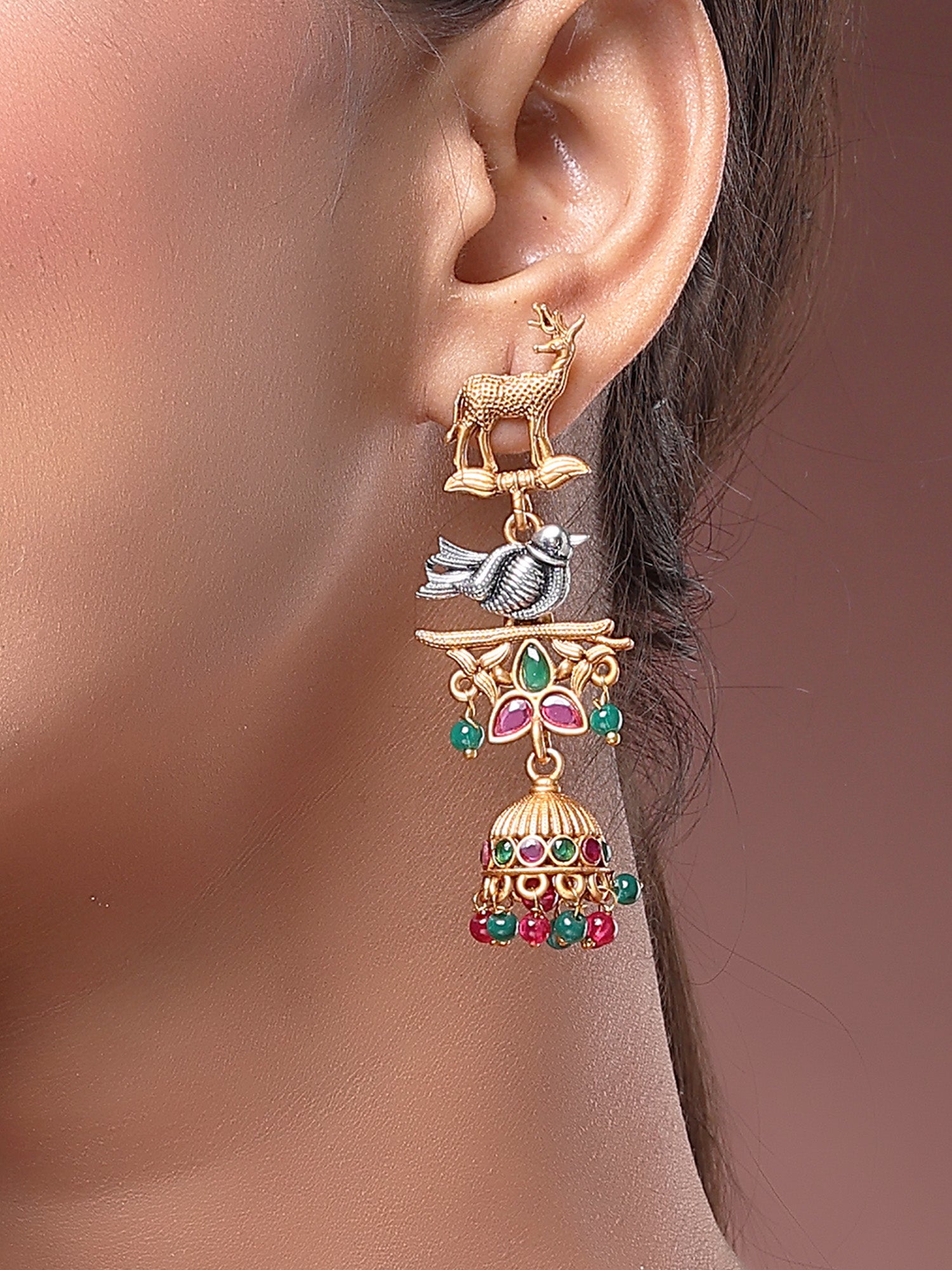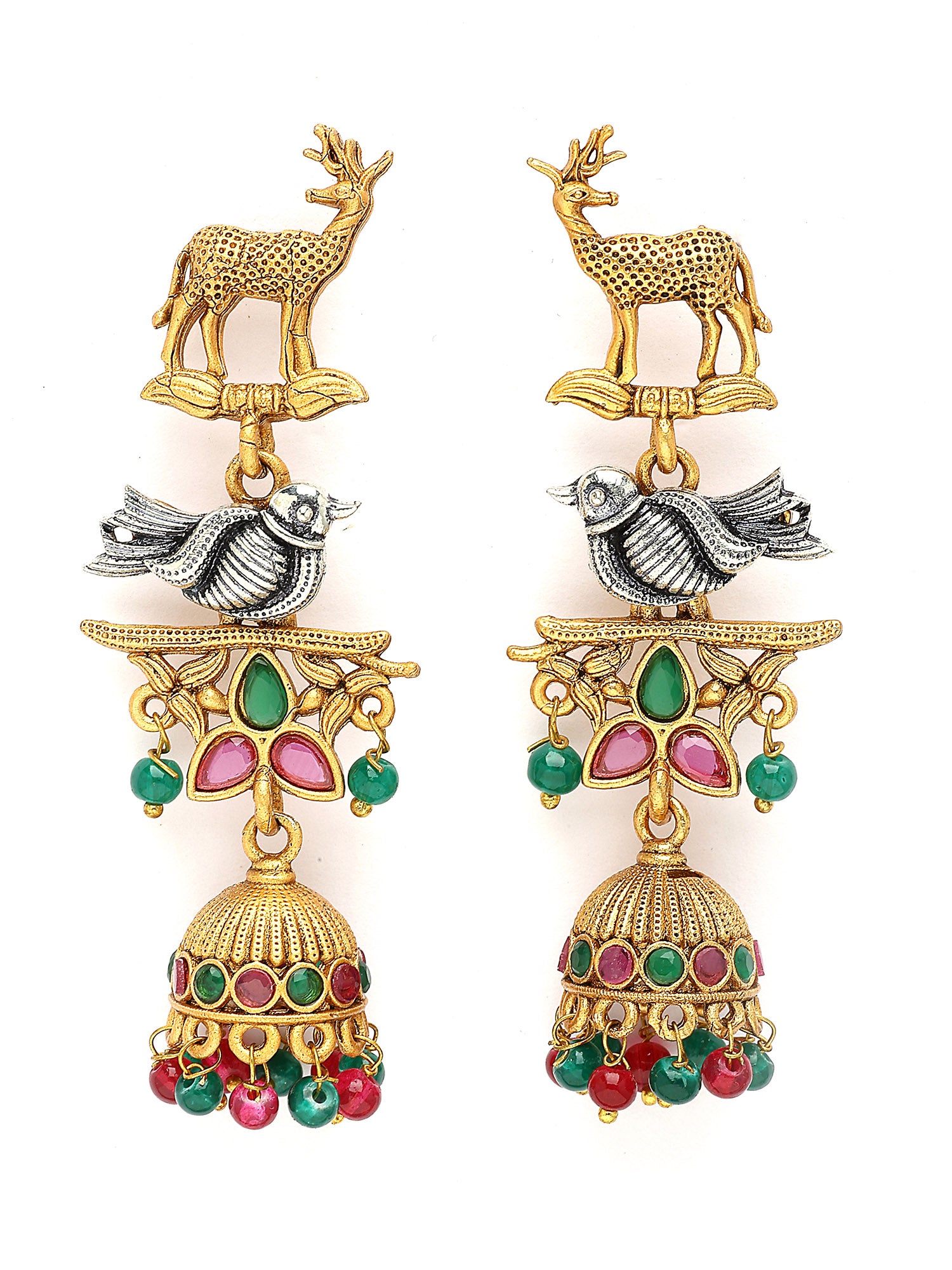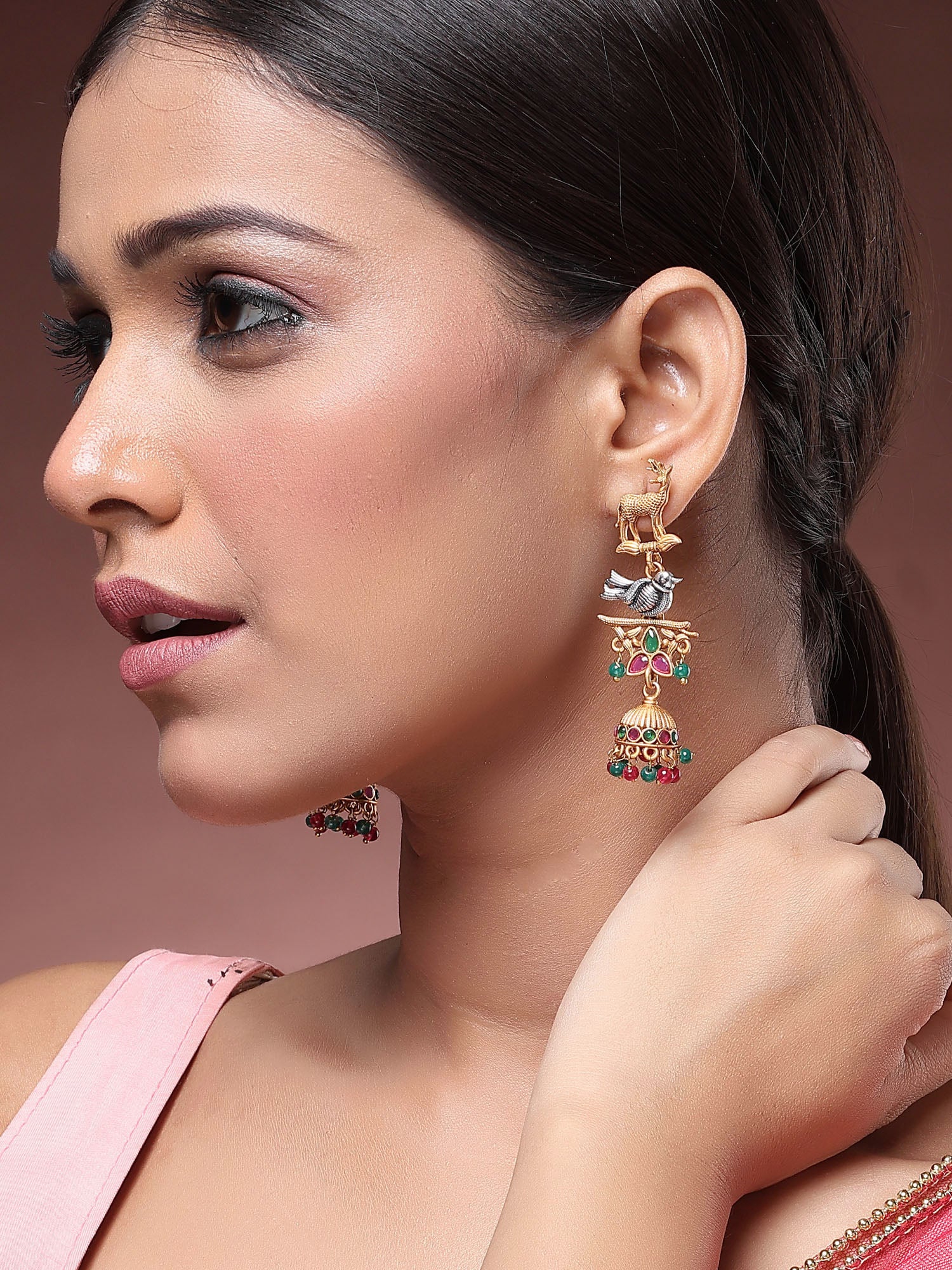 The Karatcart Antique Gold Plated Deer Design Tribal Drop Earrings are a fusion of traditional elegance and artistic craftsmanship. Inspired by tribal aesthetics and animal motifs, these statement earrings showcase a majestic deer design with intricate detailing. The gold-plated finish enhances their charm, while the combination of red, green, and silver beadwork adds a vibrant touch, making them an eye-catching accessory for weddings, festivals, and special occasions. Designed for comfort, these lightweight jhumka-style drop earrings are easy to wear for long hours without discomfort. Their handcrafted detailing and unique tribal-inspired elements make them a standout piece in any jewelry collection.The beaded embellishments and exquisite craftsmanship bring a touch of regal beauty, perfect for those who love intricate and meaningful jewelry. Crafted from high-quality materials, these earrings are nickel-free and lead-free, ensuring they are skin-friendly and safe to wear. The long-lasting gold plating prevents tarnishing, allowing you to cherish them for years. Ideal for gifting, these designer tribal earrings are a thoughtful present for birthdays, anniversaries, or festive celebrations. Elevate your jewelry collection with these elegant and artistic Karatcart Deer Design Tribal Drop Earrings, designed to captivate and impress.