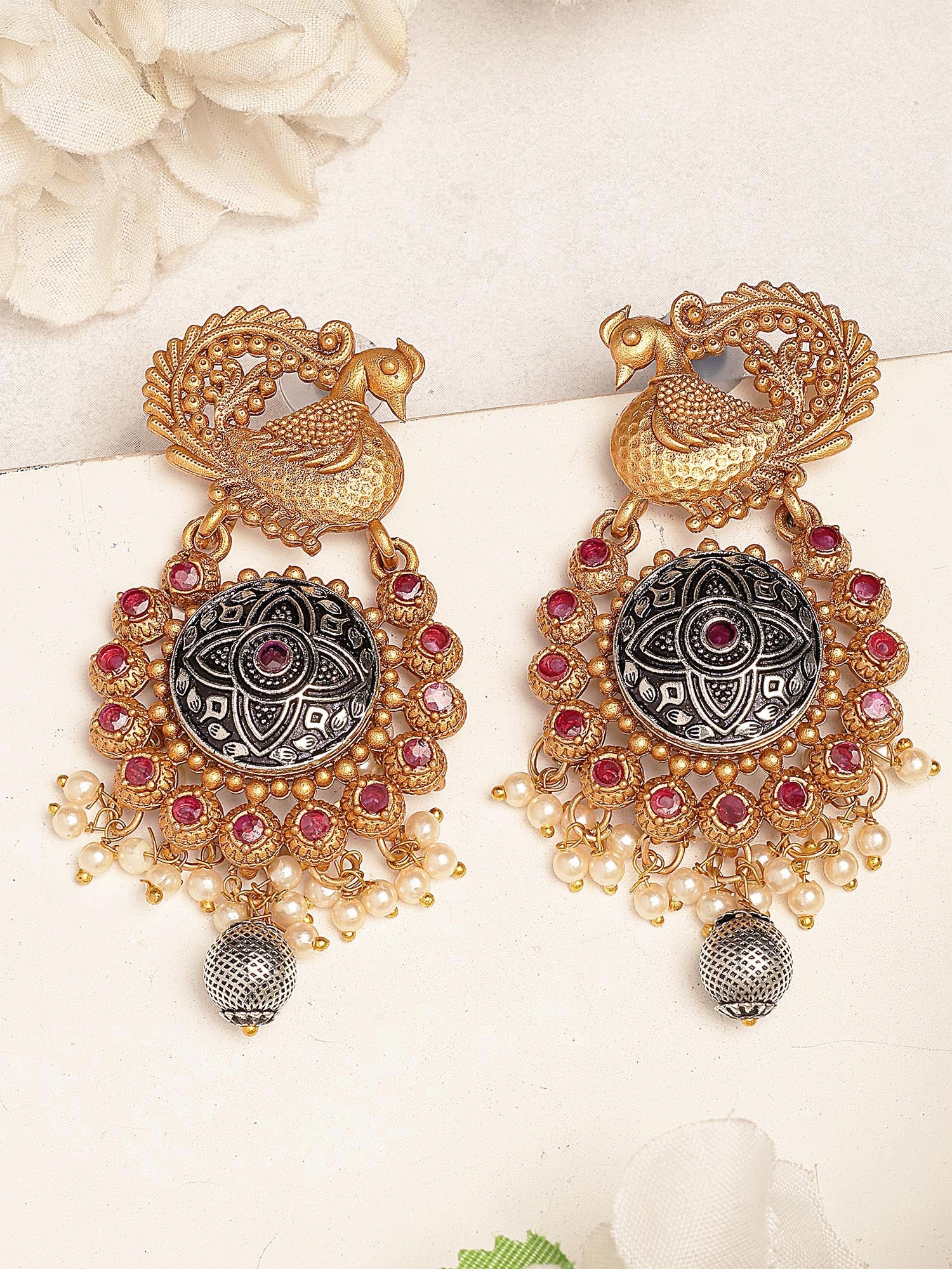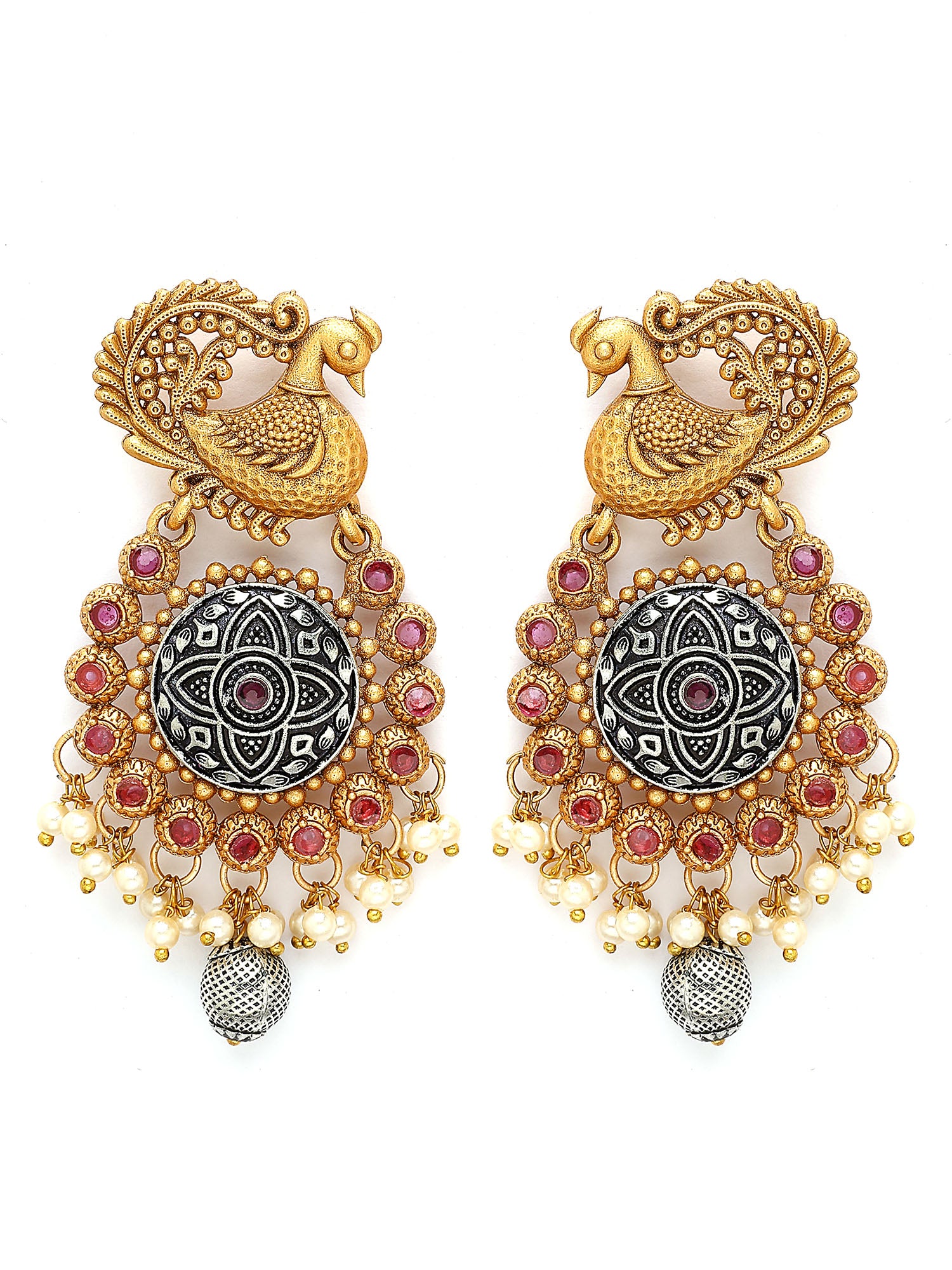 Karatcart Antique Gold Plated Peacock Motif Designer Earrings with Ruby and Pearl Detailing for Women