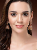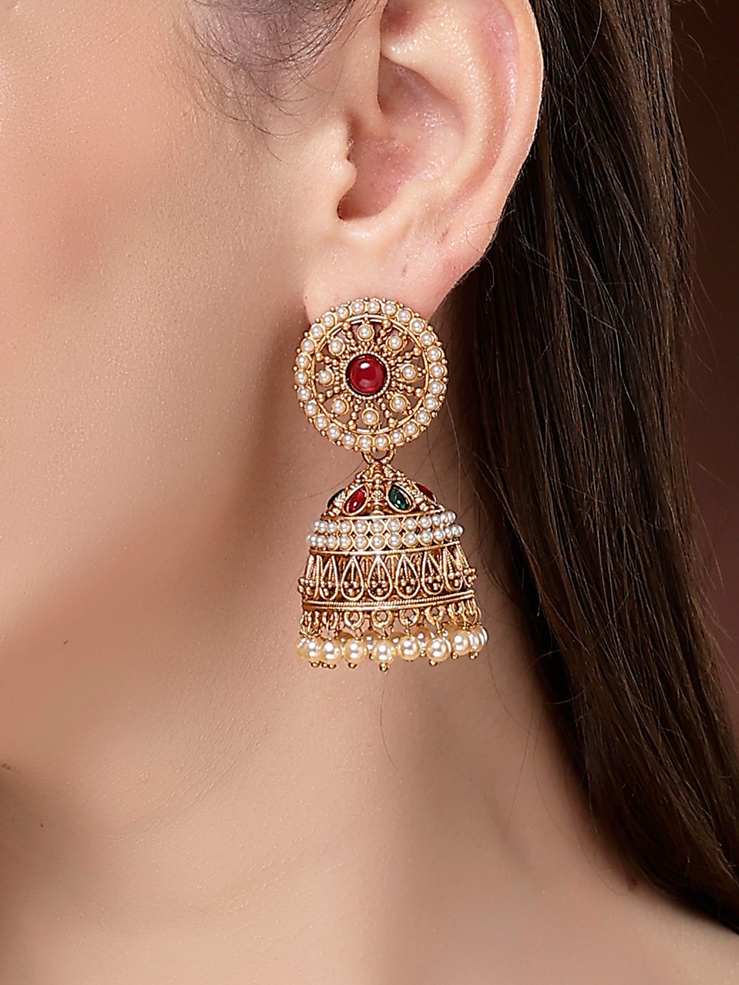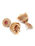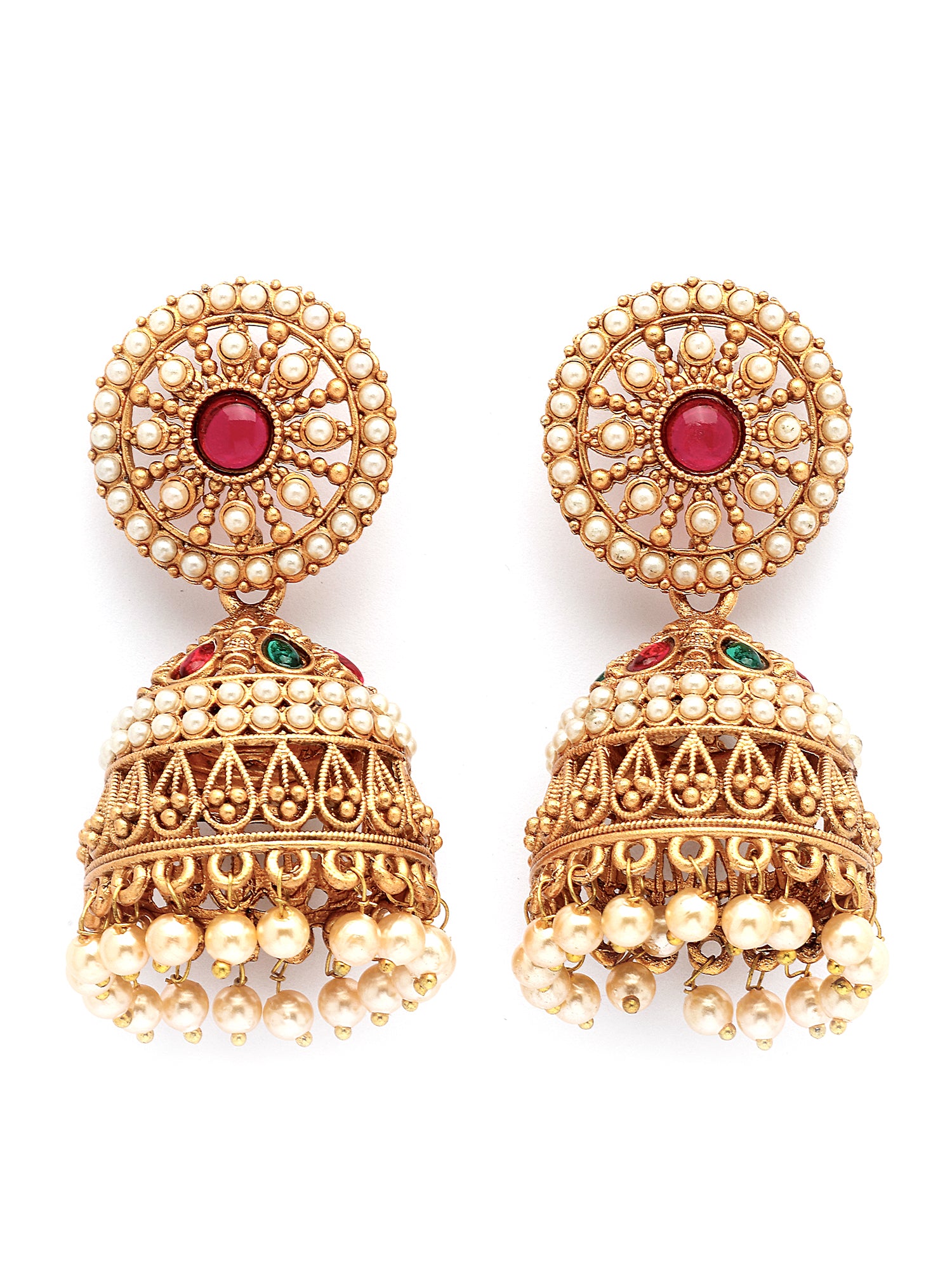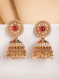 Karatcart Antique Gold Plated Jhumka Earrings with Pearl Beads & Red Stone Center
