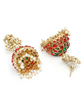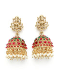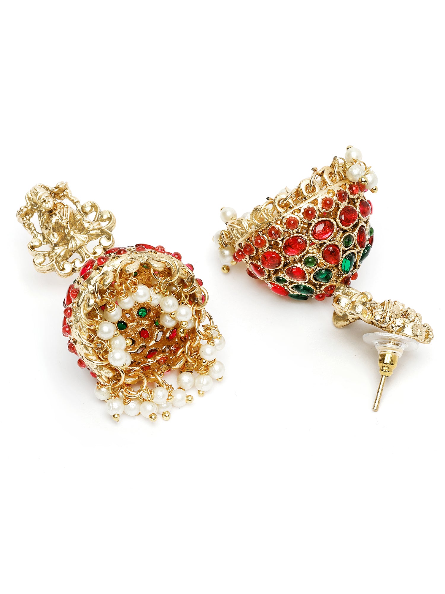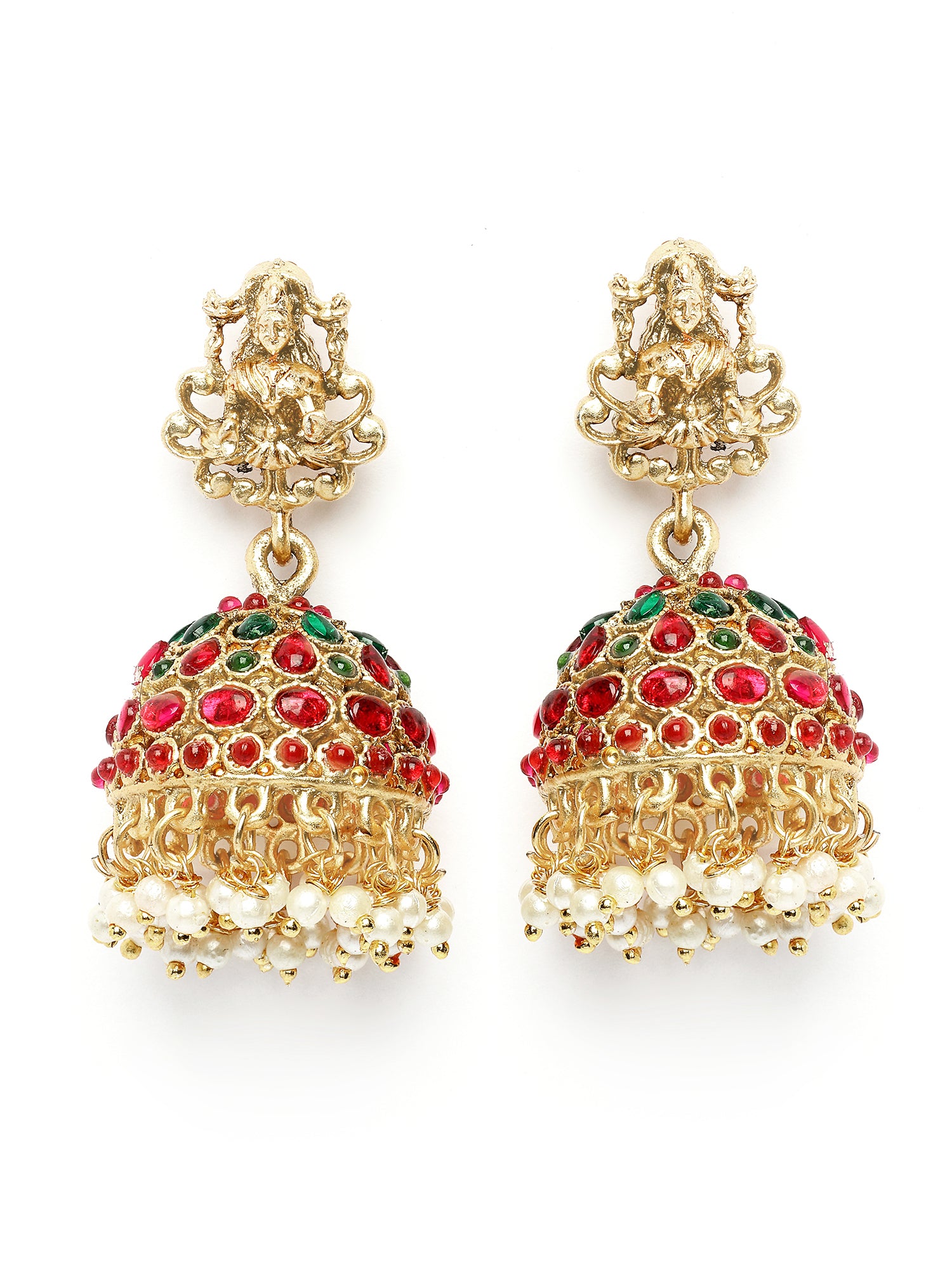 Karatcart Elegant Red and Green Stone Gold Plated Laxmi Mata Design Jhumki Earrings for Women