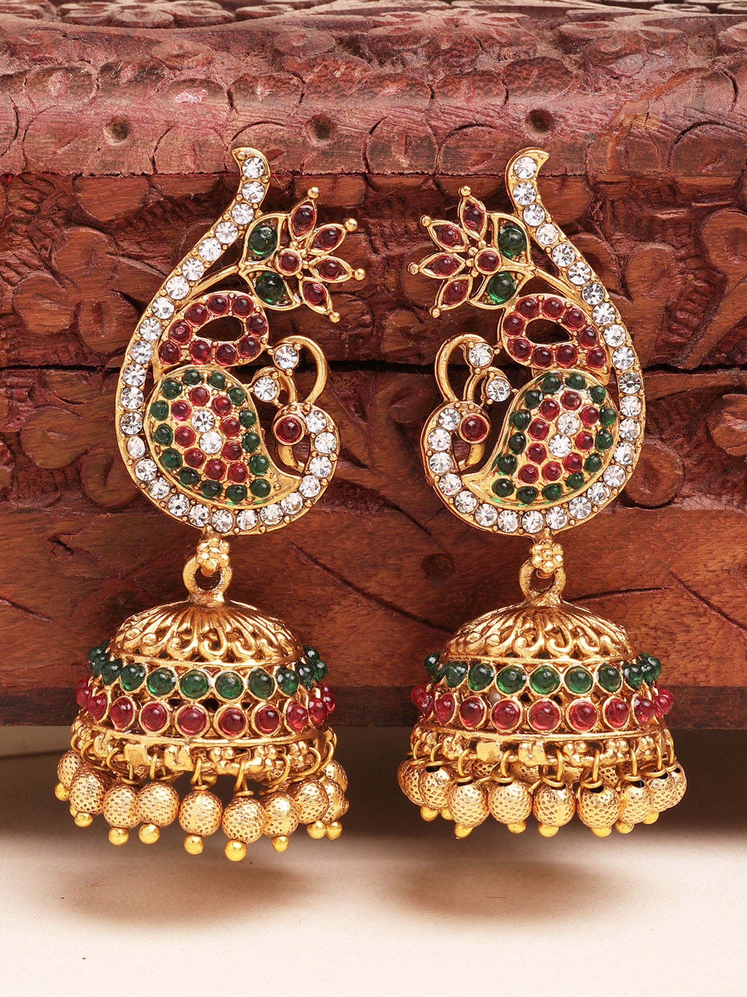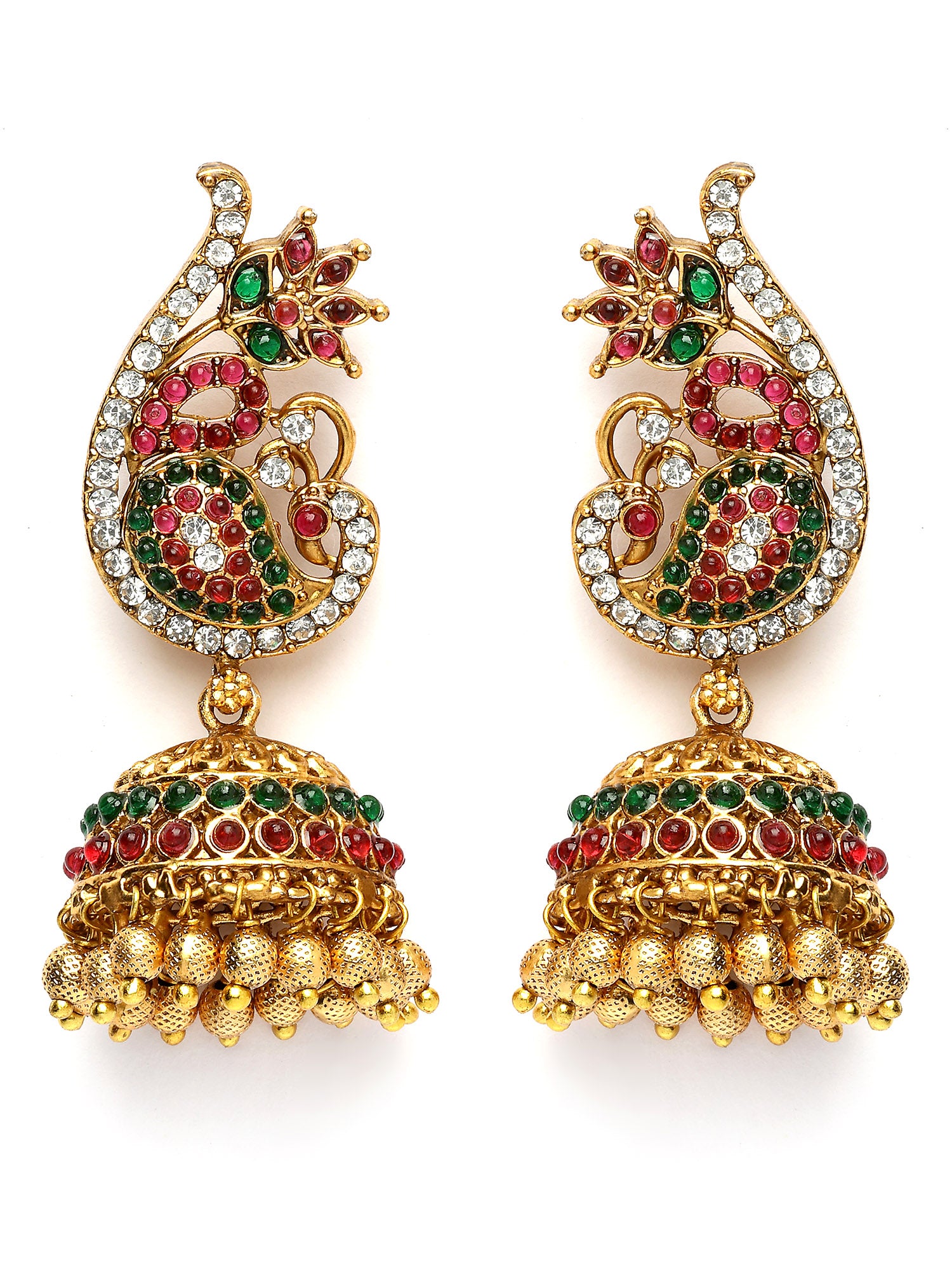 - Karatcart Red and Green Gold Plated Peacock Design Jhumki Earrings for Women. Our products are designed with high-quality material and these products are enhanced with plating that are skin-friendly & with love to reach your heart.