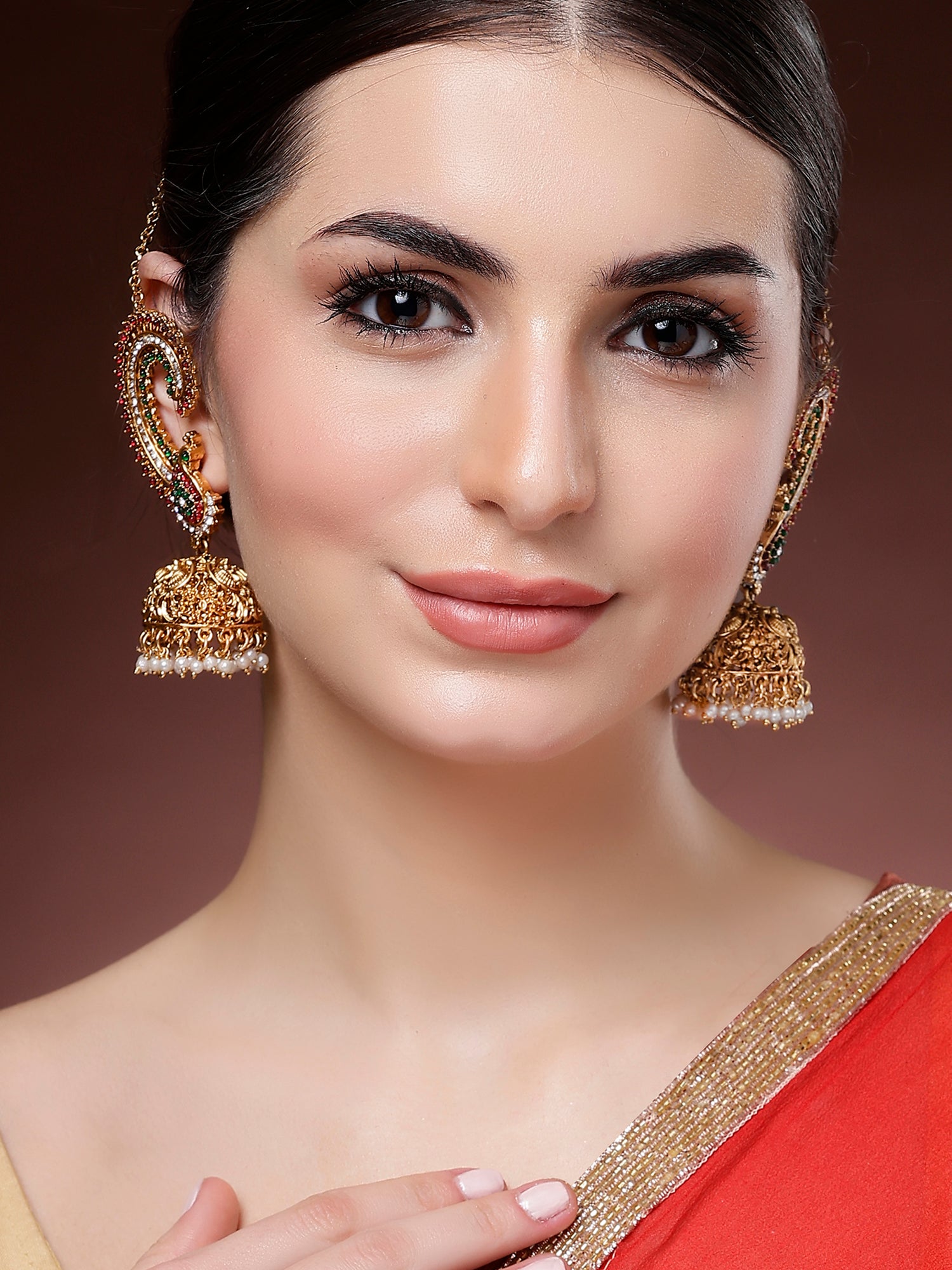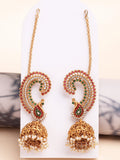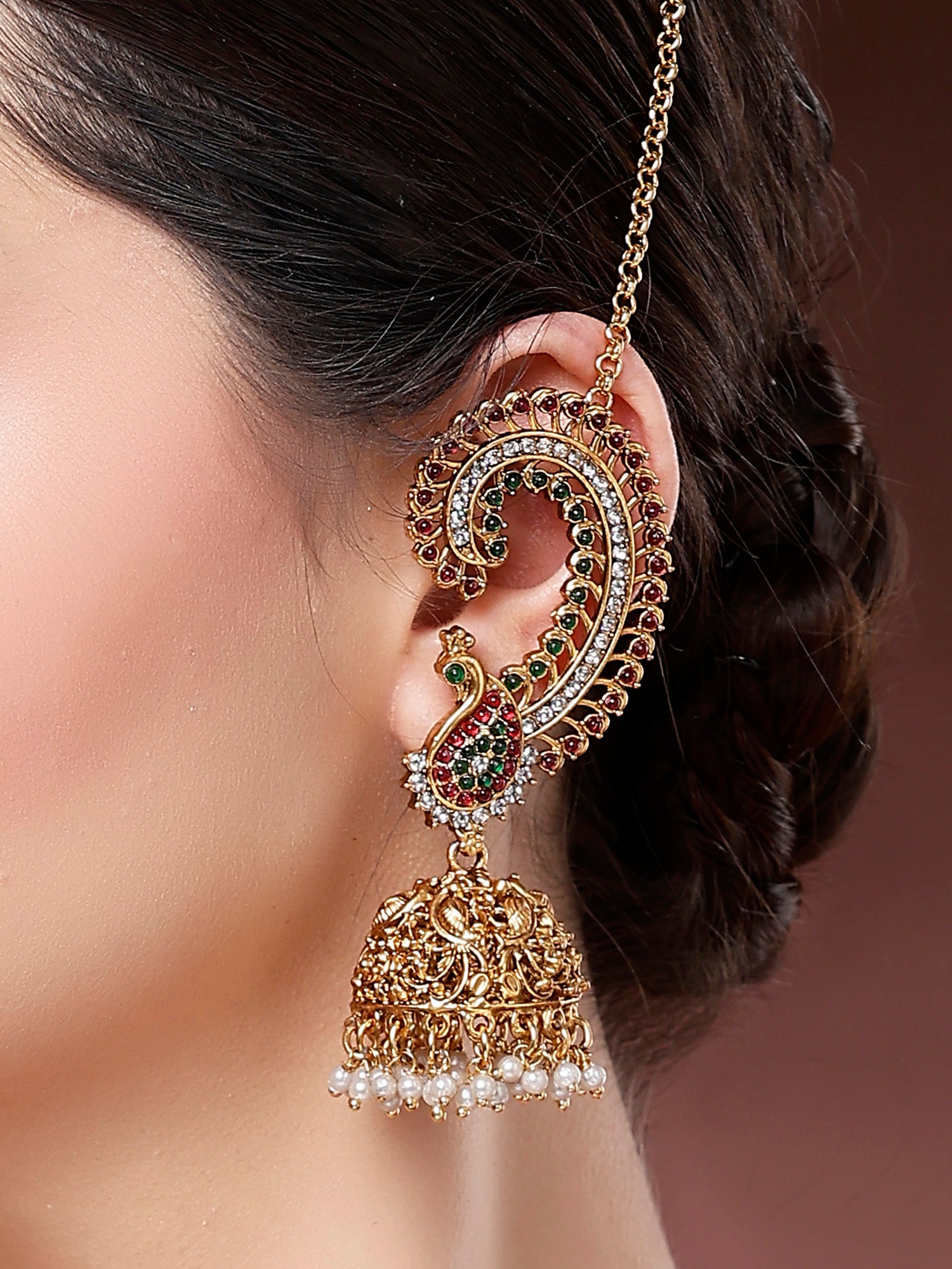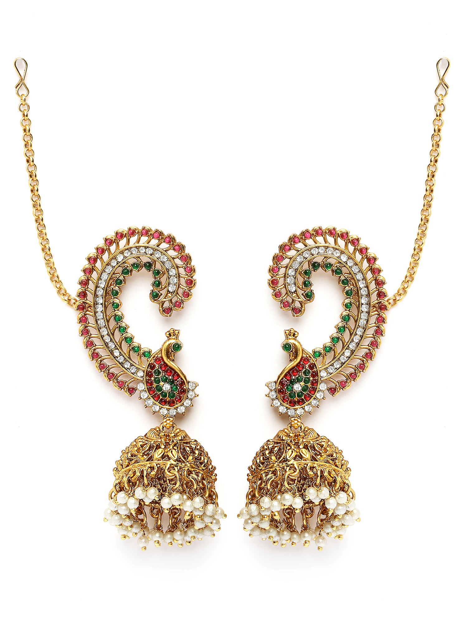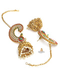Karatcart Royal Spiral Peacock Gold-Plated Jhumka Earrings with Ear Chains