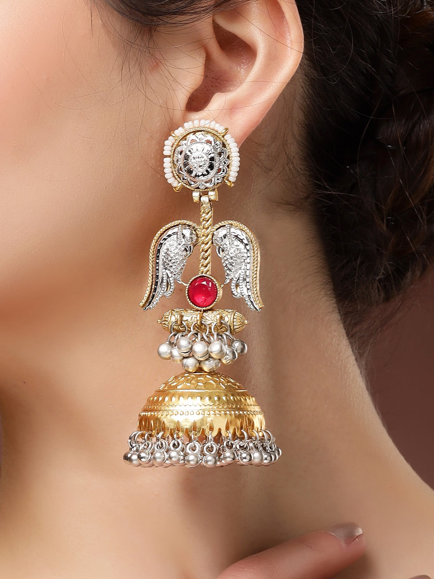 Karatcart Ethnic Gold-Plated Dual-Tone Jhumka Earrings with Silver Bird Motifs & Red Stone
