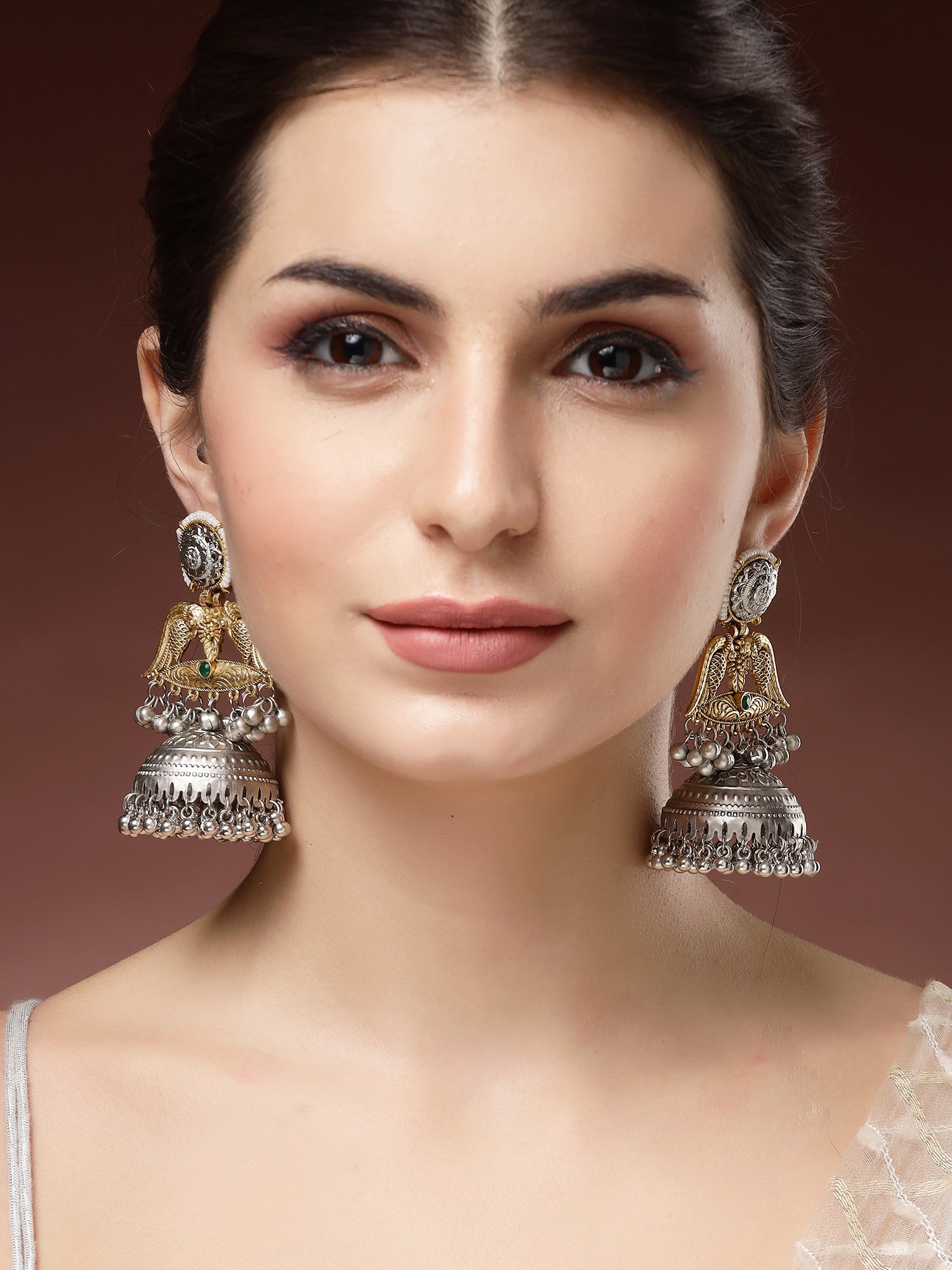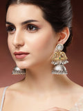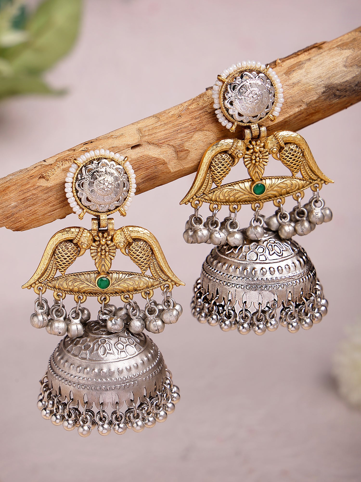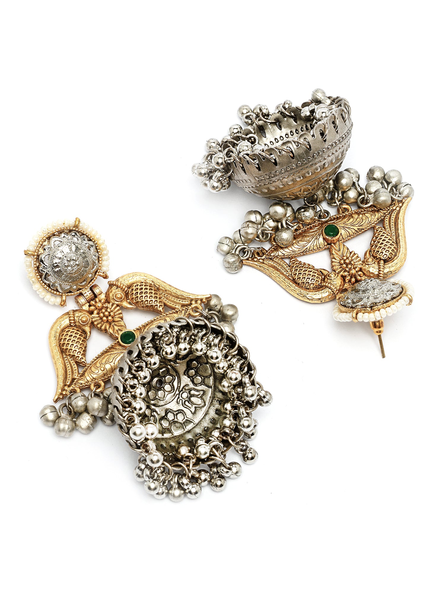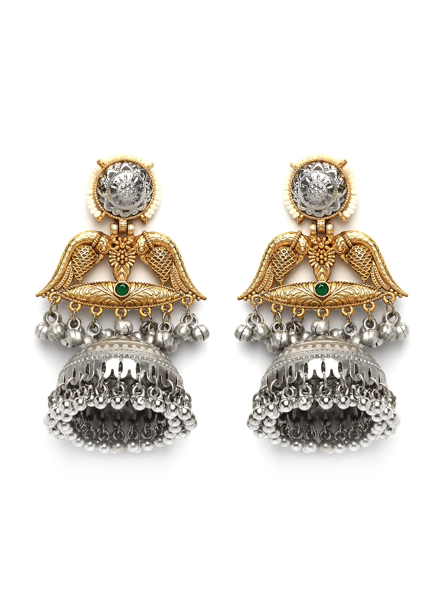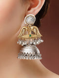 Karatcart Elegant Gold Plated Green Stone Bird Motif Dual Tone Silver Jhumka Earrings for Women