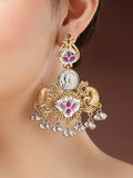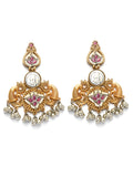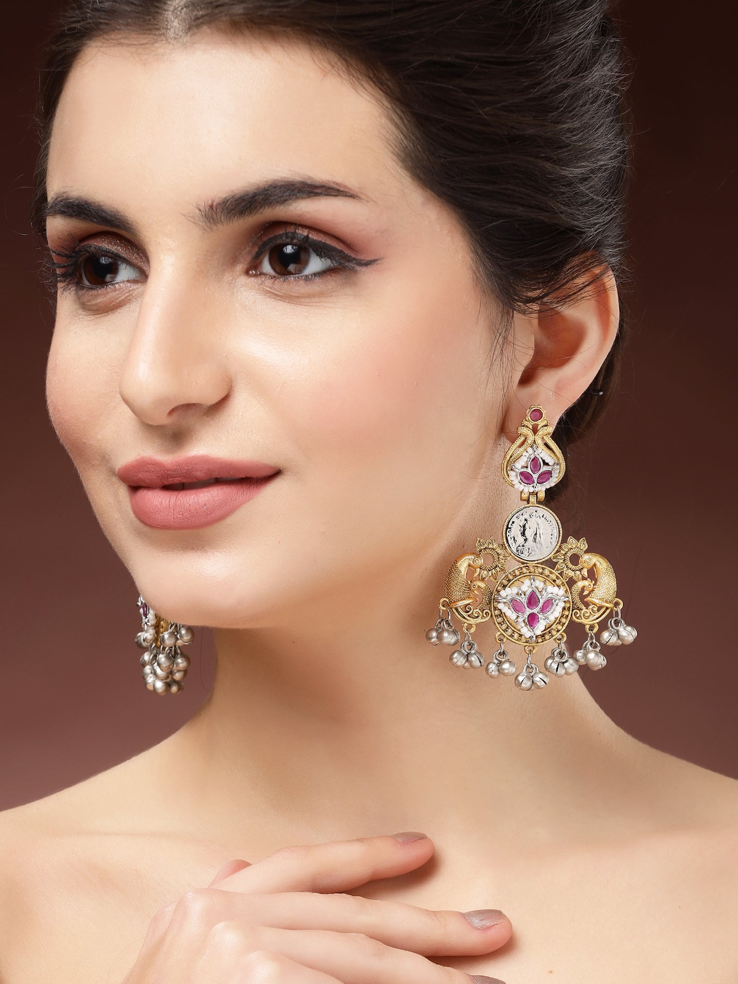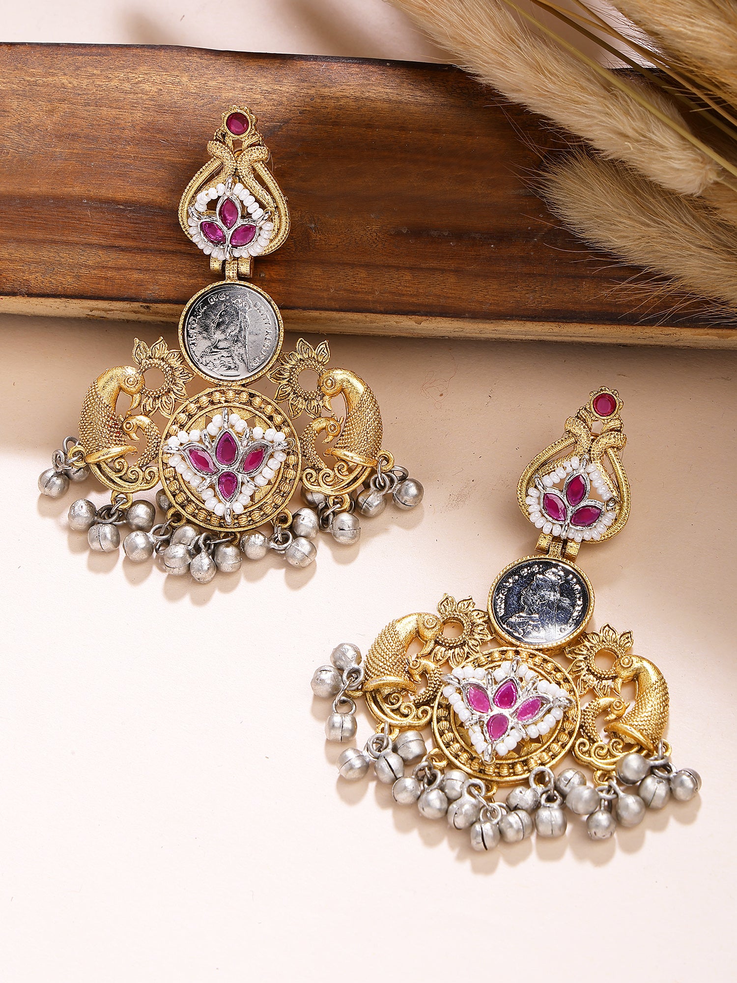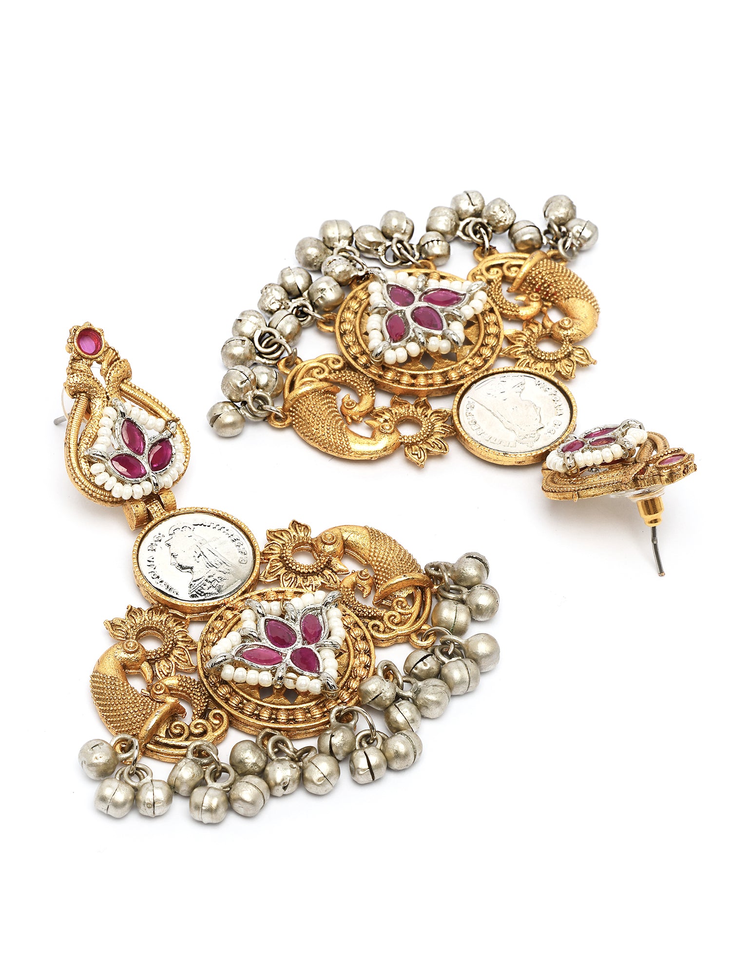 Karatcart Ethnic Gold Plated Red Stone Peacock Motif Lord Shiva Coin Embedded Dangler Earrings