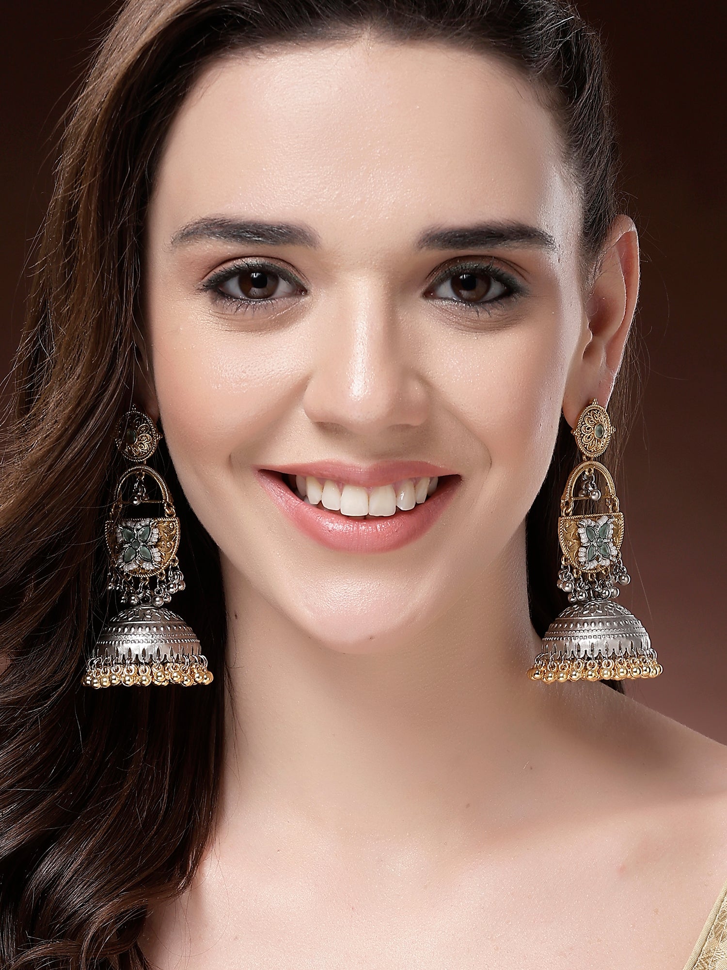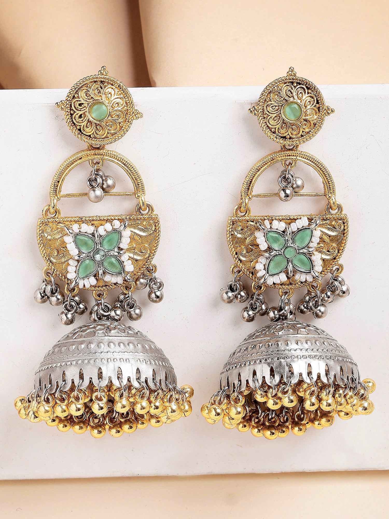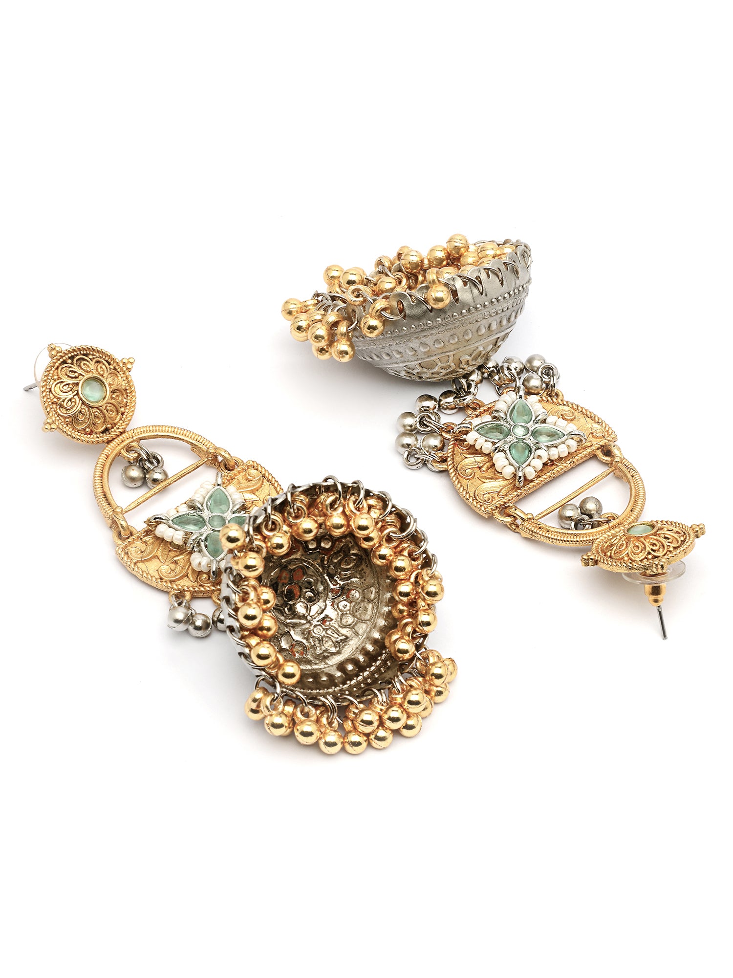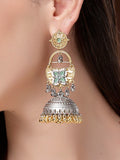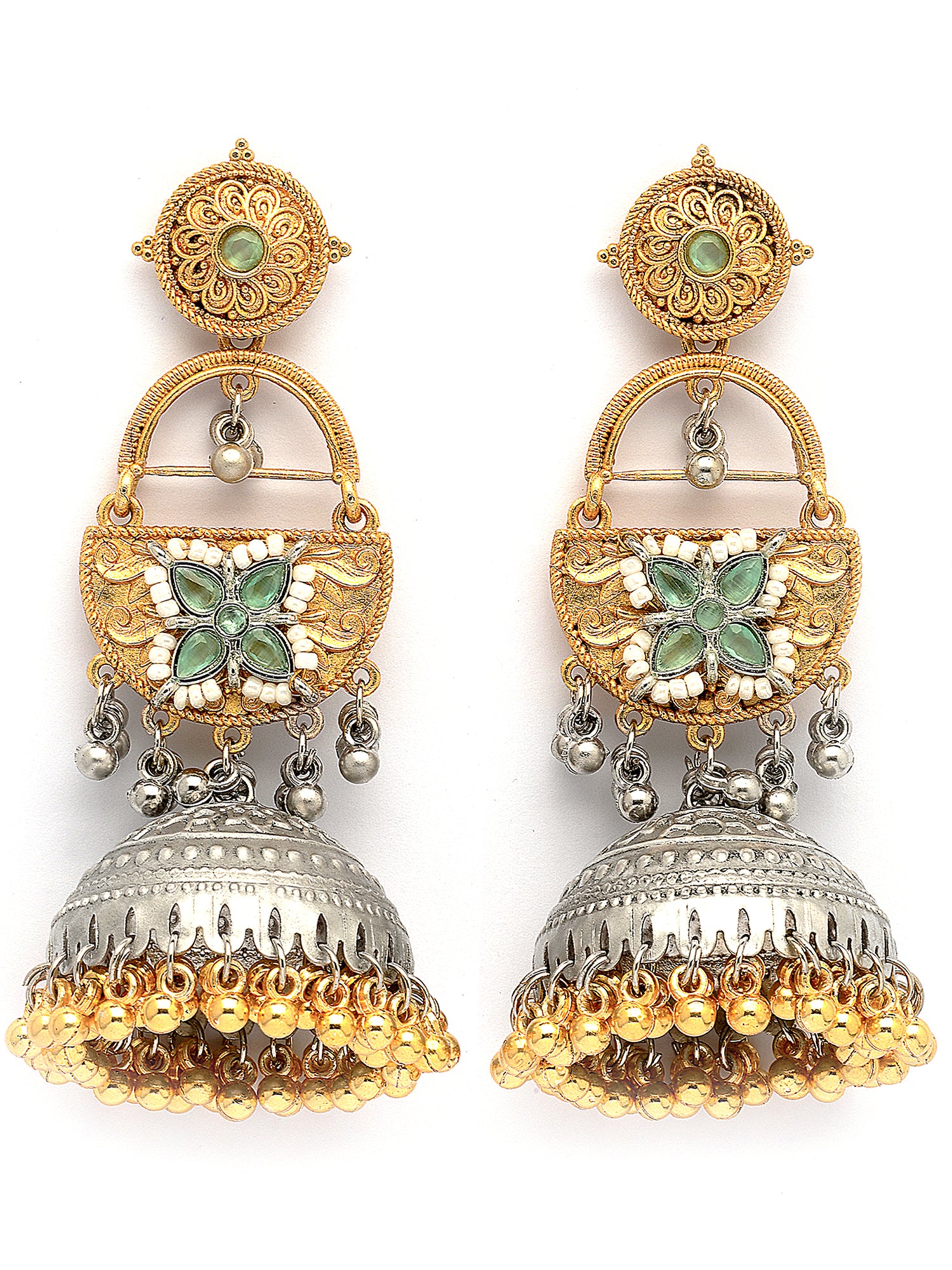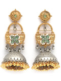 Karatcart Designer Oxidized Silver and Gold Plated Green Floral Motif Dual-Tone Jhumka Earrings