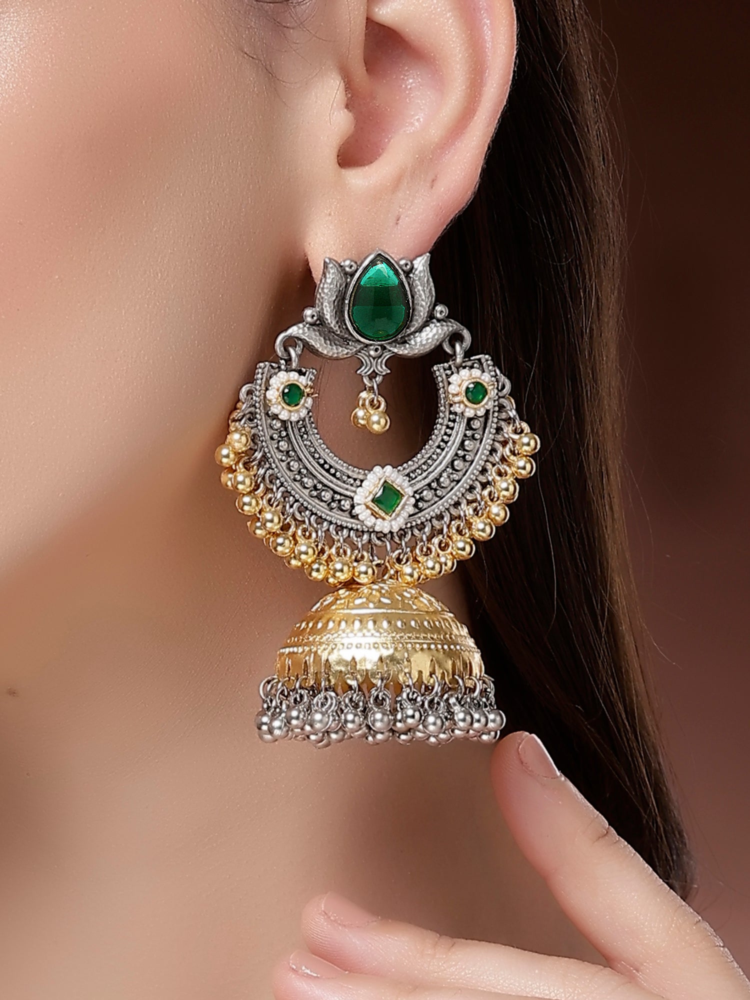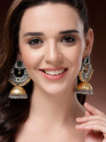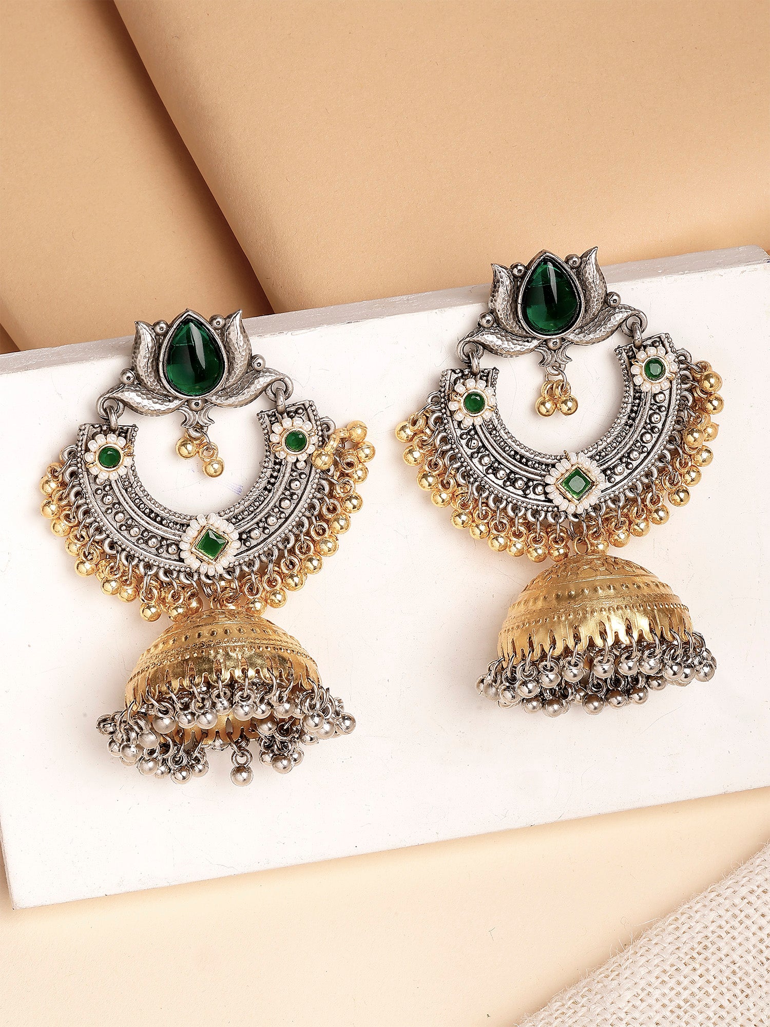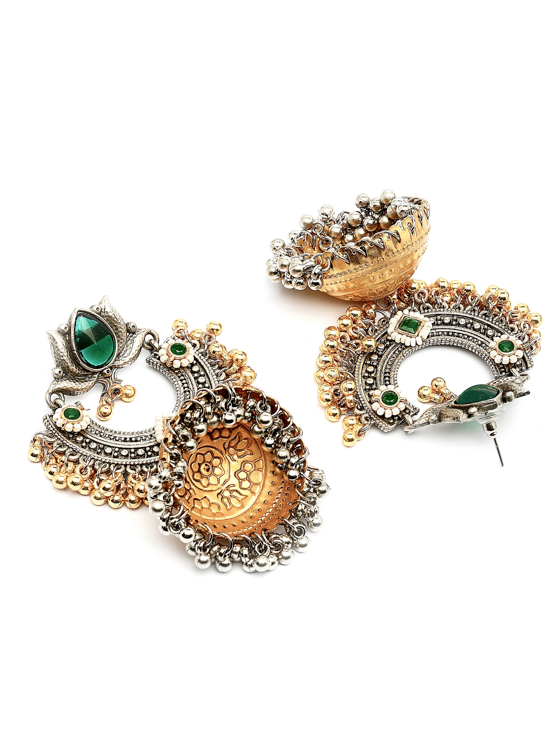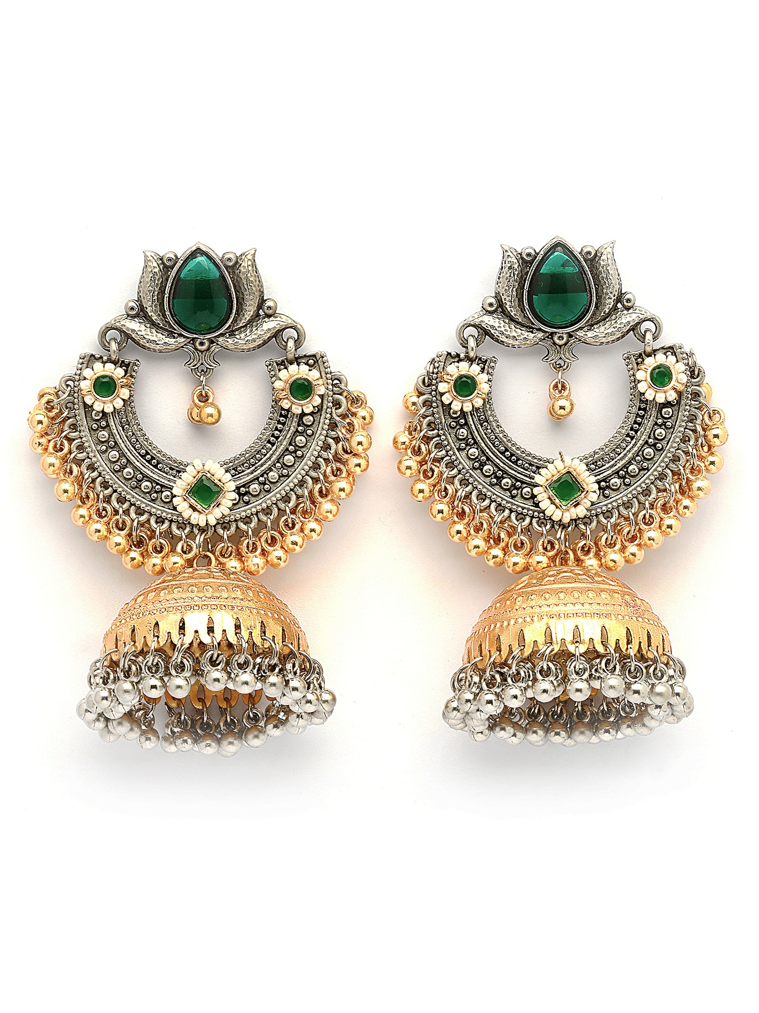 Karatcart Designer Oxidized Silver and Gold Plated Green Lotus Motif Dual-Tone Jhumka Earrings