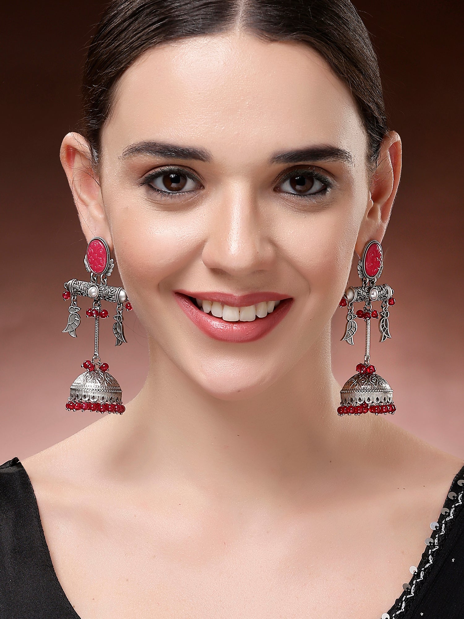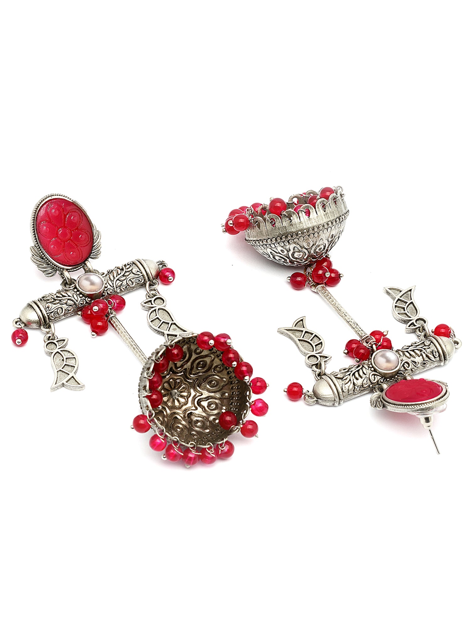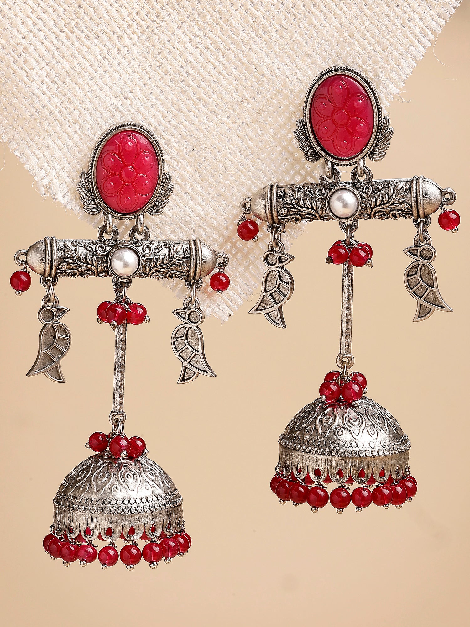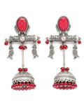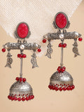 Karatcart Traditional Oxidized Silver Red Carved Stone Jhumka Earrings with Bird Motifs