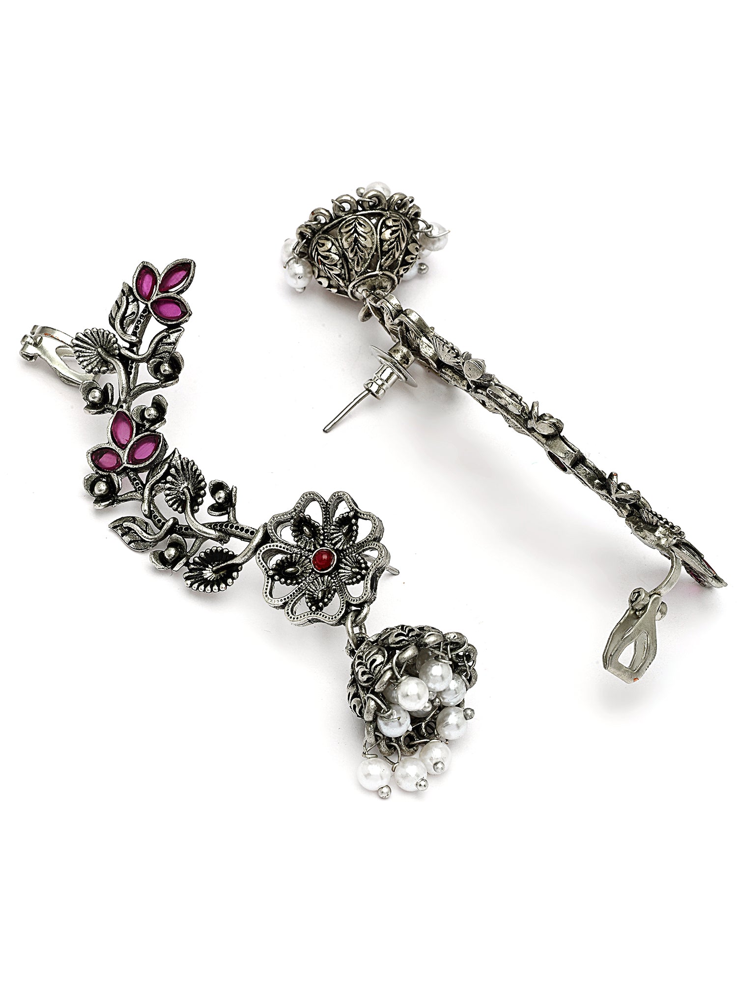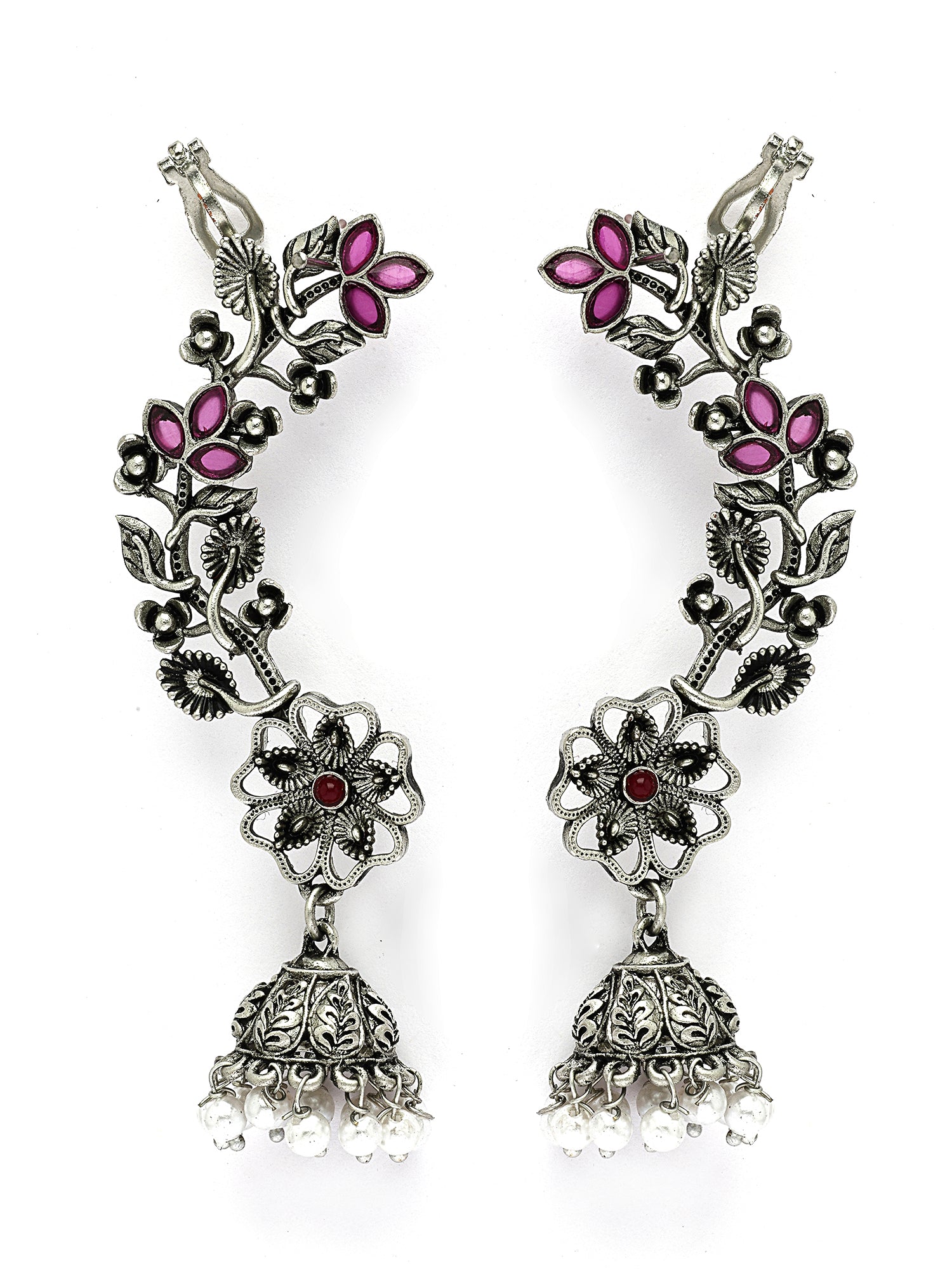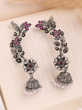 KARATCART Oxidized Silver Designer Floral Jhumki Earrings with Pink Stons for Women