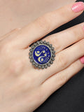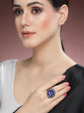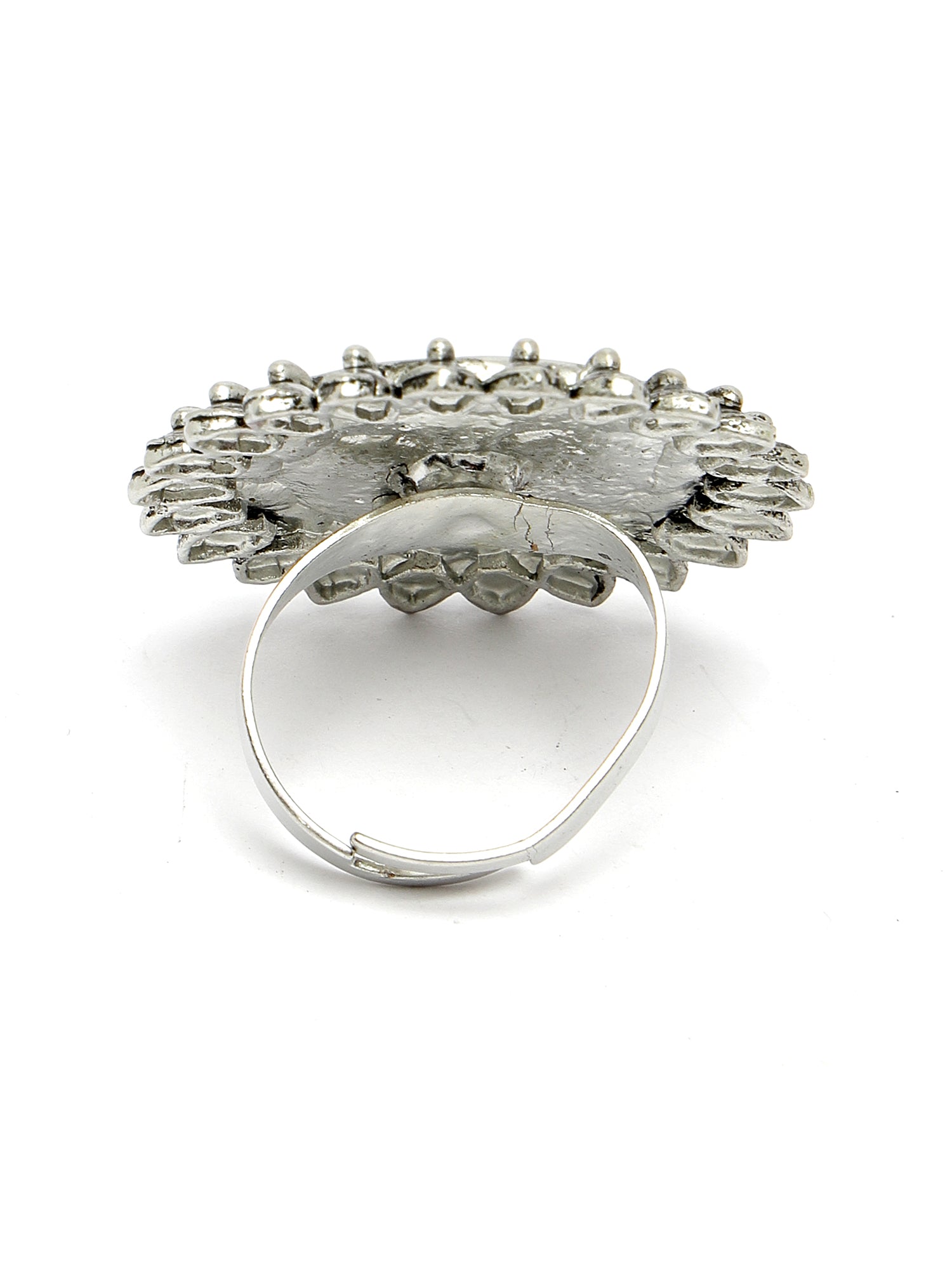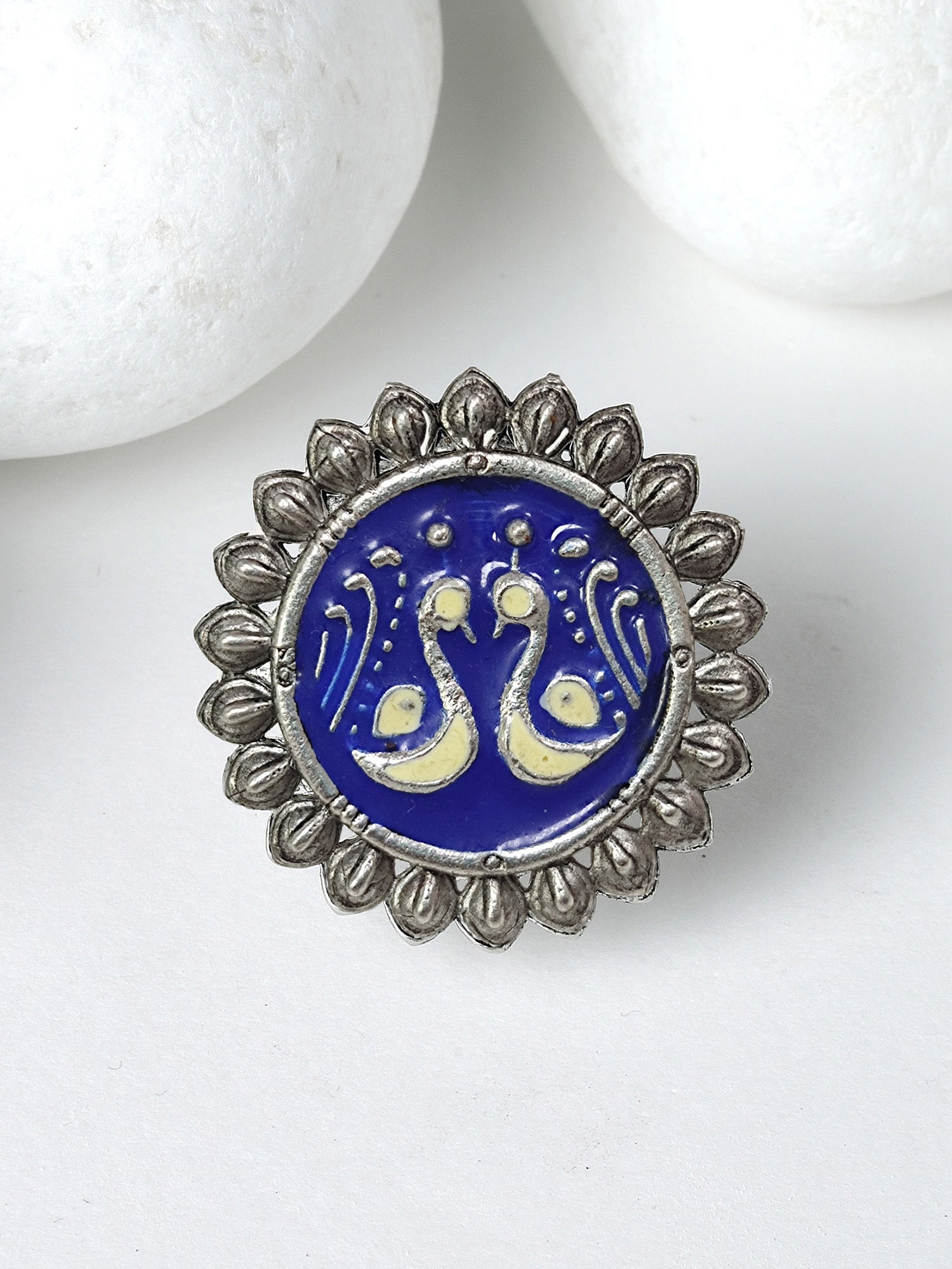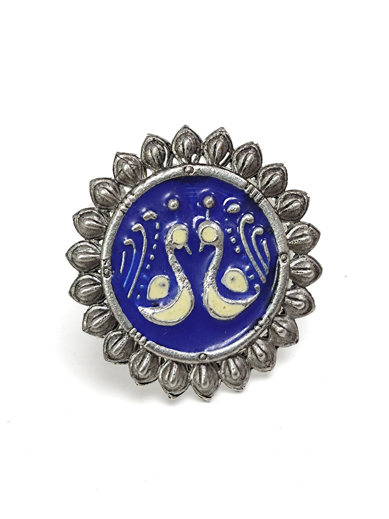 Karatcart Oxidised Silver Peacock Design Blue and Cream Meena Finger Ring for Women