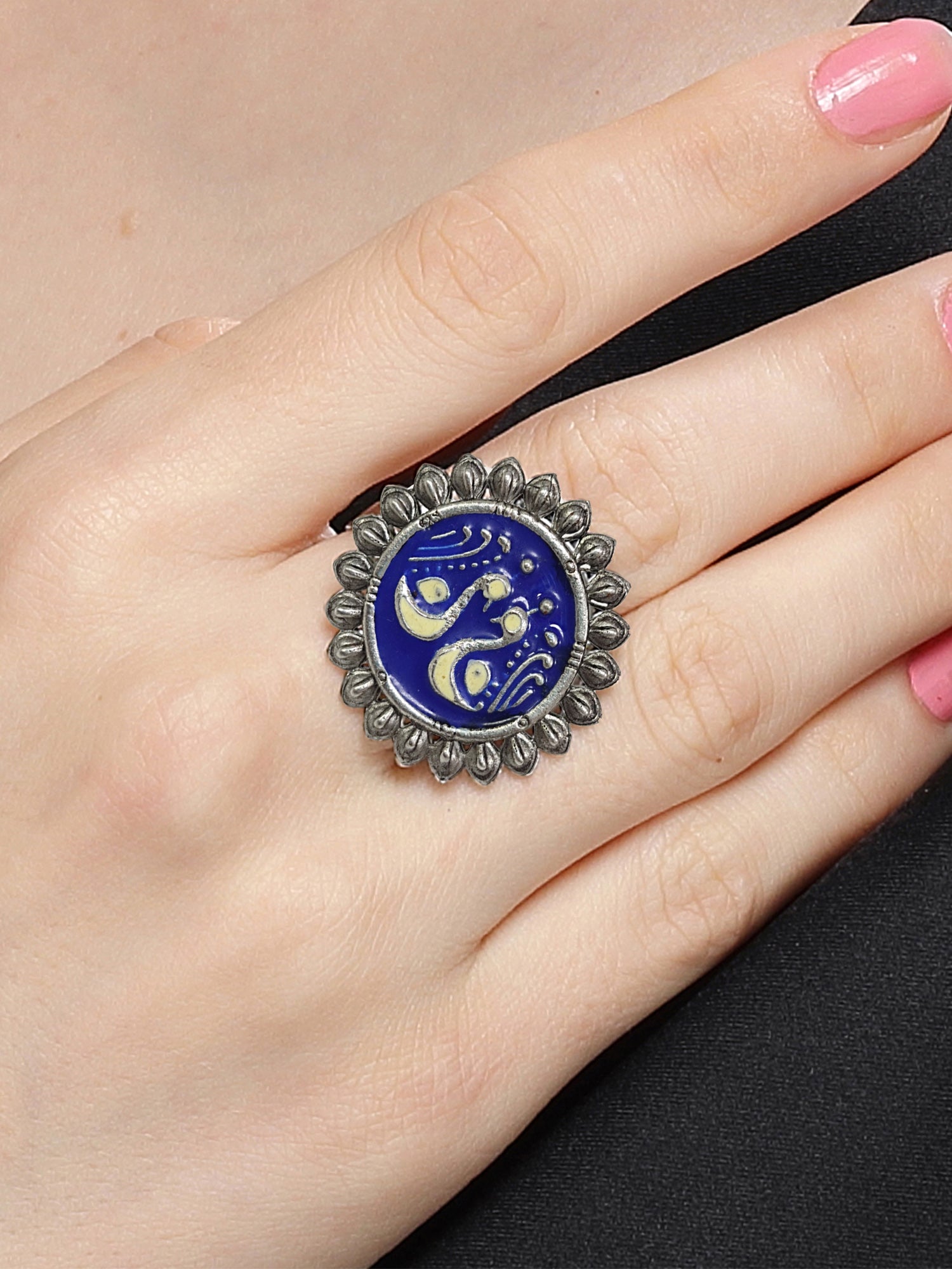 - This is a Blue and Cream Ring by Brand Karatcart which has Enamel stones.This is Oxidised Silver. We at KARATCART understand your desire to look the best on any day & we thrive in making any day an occasion. Every individual at Karatcart carries a passion for jewellery and it reflects in our beautiful designs as well as in our breathtaking craftsmanship. We create unique jewellery so you can make heads turn..