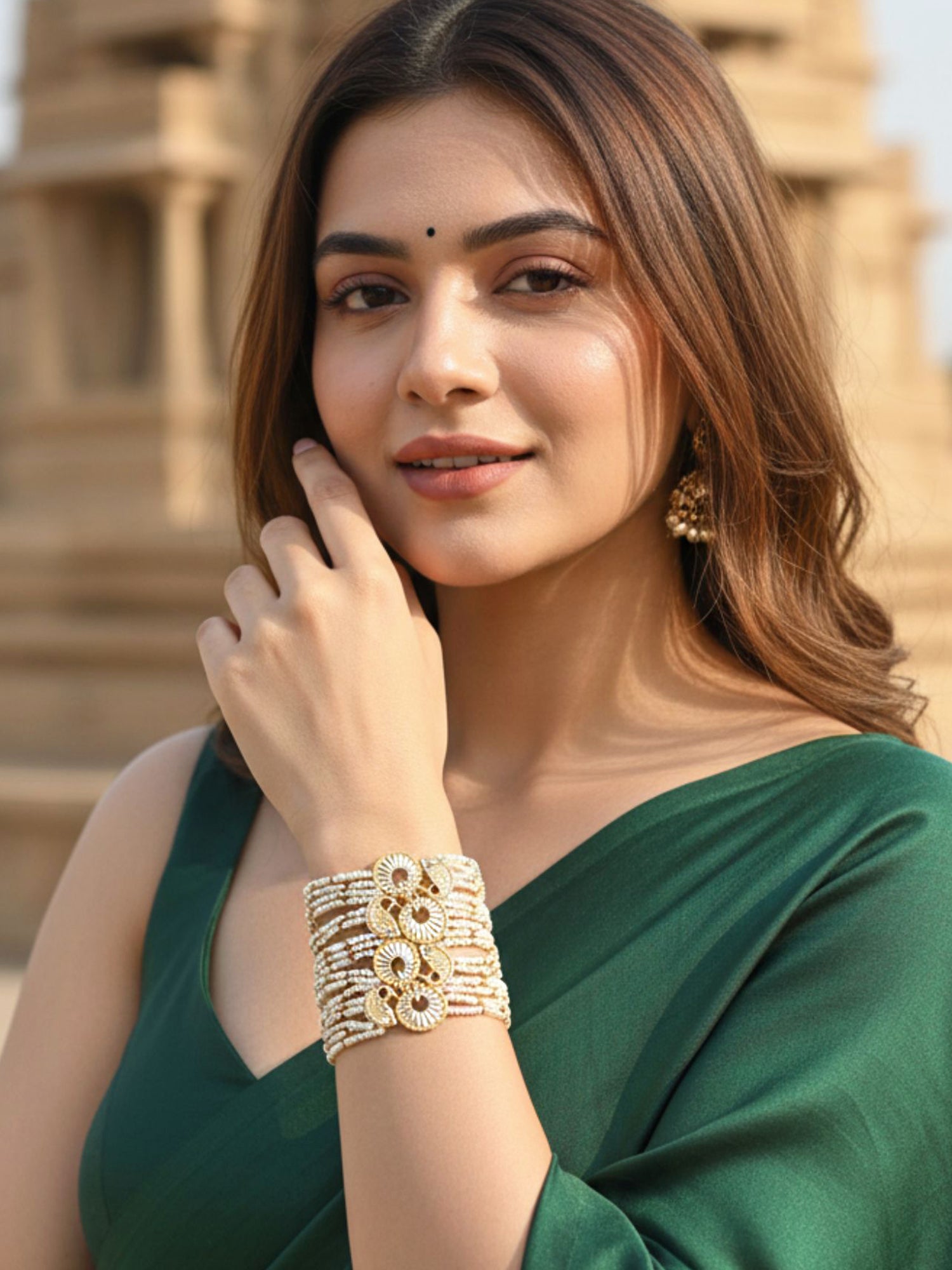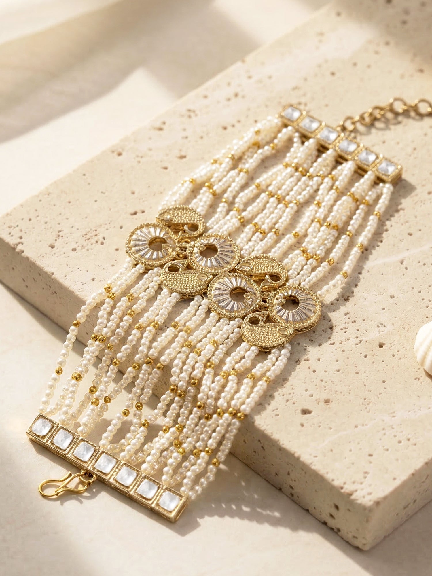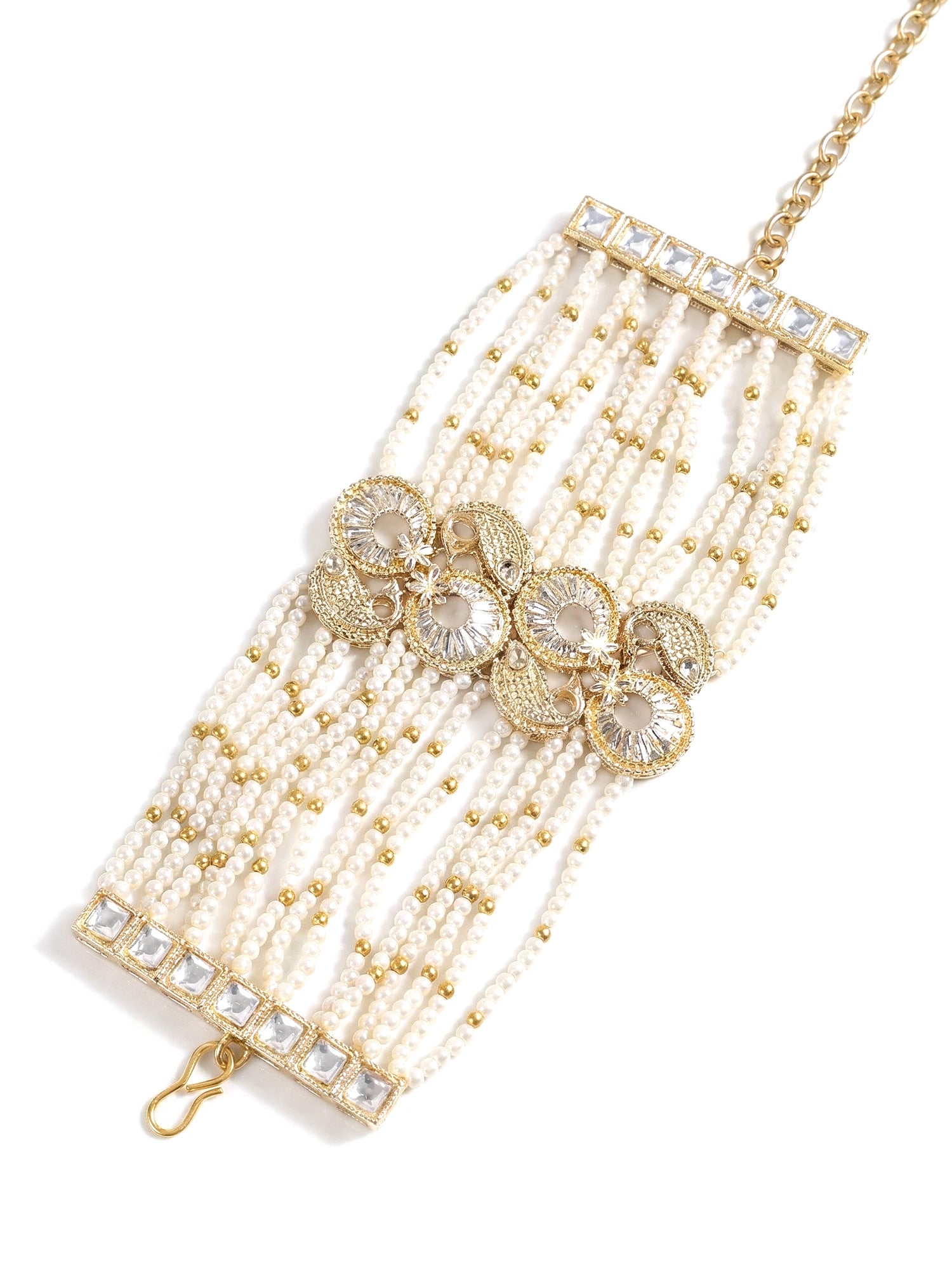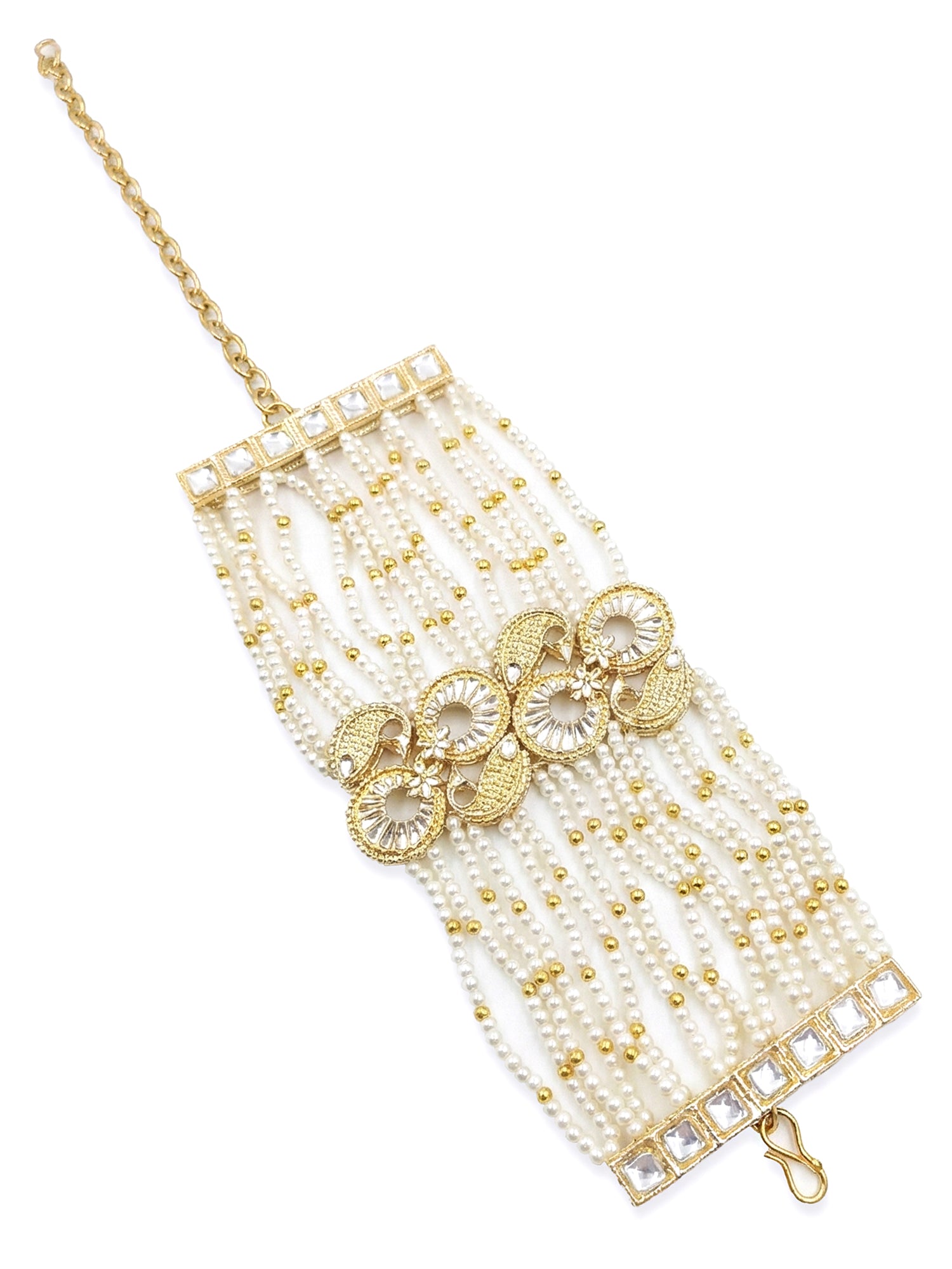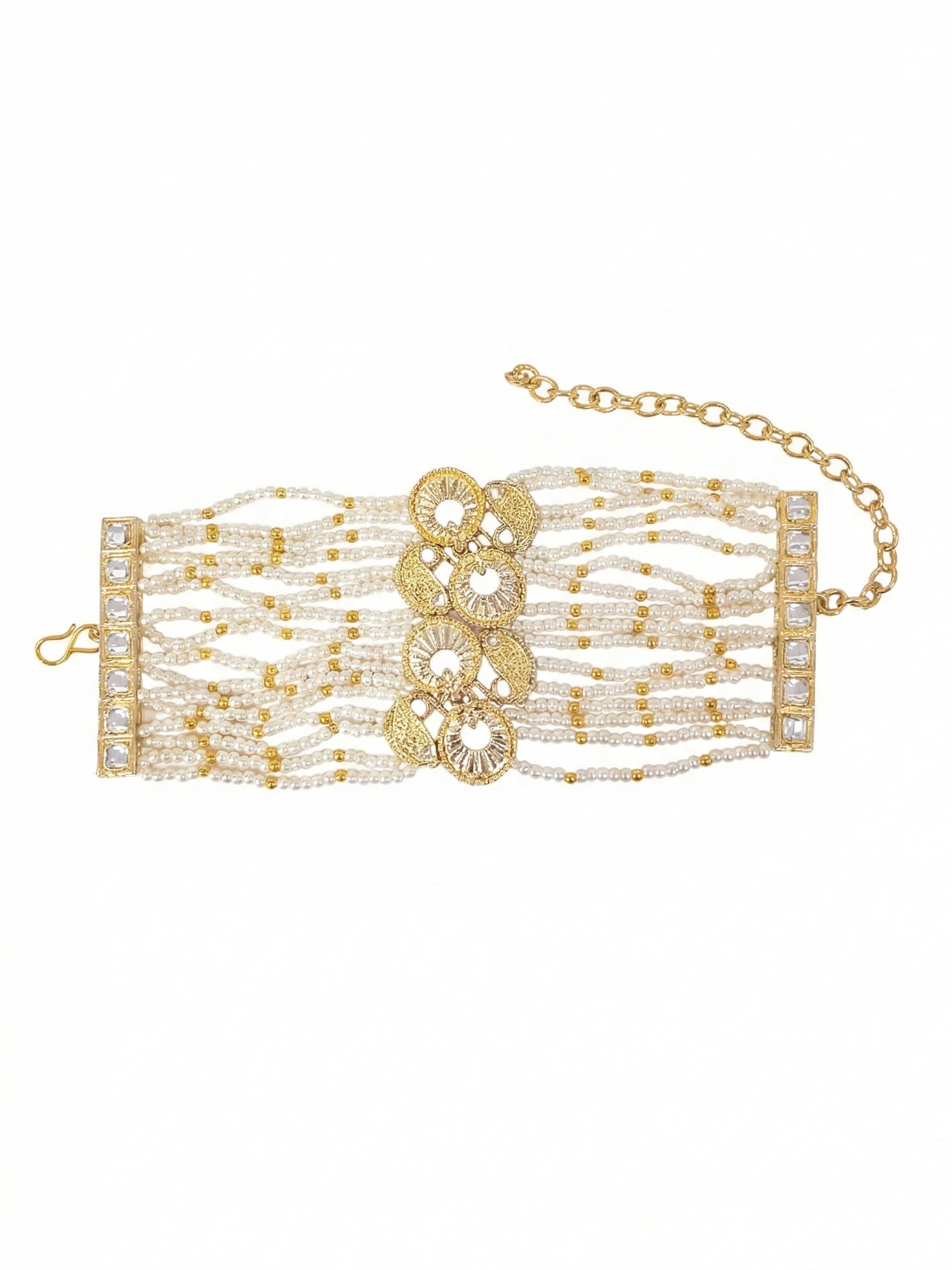 KARATCART Designer Gold-Plated Pearl Beaded Fish Motif Kundan Bracelet for Women