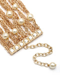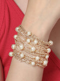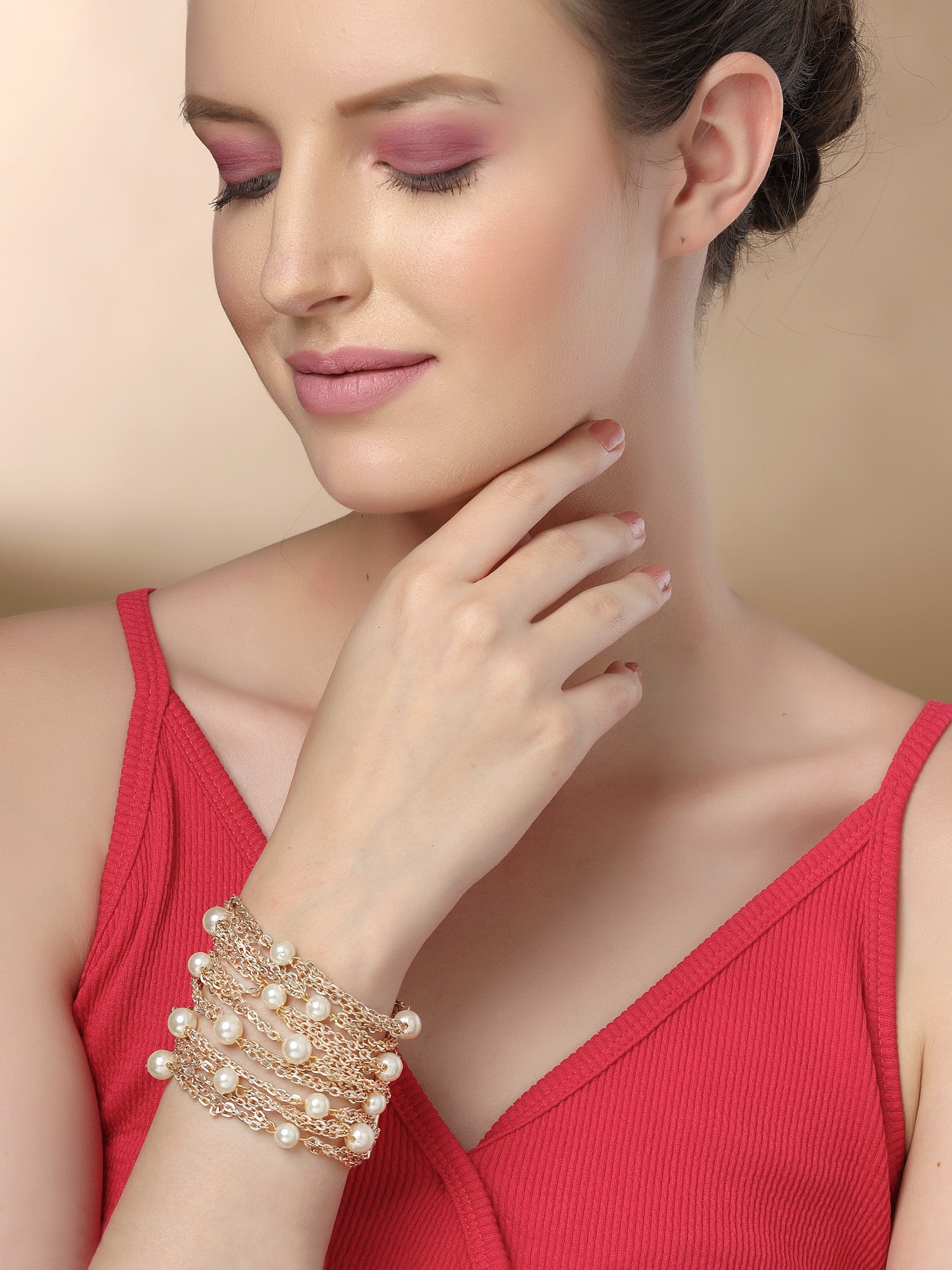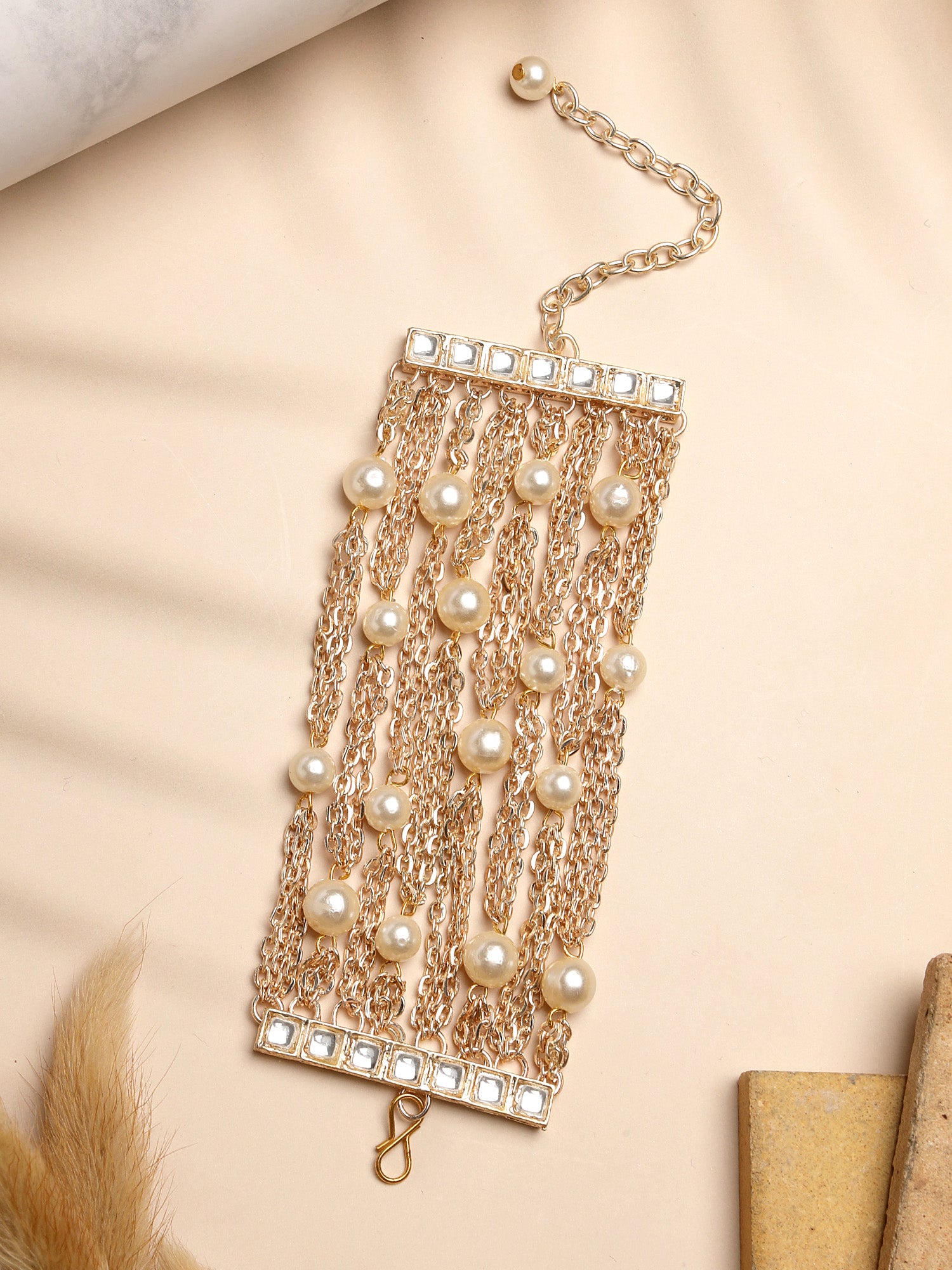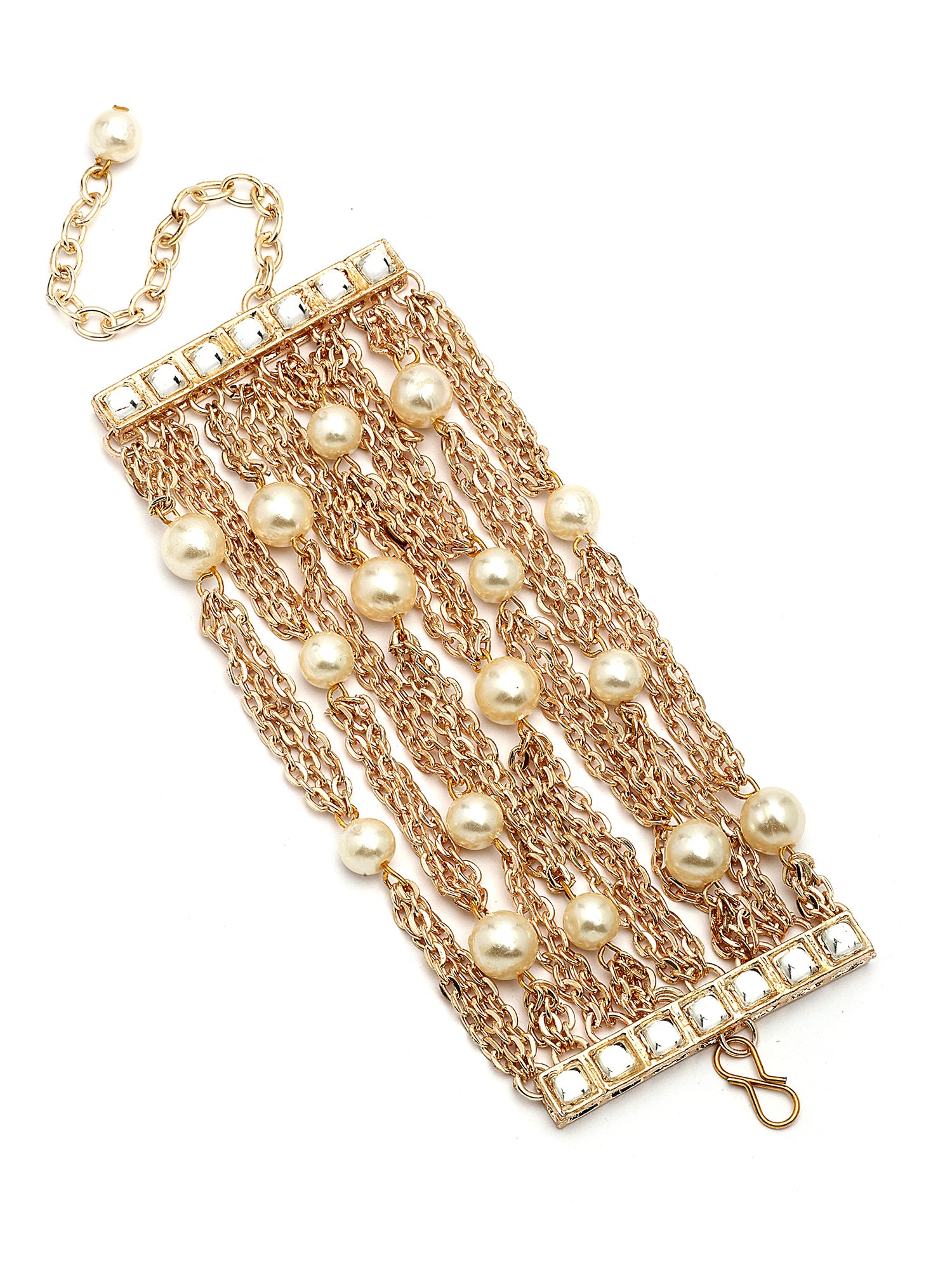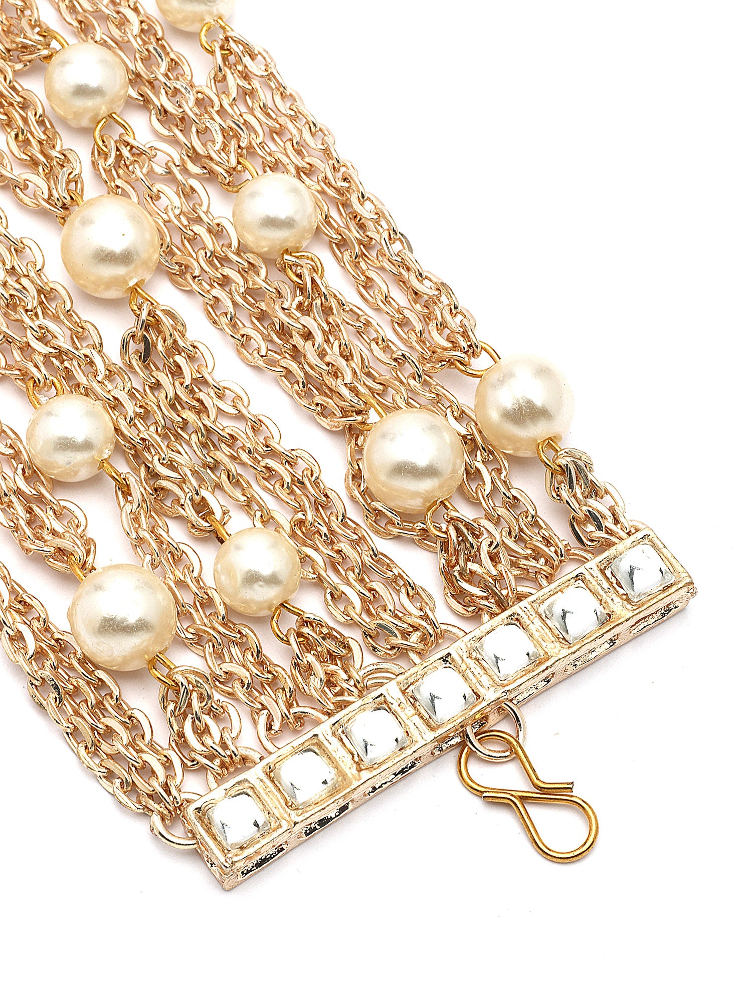 Karatcart Gold Plated Kundan Multi-Layered Pearl Bracelet With Adjustable Chain Design for Women