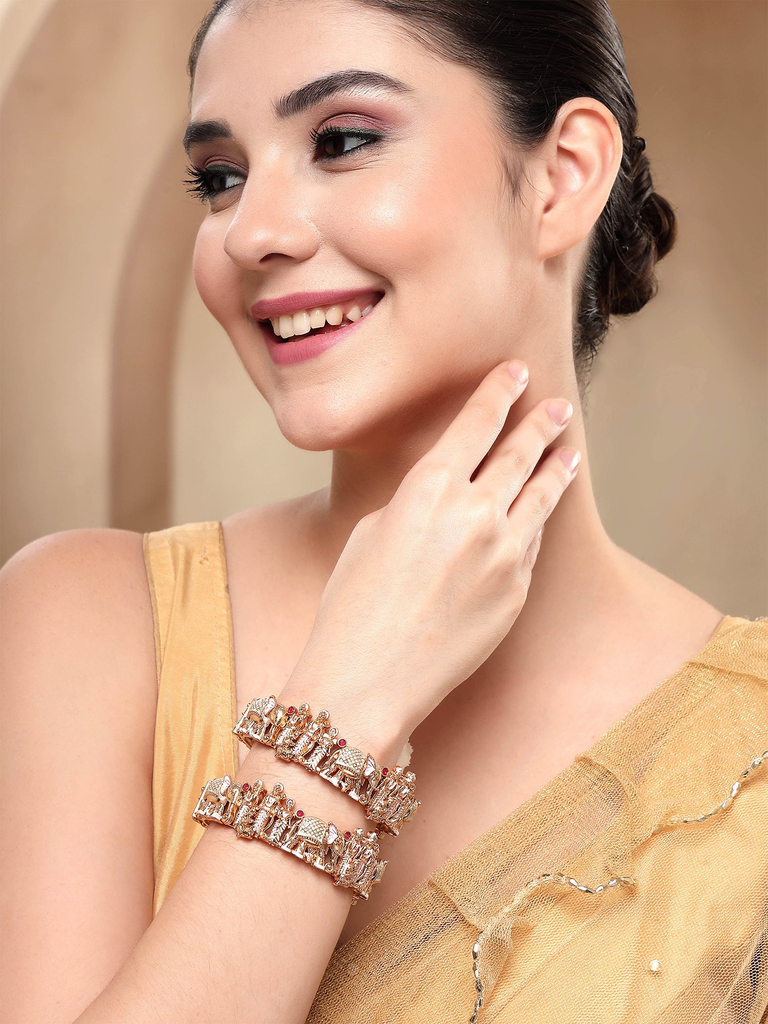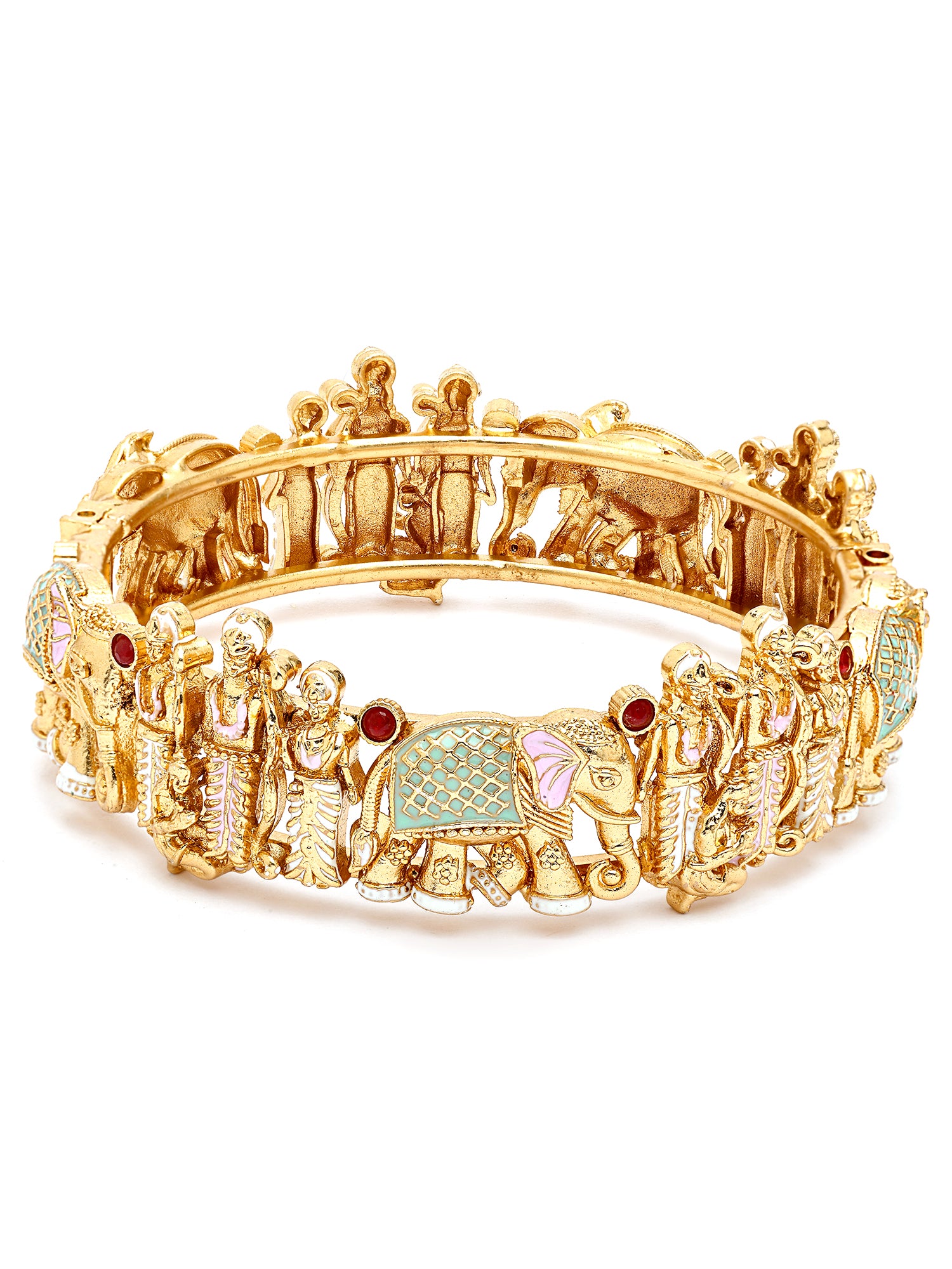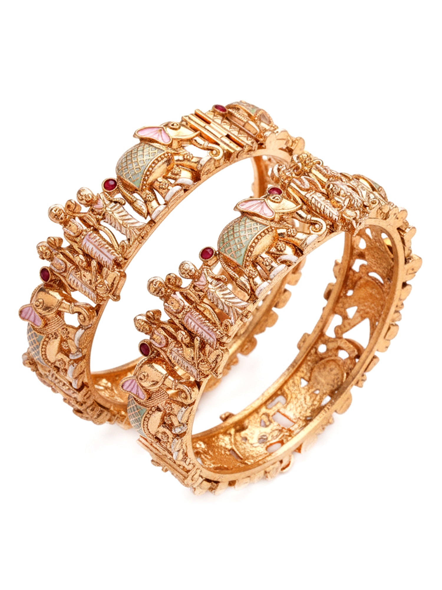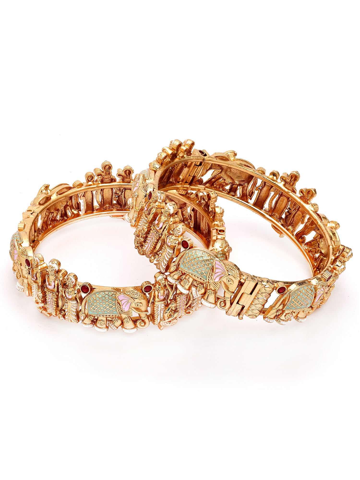 KARATCART Traditional Lime Green and Pink Enamel Shri Ram Motif Gold-Plated Bangles for Women