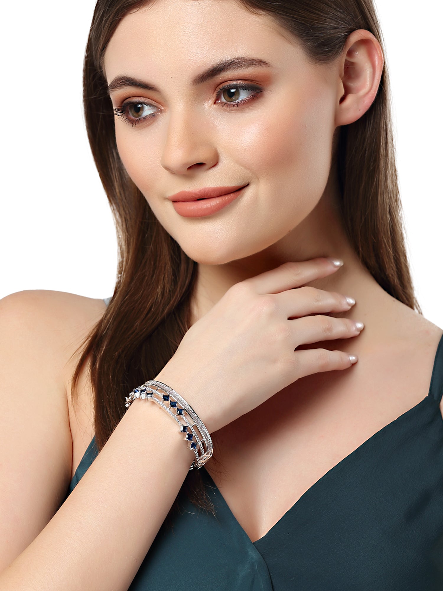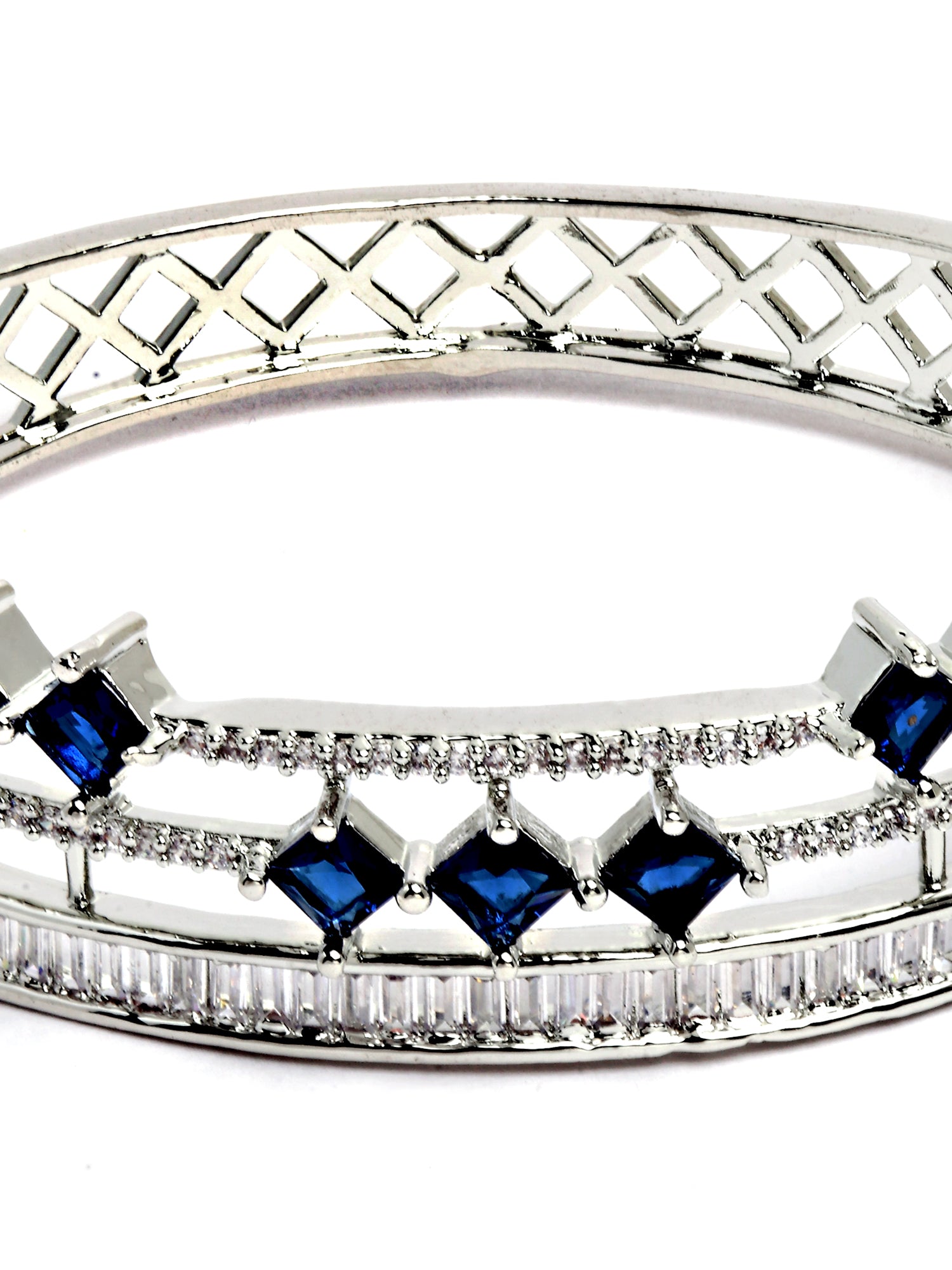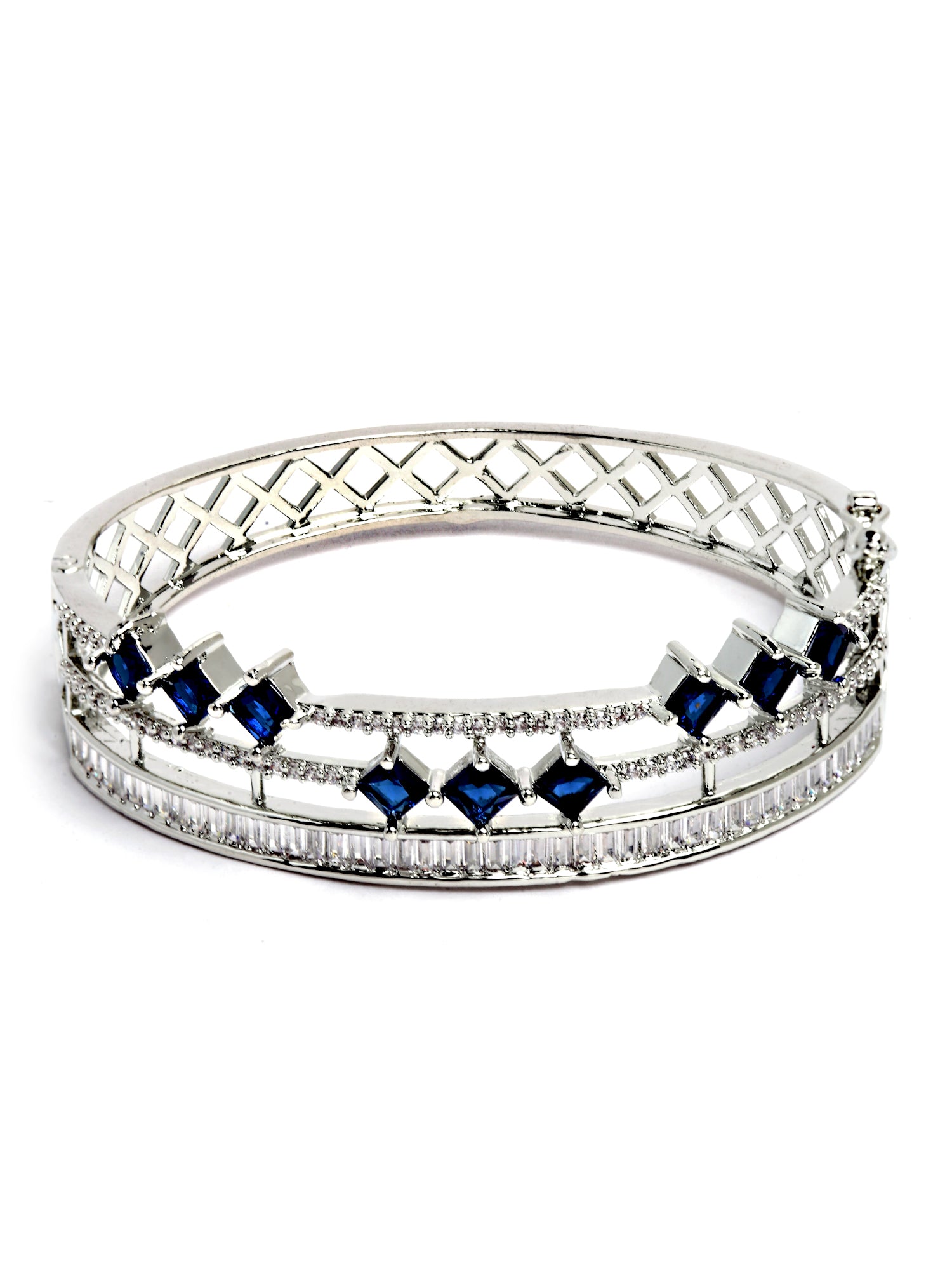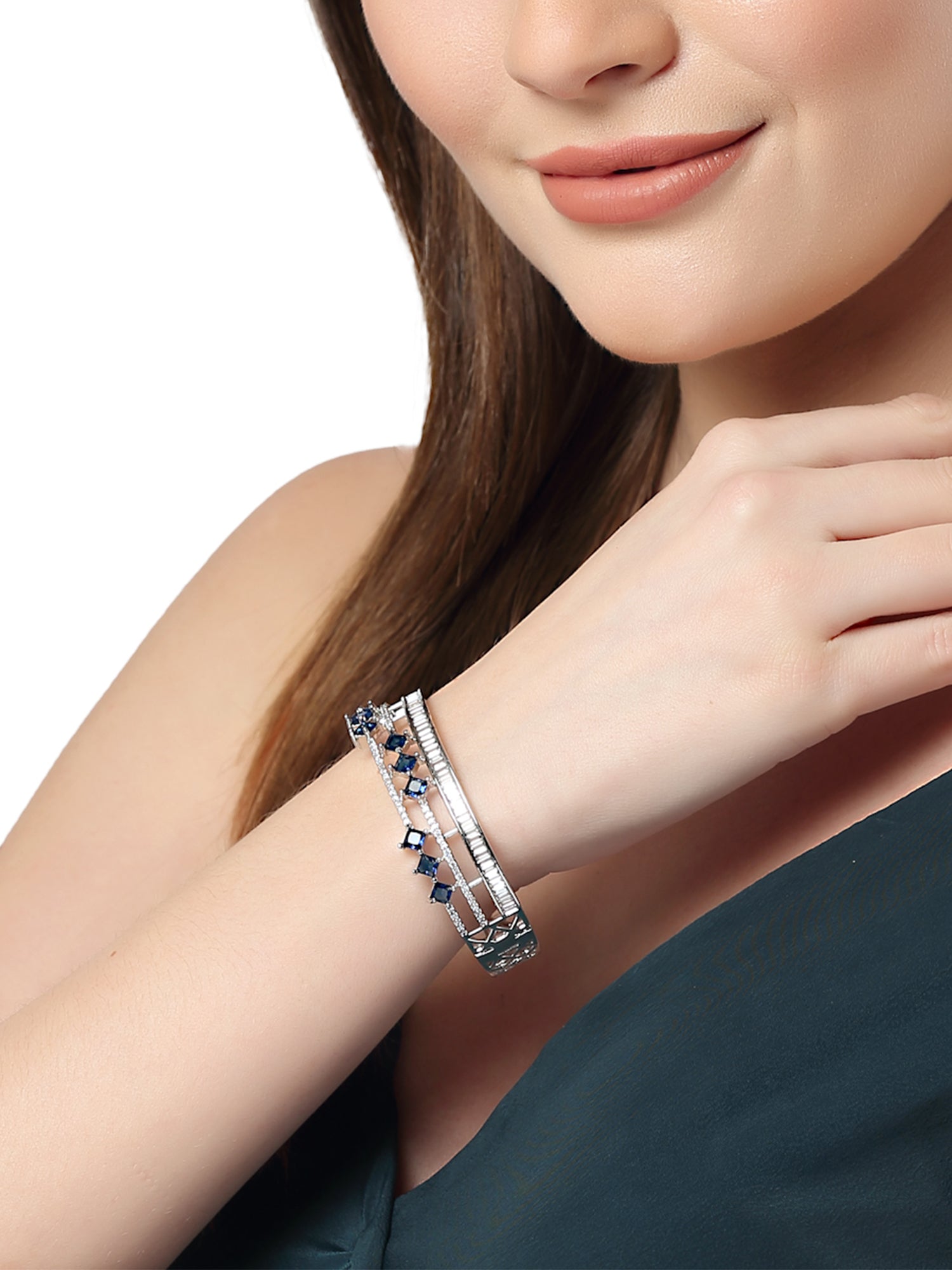 - Karatcart Silver Tone Blue American Diamond Studded Bracelet for Women. Our products are designed with high-quality material and these products are enhanced with plating that are skin-friendly & with love to reach your heart.