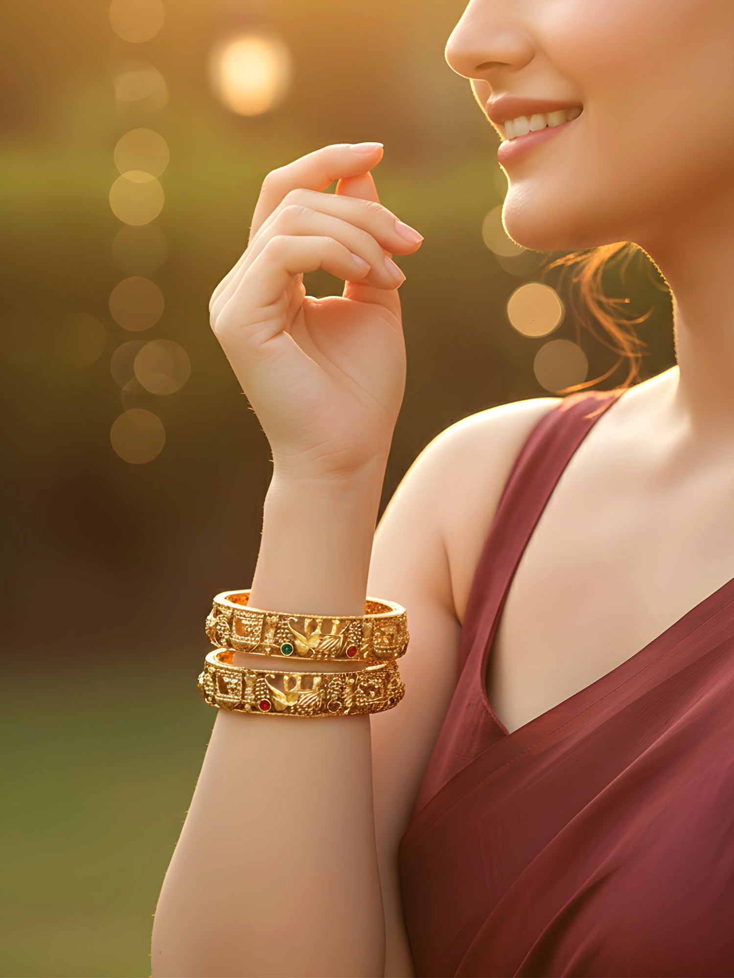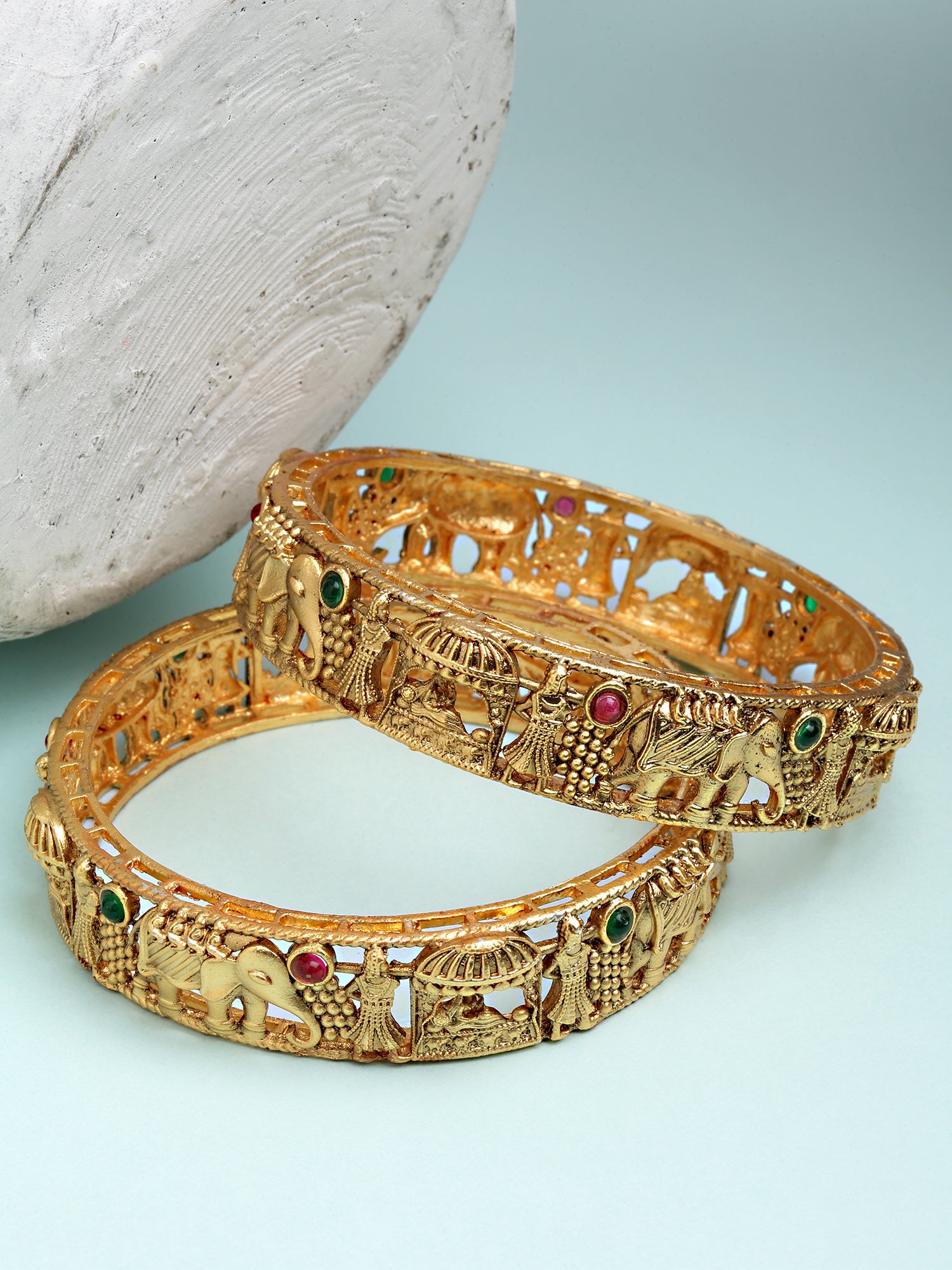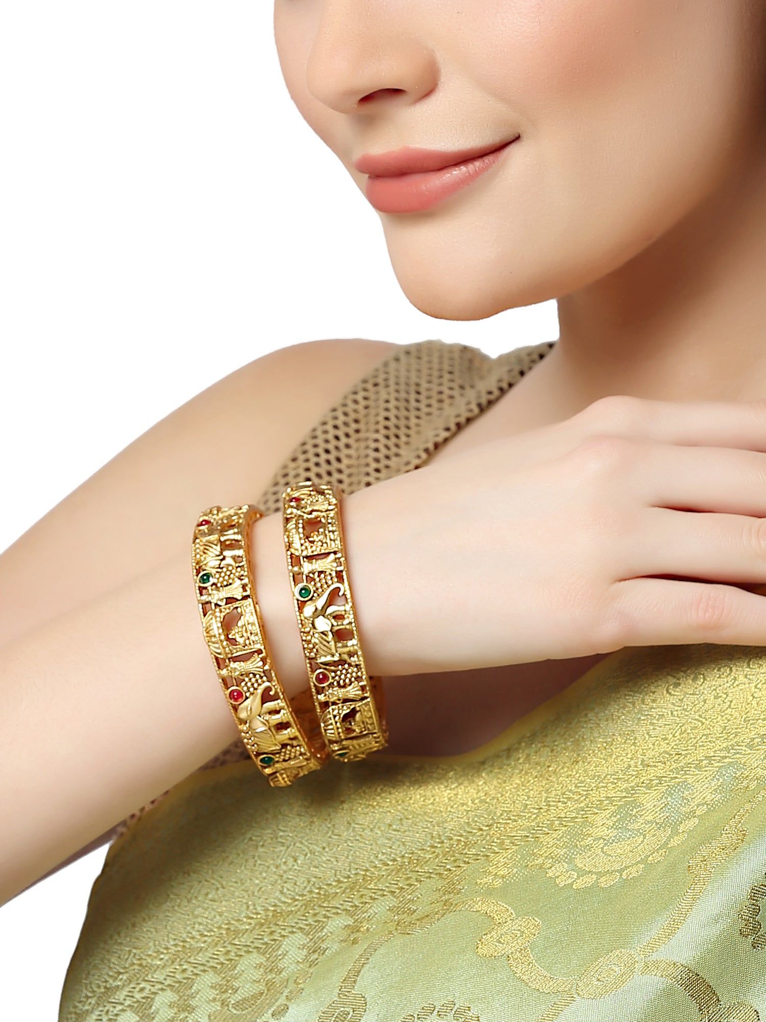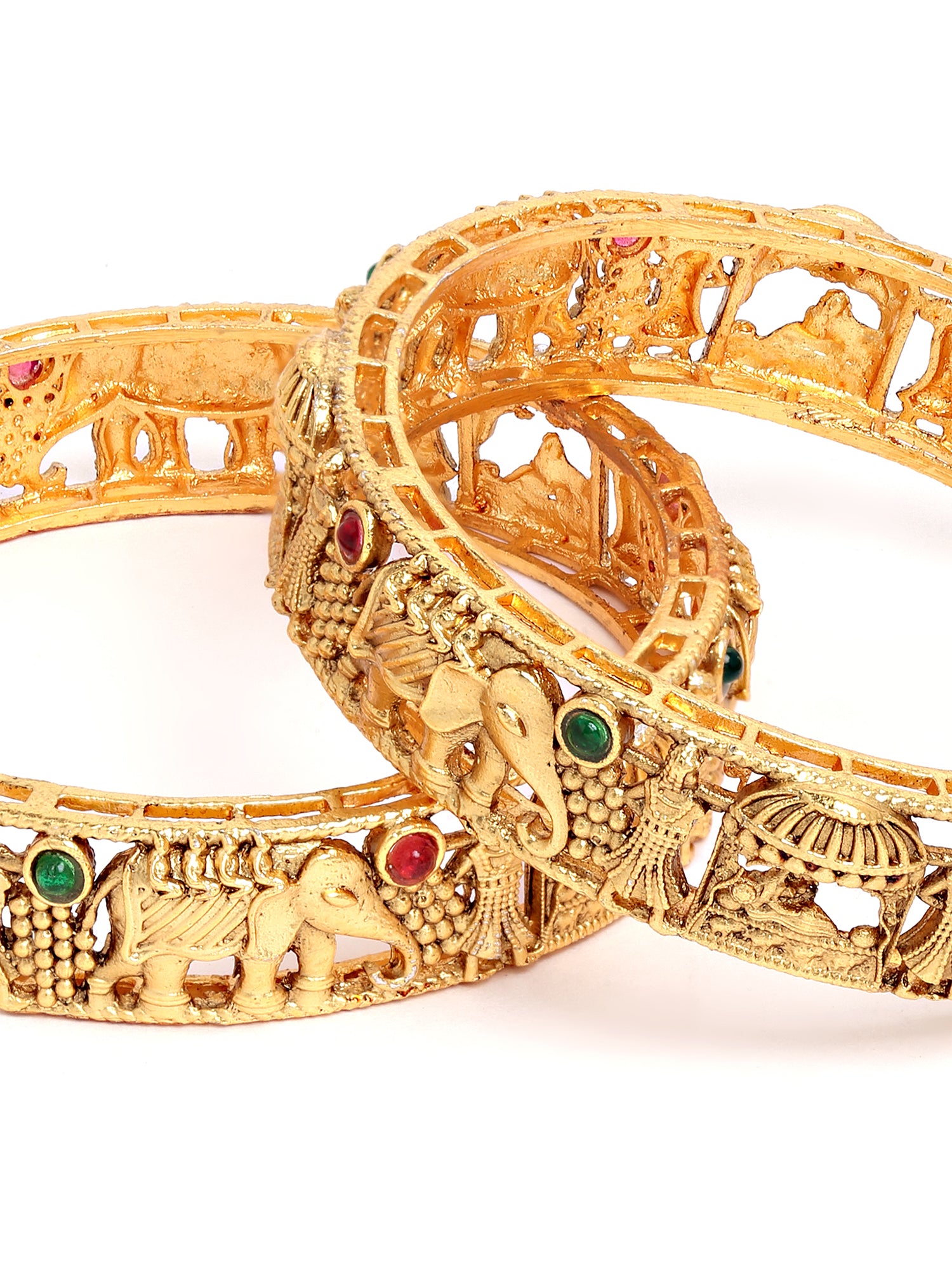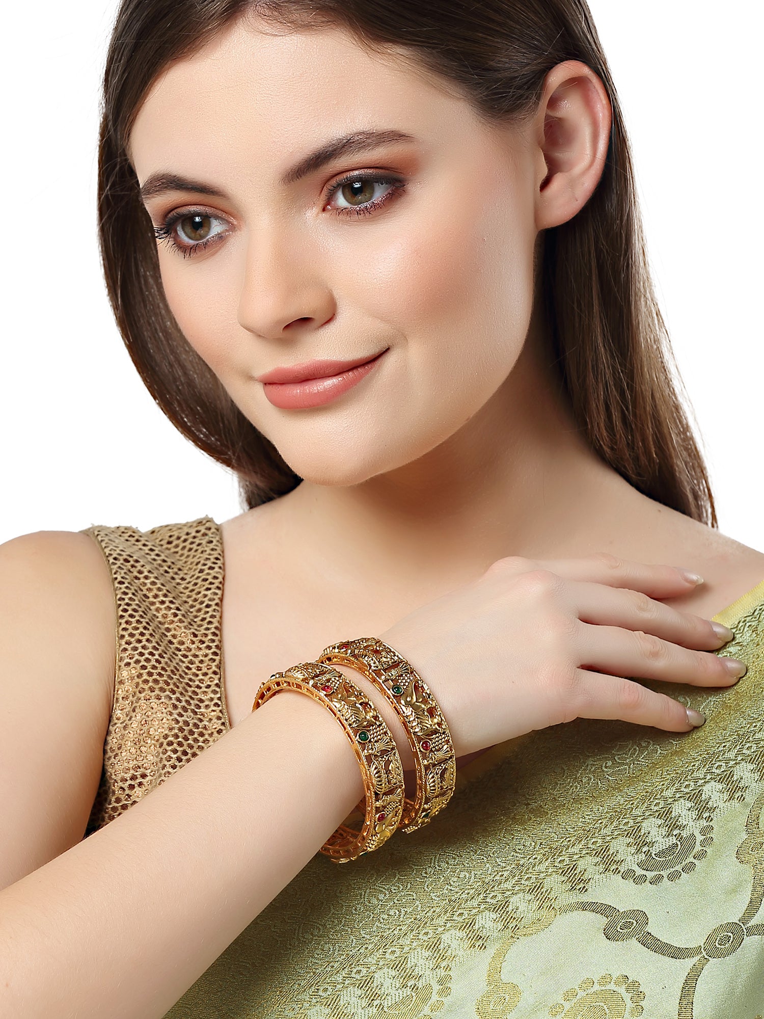 - Karatcart Set of 2 Antique Gold Plated Rajwadi Temple Bangles for Women .It's Five Layer Micro Gold Plated and Embellished with Kundan for High Durability. Intricate high polish creates glamorous reflections and adds a luxurious look. Perfect for Weddings, Festivals, Traditional Occasions. Best when paired with any Indian or Indo-Western Attire.