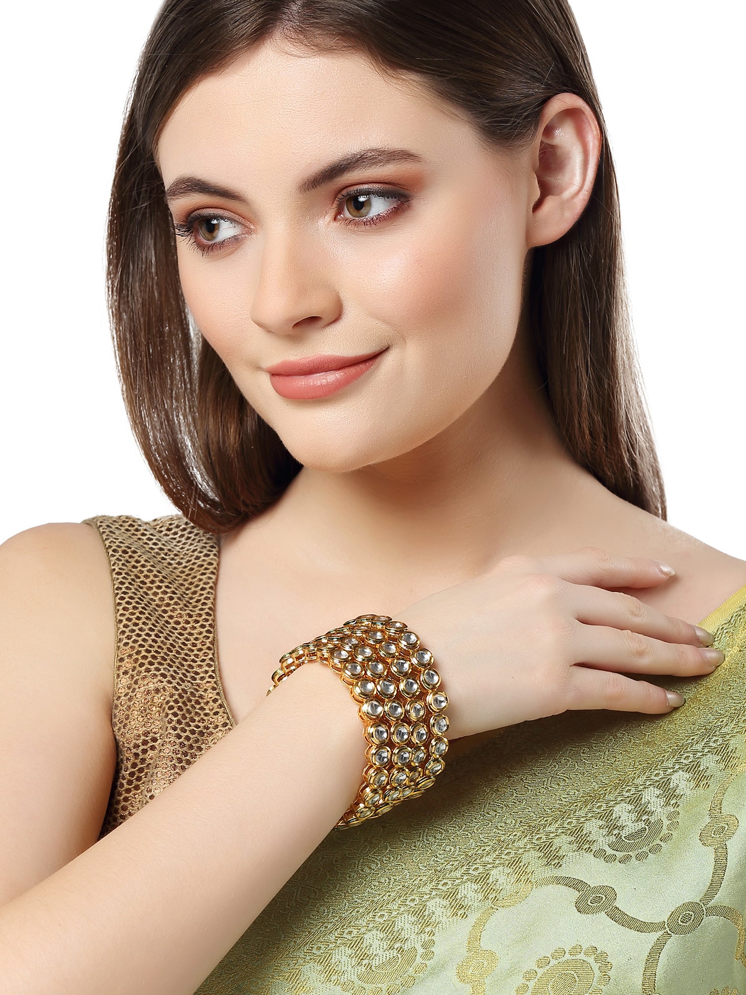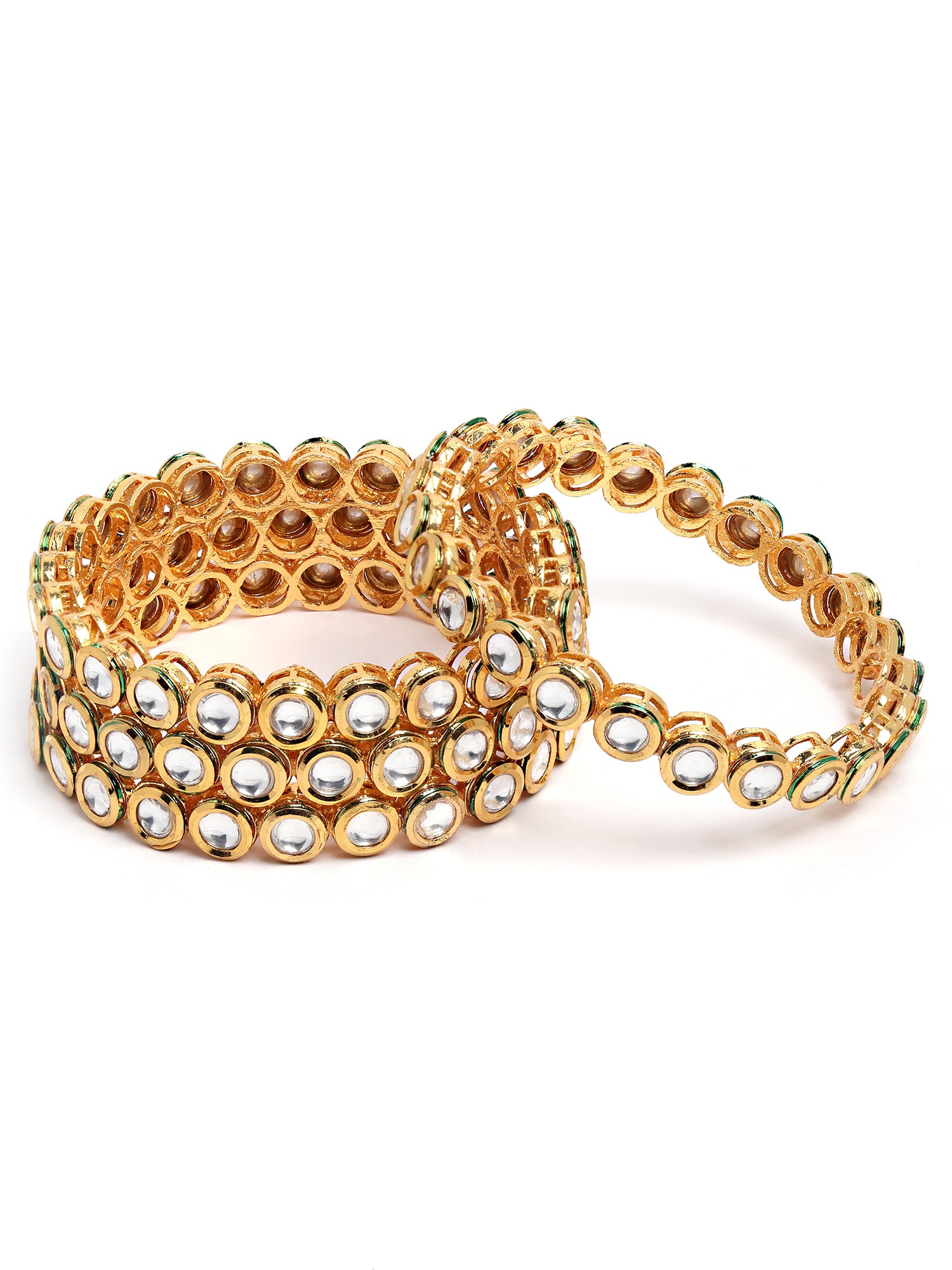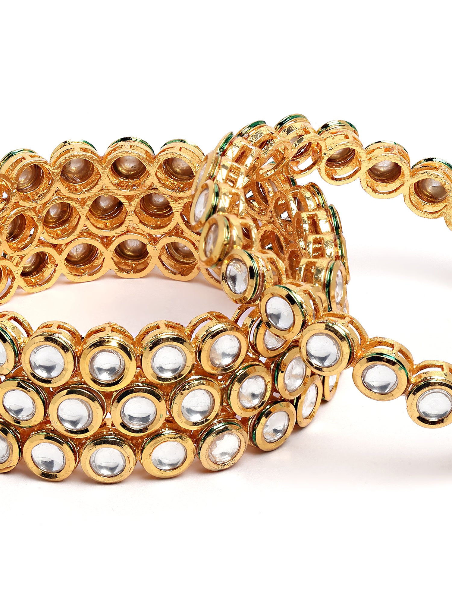- Karatcart Set of 4 Antique Gold Plated Round Polki Kundan Rajwadi Bangles for Women .It's Five Layer Micro Gold Plated and Embellished with Kundan for High Durability. Intricate high polish creates glamorous reflections and adds a luxurious look. Perfect for Weddings, Festivals, Traditional Occasions. Best when paired with any Indian or Indo-Western Attire.