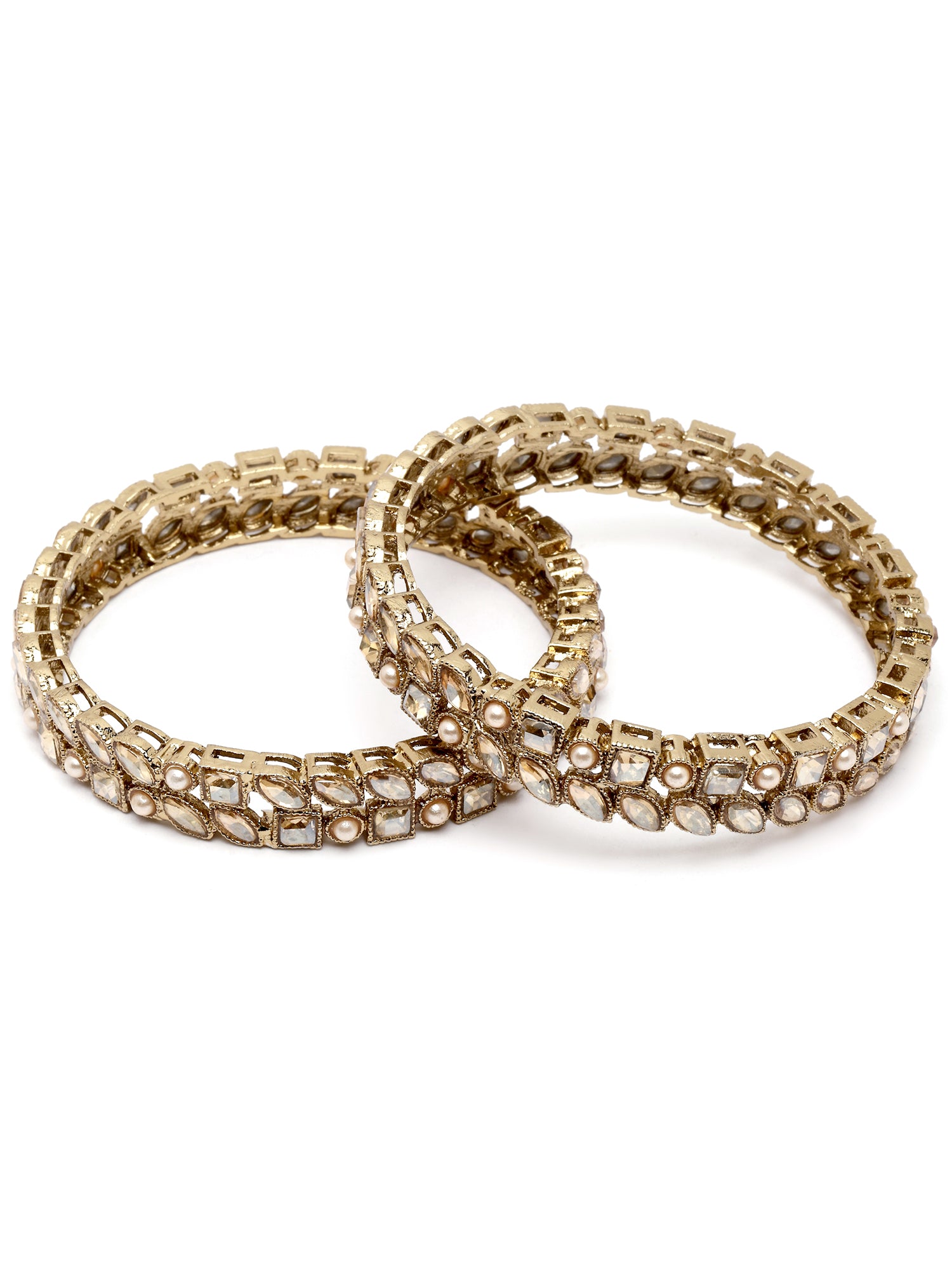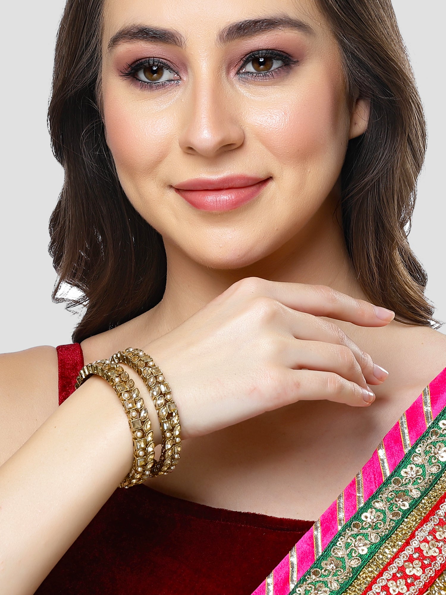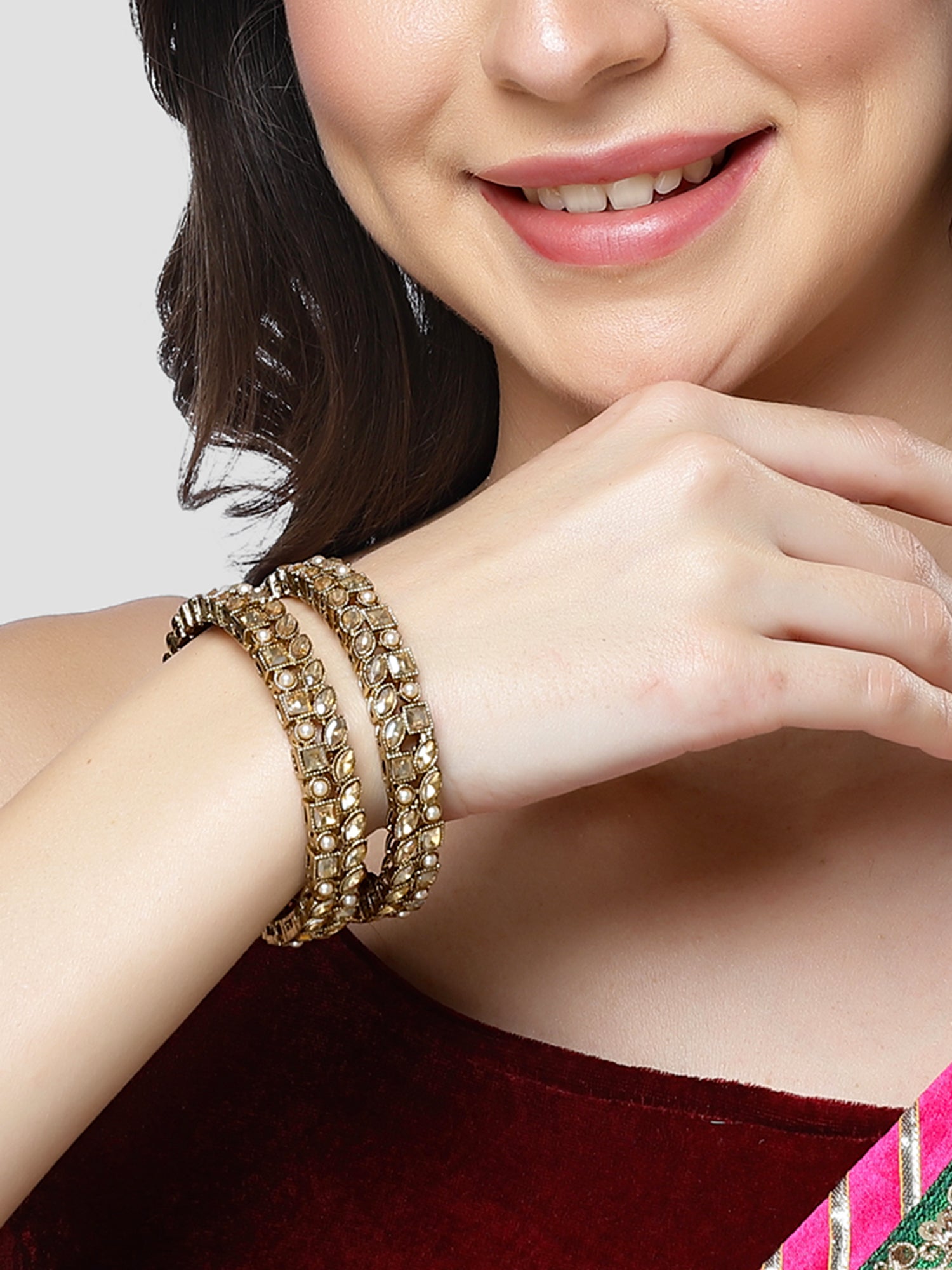 Karatcart Set of 2 Golden Kundan and Moti Studded Antique Gold Plated Bangles for Women