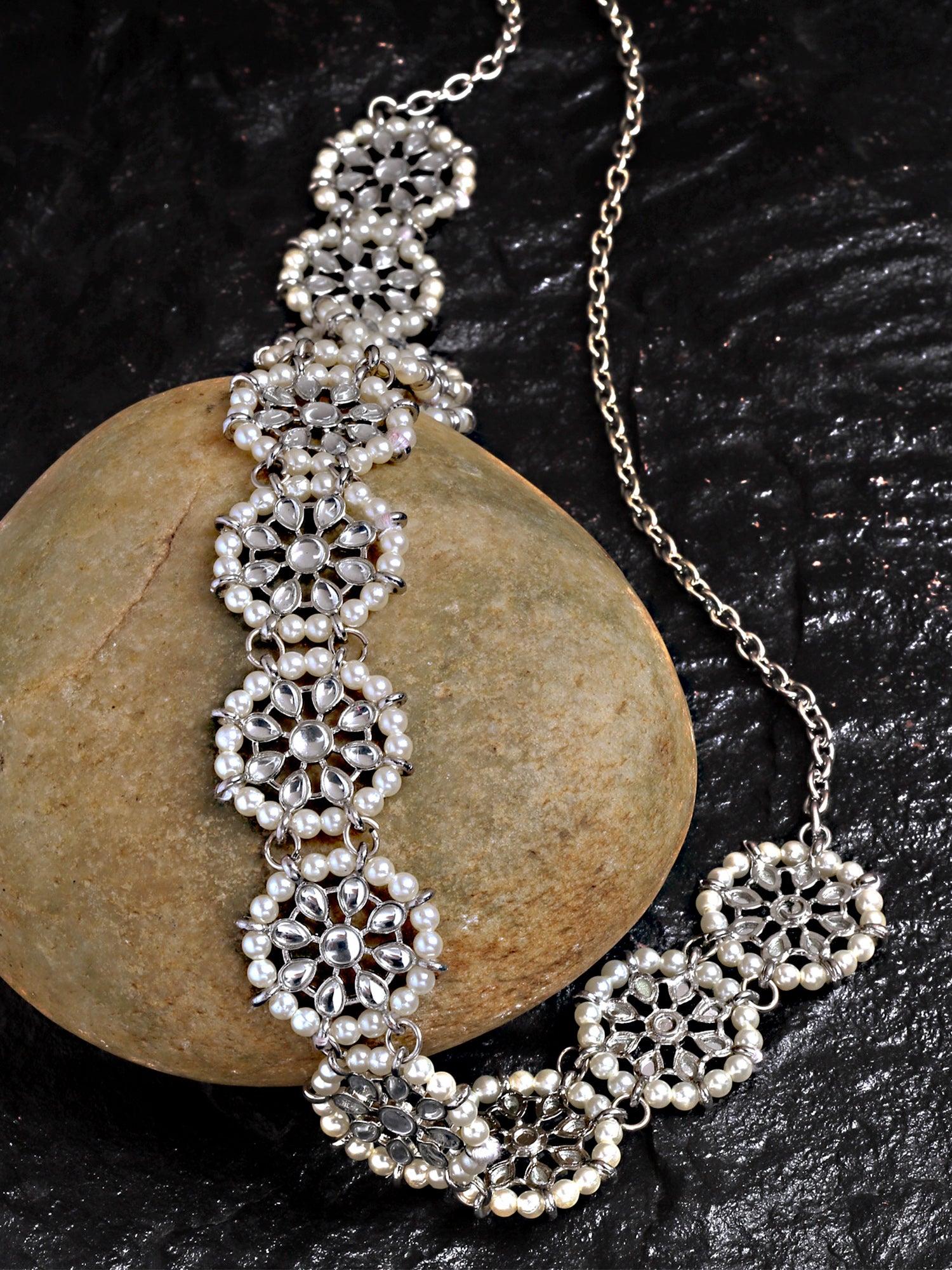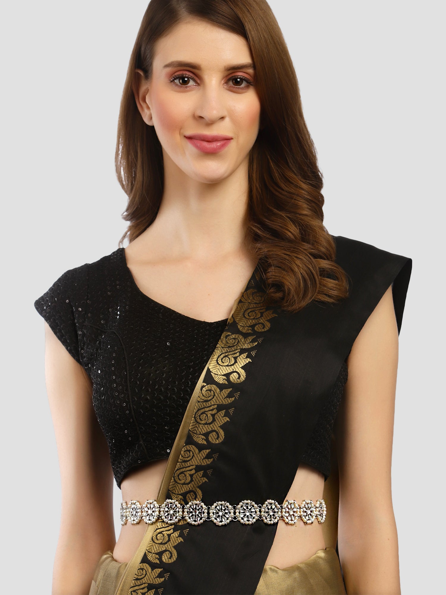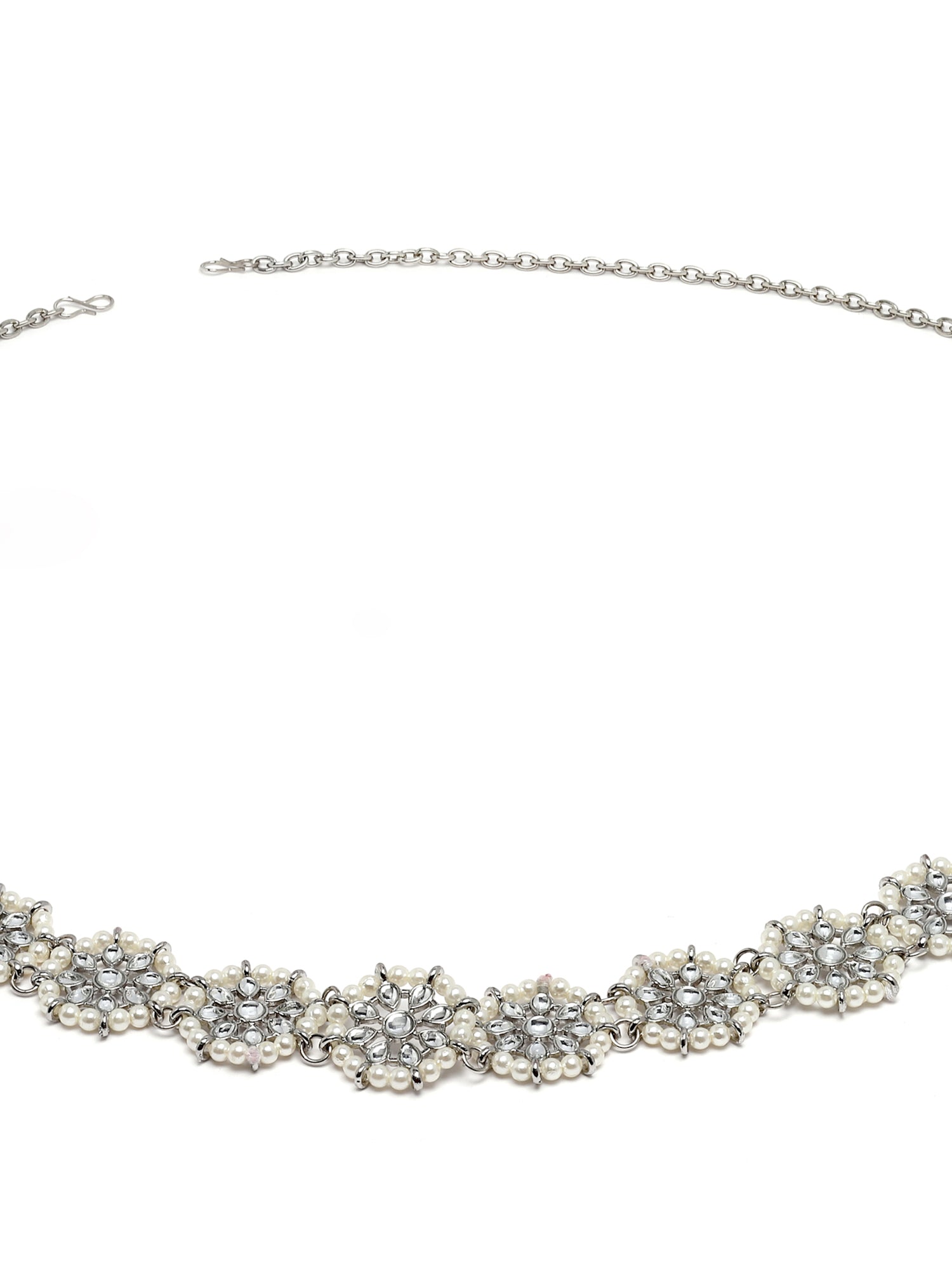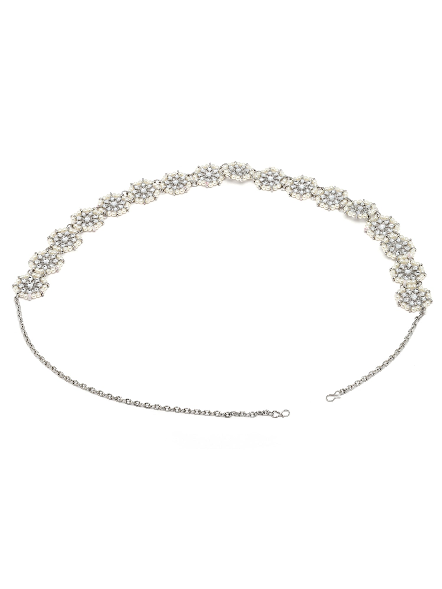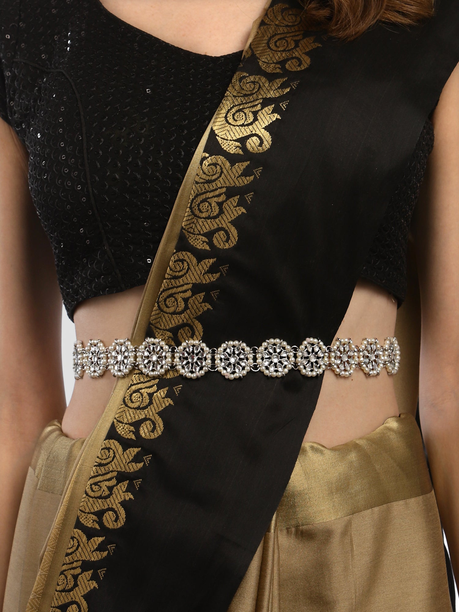 - Karatcart Oxidised Silver Floral Shape Kundan and Pearl Beaded Kamarbandh. It is made with high-quality Kundan Stones which makes them very skin-friendly. Perfect for Weddings, Parties, Festivals, and Traditional Occasions. Gracefully pair Saree, Kurti, or any Indo-western outfit to enhance your look. These are made from toxic-free materials which are Anti-Allergic and Safe for the skin.