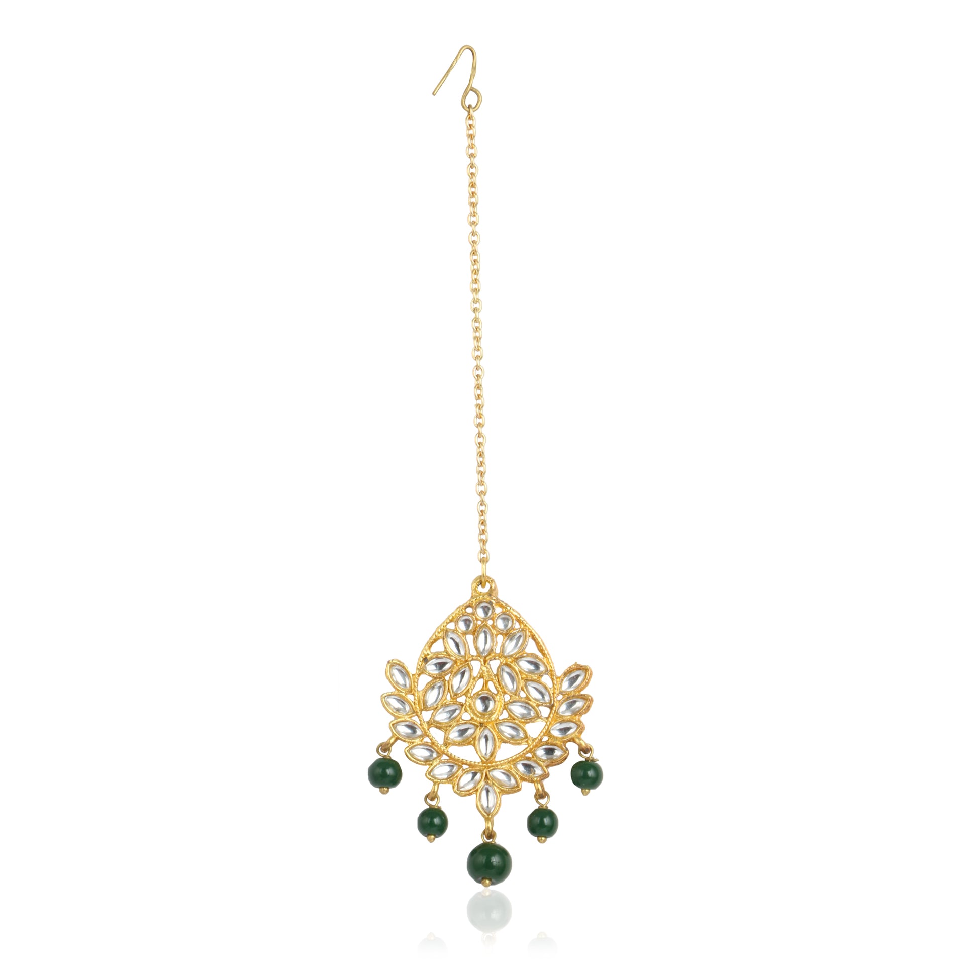 Traditional Gold Plated Green Beads Kundan Maangtikka for Women