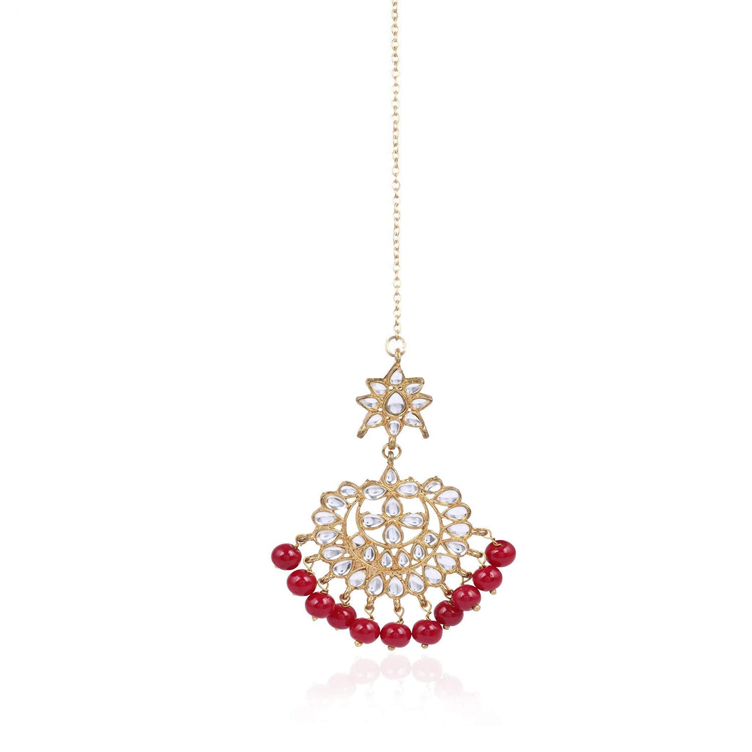 - Traditional Gold Plated Red Beads Kundan Maangtikka with Star for Women. It's Five Layer Micro Gold Plated and Embellished with Kundan for High Durability. Intricate high polish creates glamorous reflections and adds a luxurious look. Perfect for Weddings, Festivals, Traditional Occasions. Best when paired with any Indian outfit.