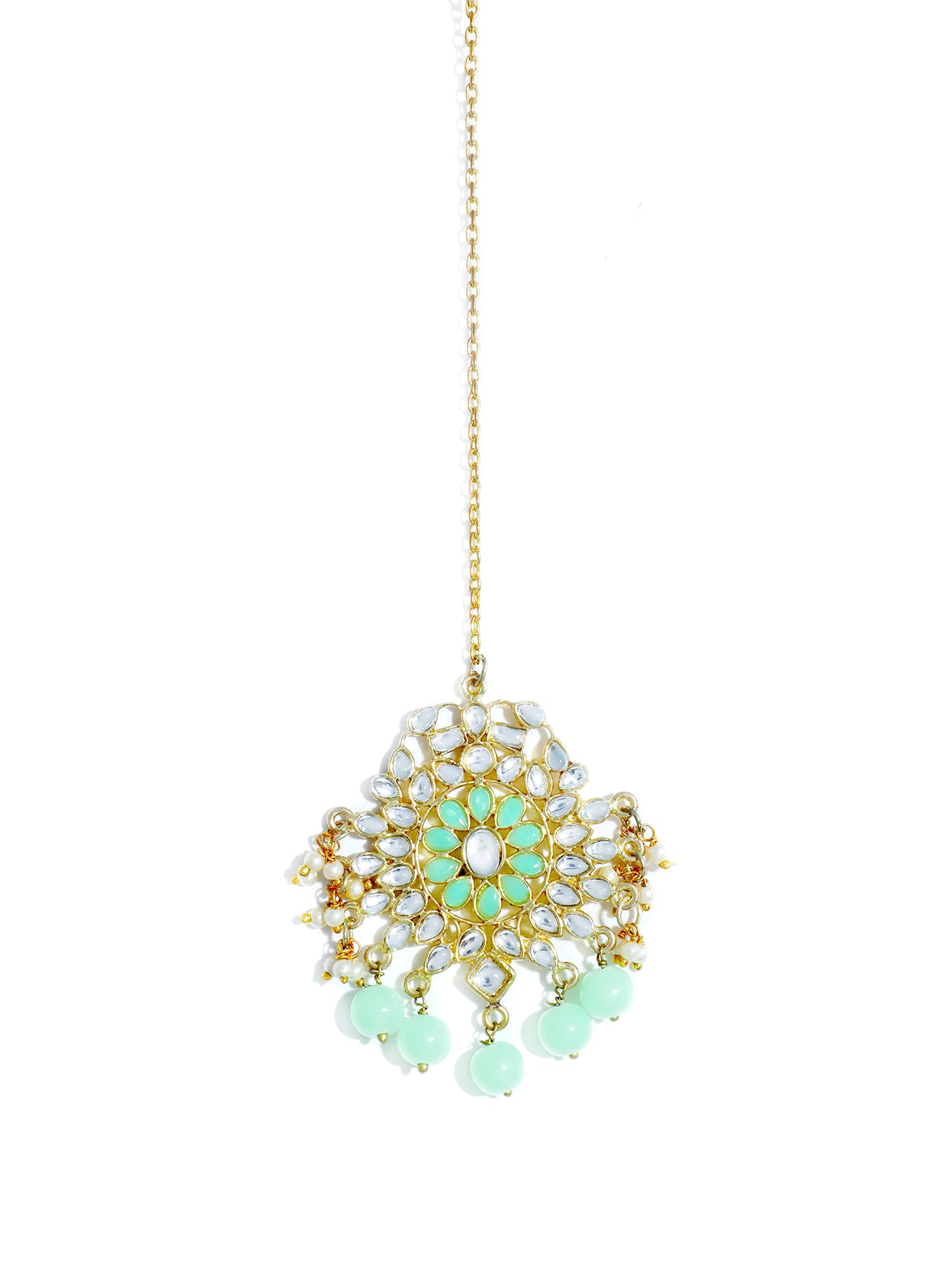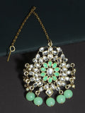 Traditional Gold Plated Mint Green Beads Kundan Maangtikka for Women