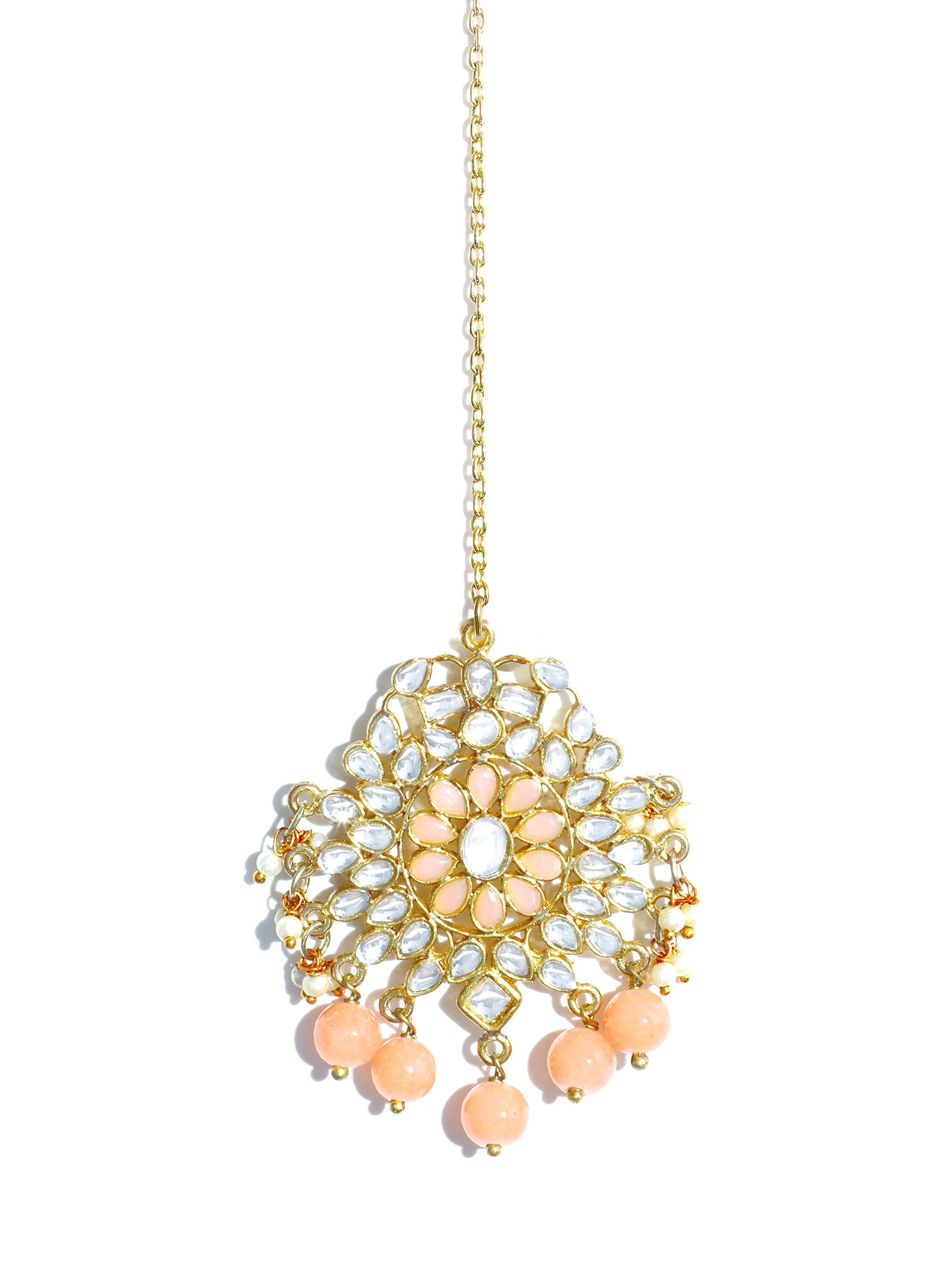 Traditional Gold Plated Peach Beads Kundan Maangtikka for Women