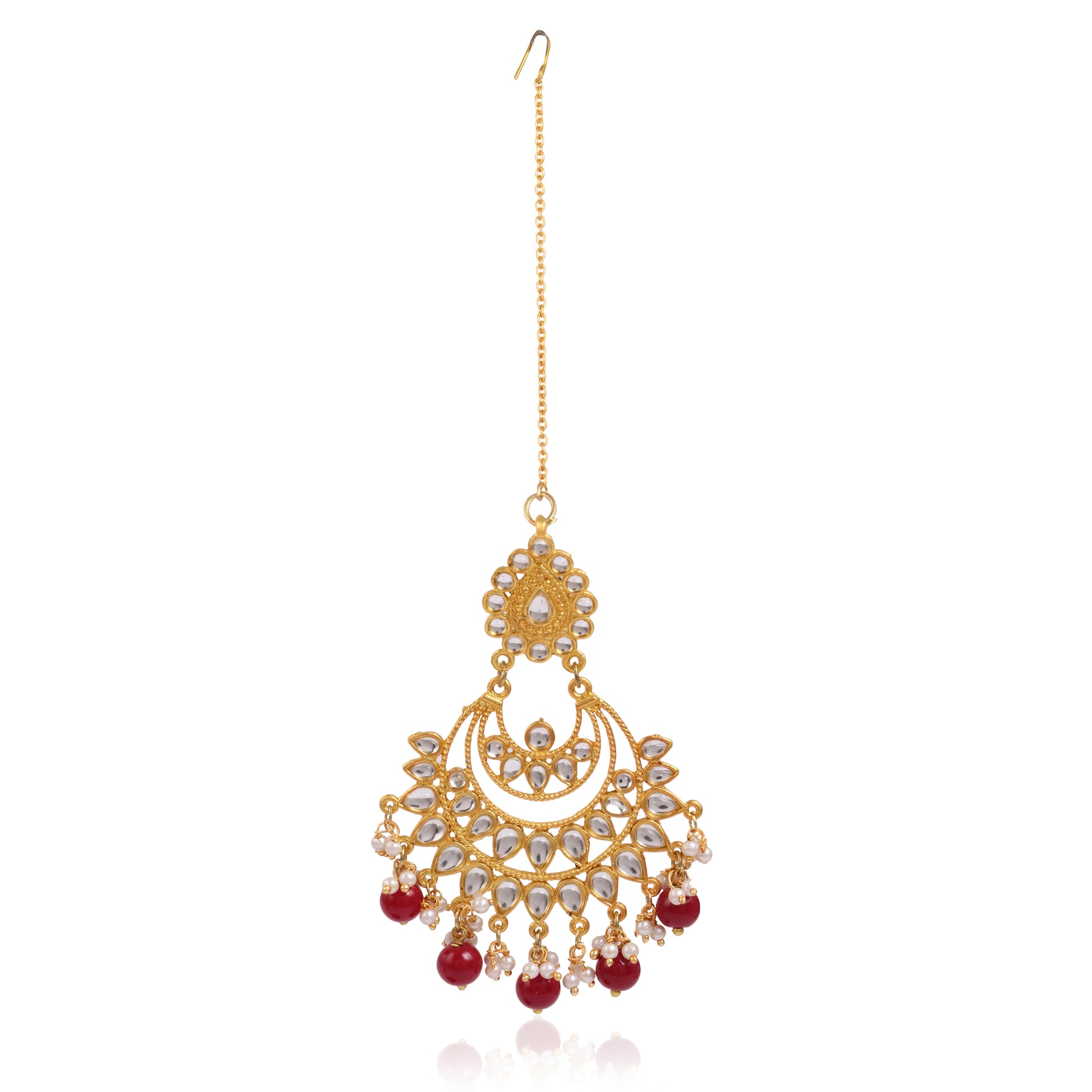 Traditional Gold Plated Red Beads Kundan Maangtikka for Women