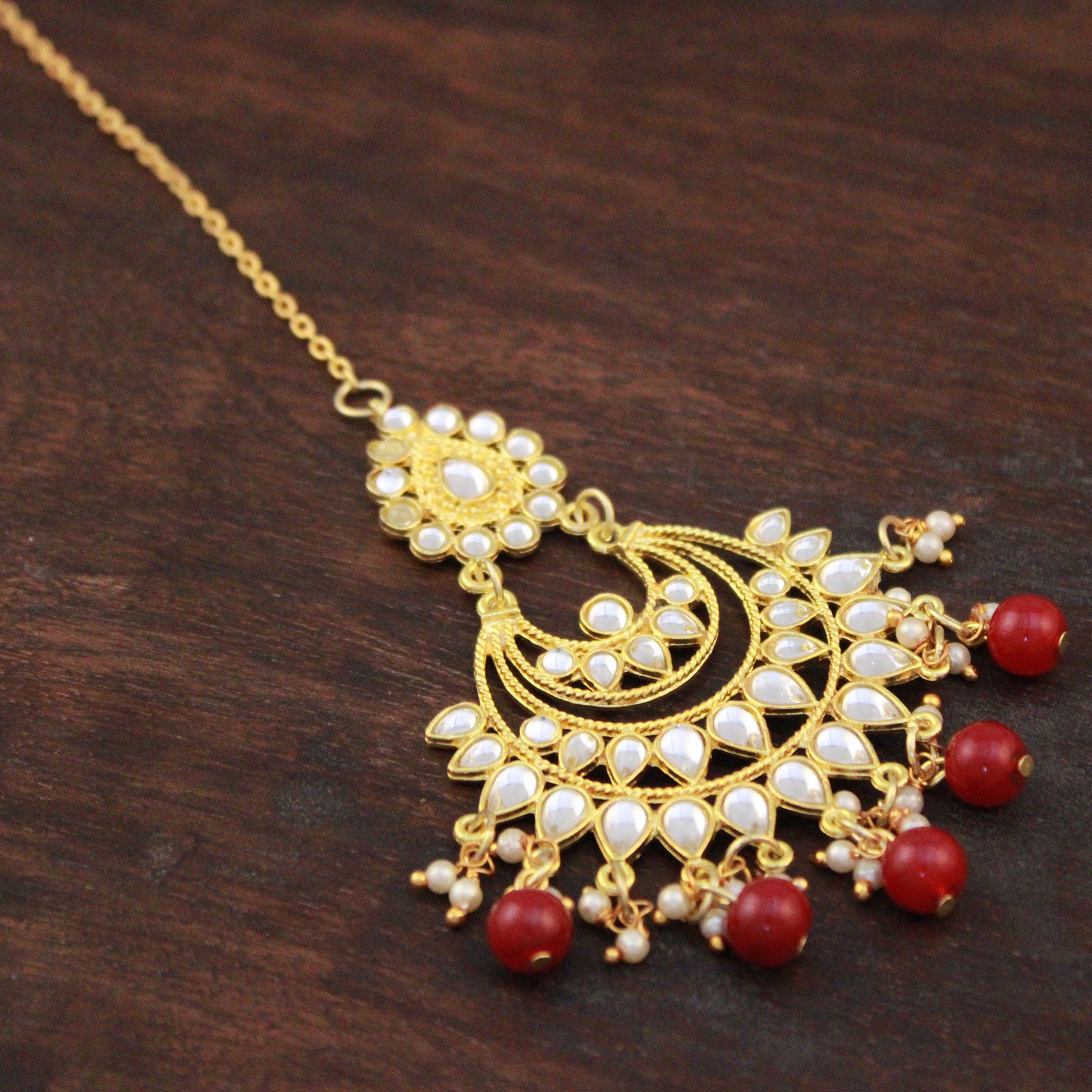 - Traditional Gold Plated Red Beads Kundan Maangtikka for Women. It's Five Layer Micro Gold Plated and Embellished with Kundan for High Durability. Intricate high polish creates glamorous reflections and adds a luxurious look. Perfect for Weddings, Festivals, Traditional Occasions. Best when paired with any Indian outfit.