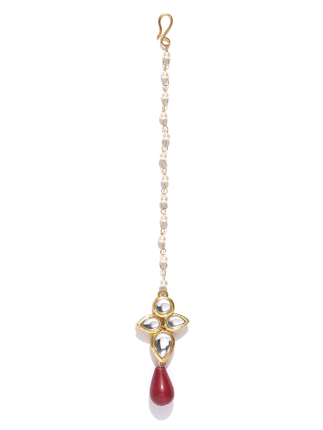 - Traditional Gold Plated Red Drop Kundan Maangtikka for Women. It's Five Layer Micro Gold Plated and Embellished with Kundan for High Durability. Intricate high polish creates glamorous reflections and adds a luxurious look. Perfect for Weddings, Festivals, Traditional Occasions. Best when paired with any Indian outfit.