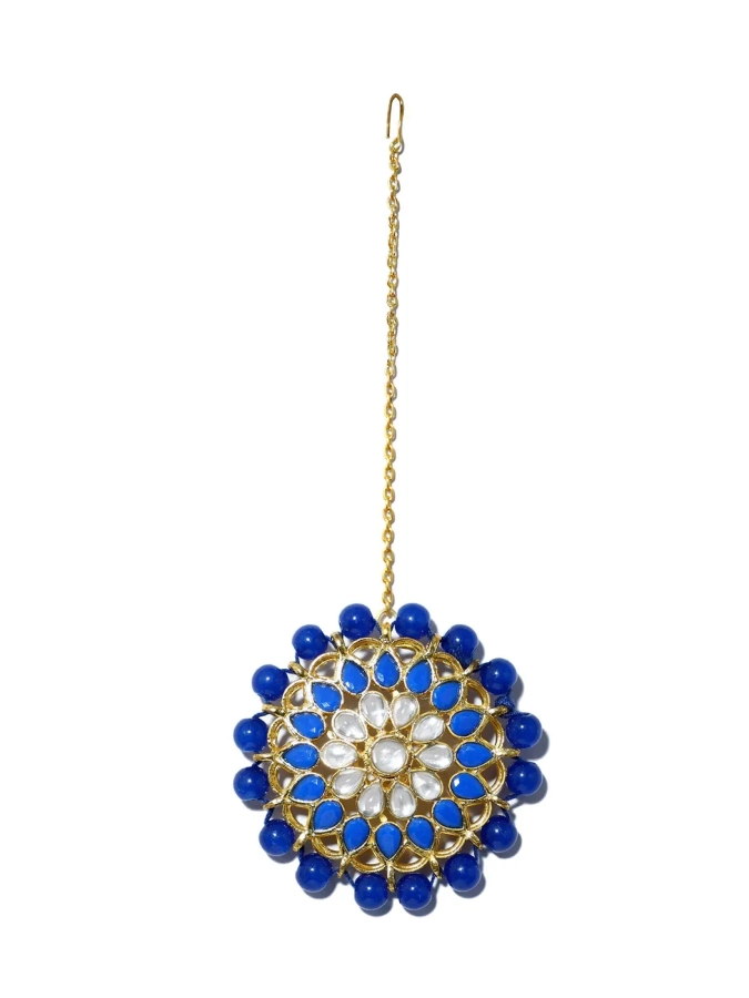 - Gold Plated Blue Beads Kundan Maangtikka. It's Five Layer Micro Gold Plated and Embellished with Kundan for High Durability. Intricate high polish creates glamorous reflections and adds a luxurious look. Perfect for Weddings, Festivals, Traditional Occasions. Best when paired with any Indian or Indo Western Attire.