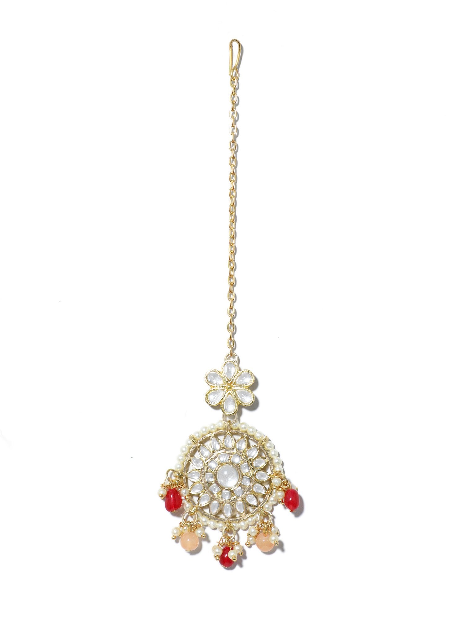 Gold Plated Red and Peach Beads Kundan Maangtikka