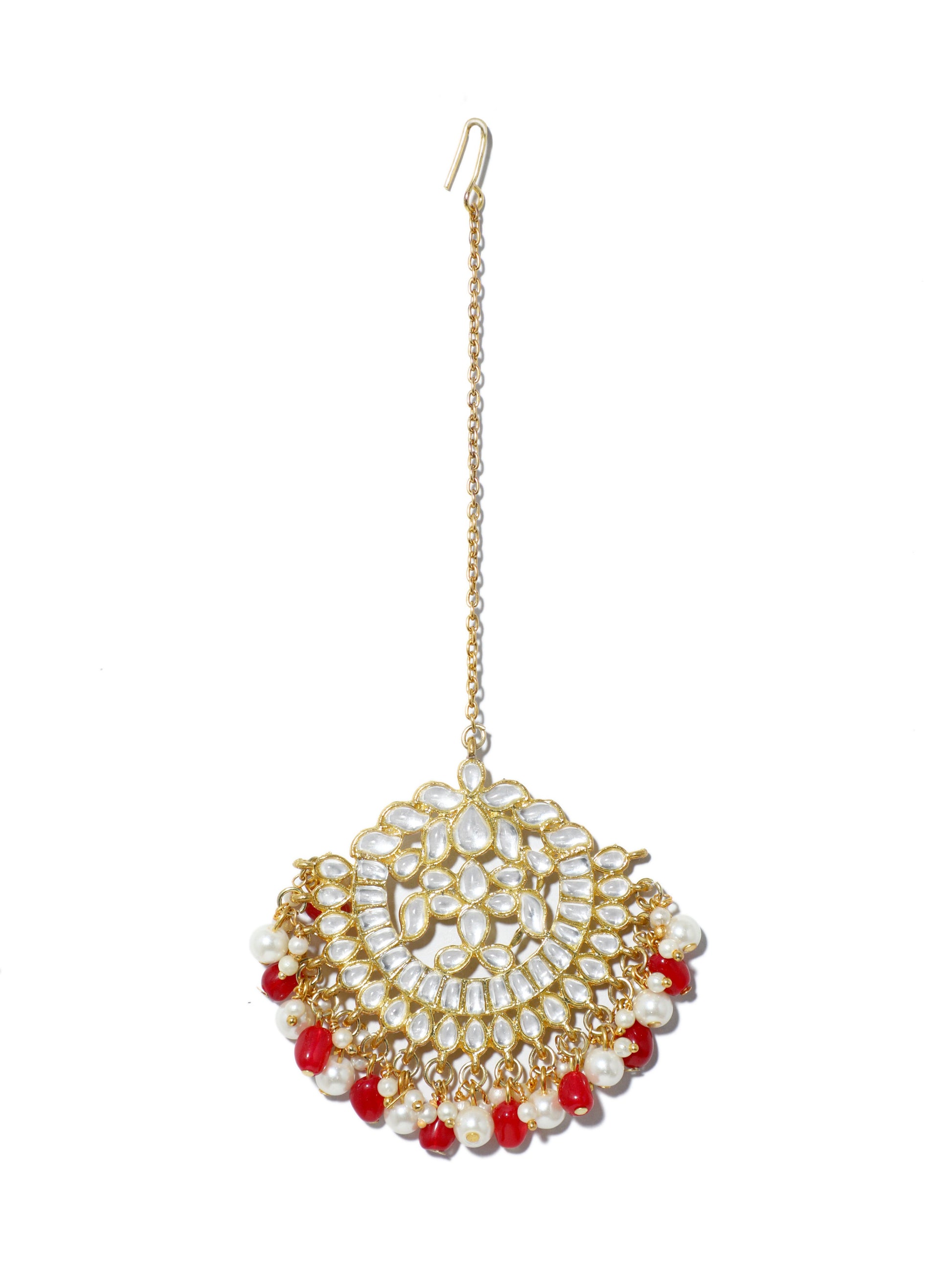 Gold Plated Red and Pearl Beads Kundan Maangtikka