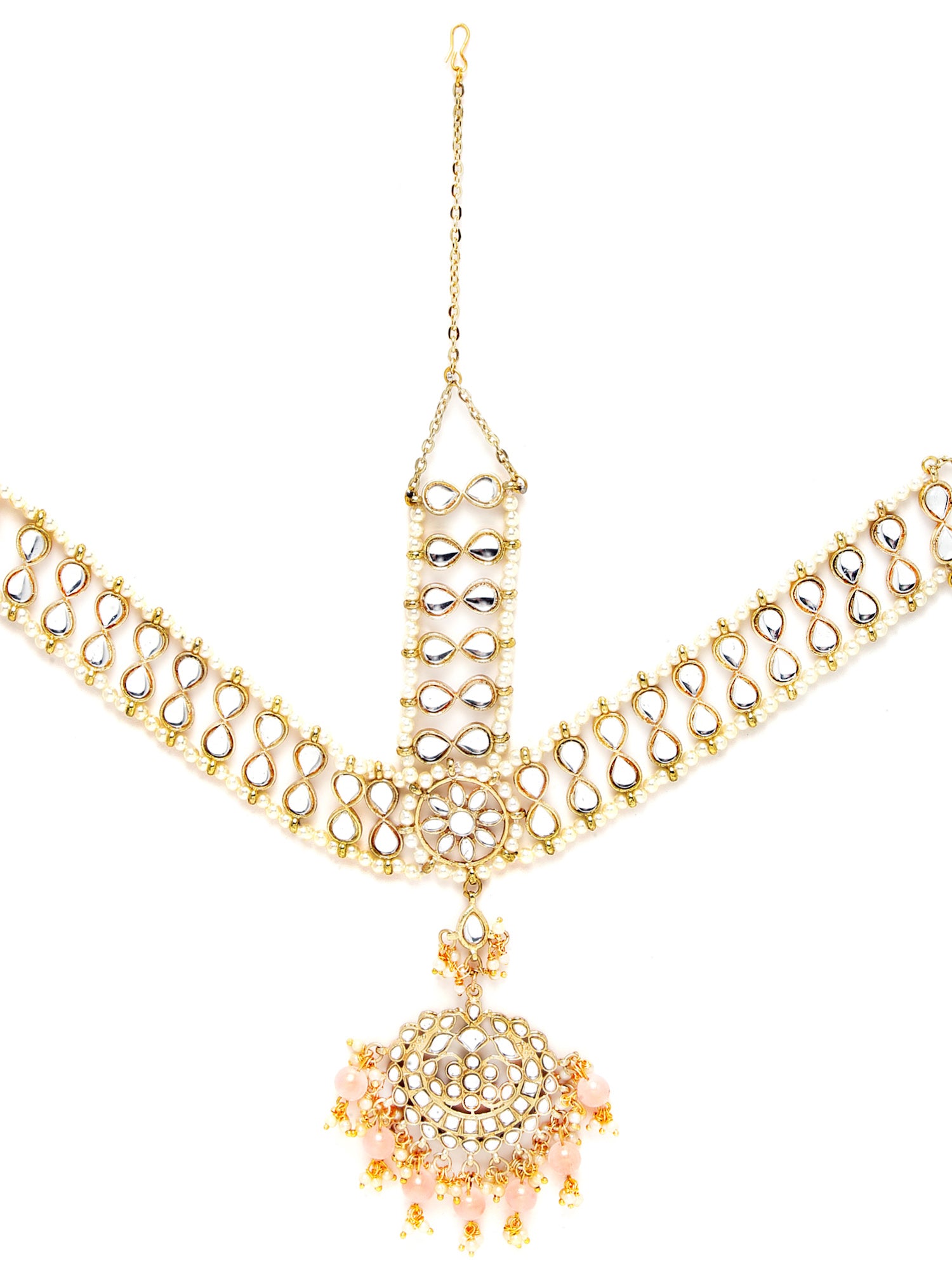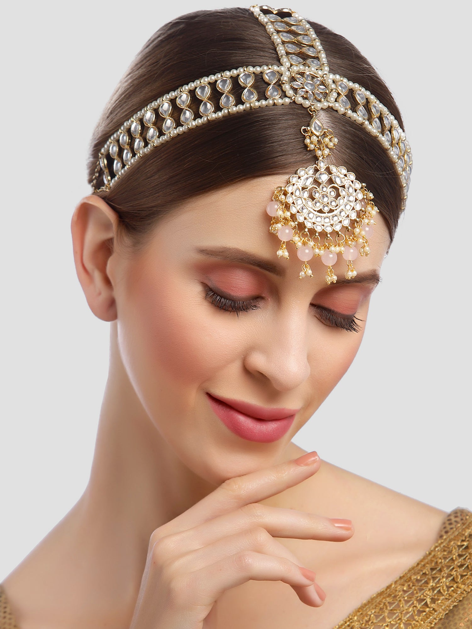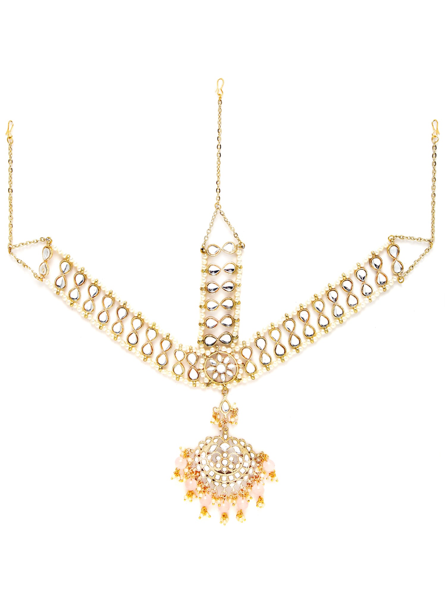 - Karatcart Gold Plated Floral Shape Pink Beads Studded Handcrafted Kundan Mathapatti for Women. It is made with high-quality Kundan Stones which makes them very skin-friendly. Perfect for Weddings, Parties, Festivals, and Traditional Occasions. Gracefully pair Saree, Kurti, or any Indo-western outfit to enhance your look. These are made from toxic-free materials which are Anti-Allergic and Safe for the skin.