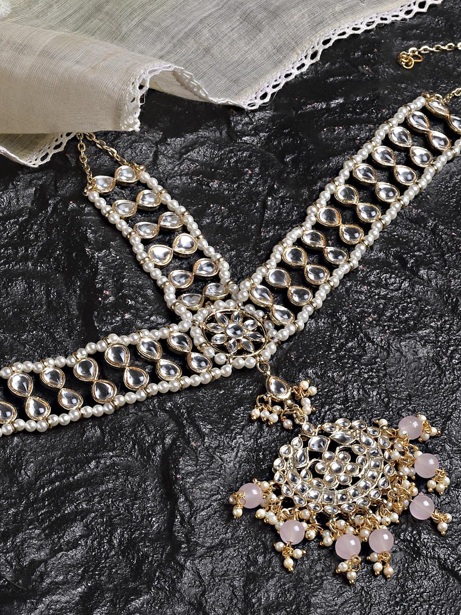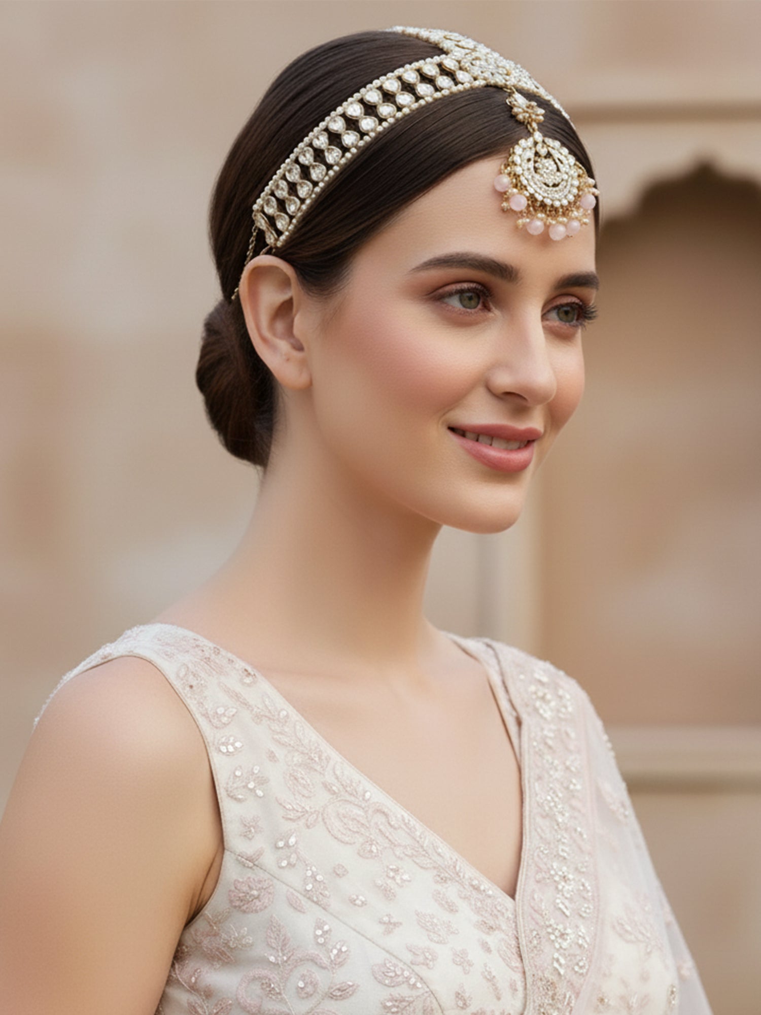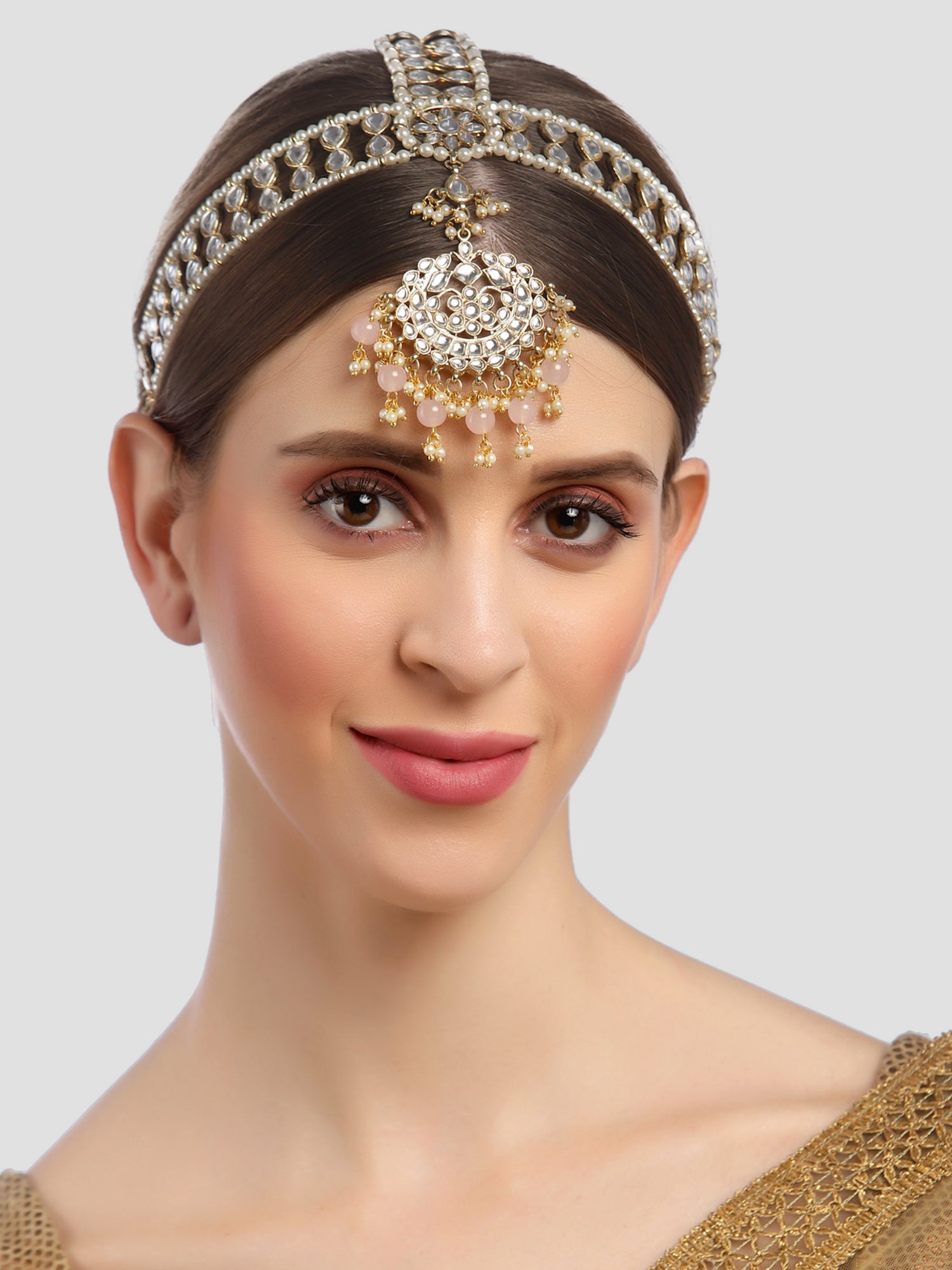 - Karatcart Gold Plated Floral Shape Pink Beads Studded Handcrafted Kundan Mathapatti for Women. It is made with high-quality Kundan Stones which makes them very skin-friendly. Perfect for Weddings, Parties, Festivals, and Traditional Occasions. Gracefully pair Saree, Kurti, or any Indo-western outfit to enhance your look. These are made from toxic-free materials which are Anti-Allergic and Safe for the skin.