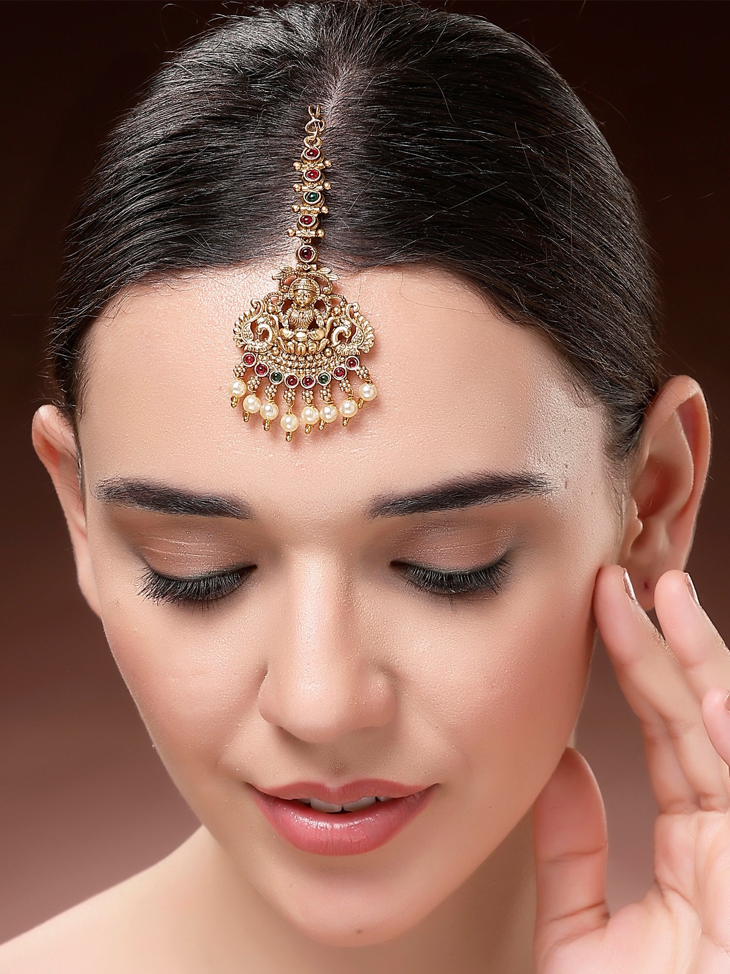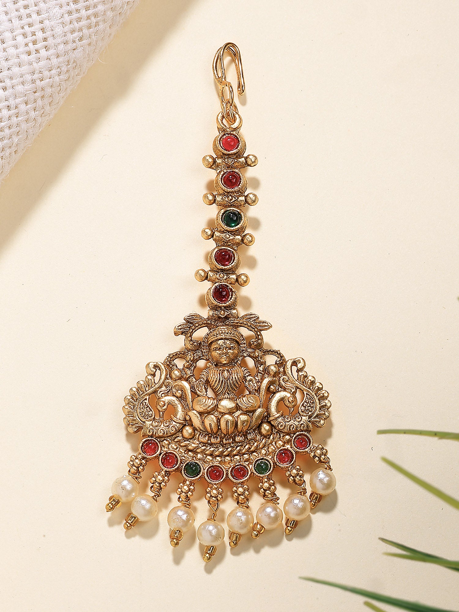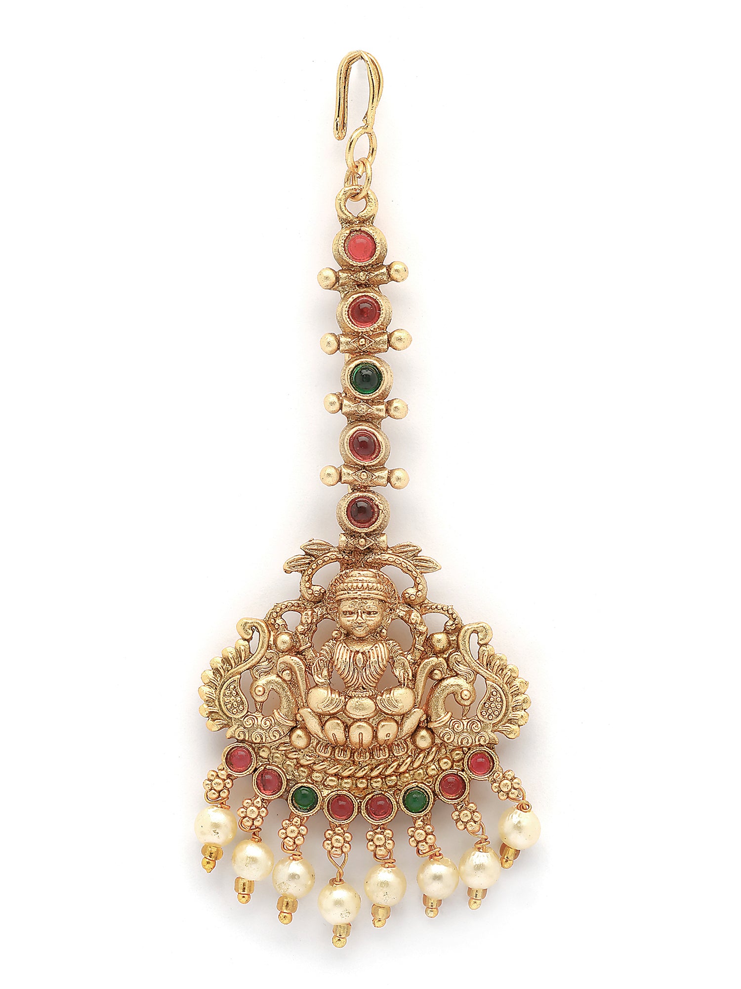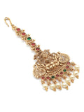 Karatcart Traditional Gold Plated Temple Style Lakshmi Maang Tikka with Pearl Drops