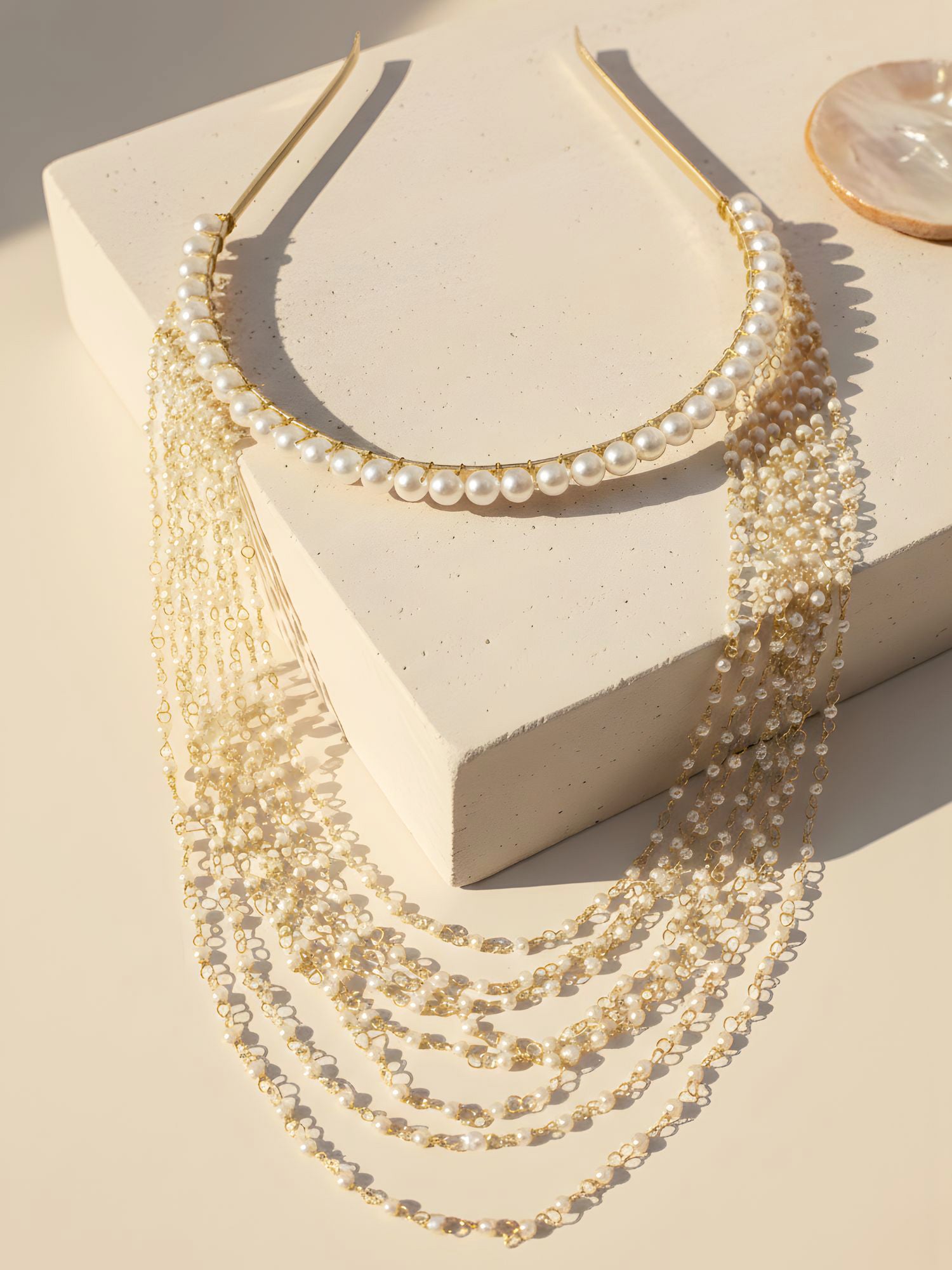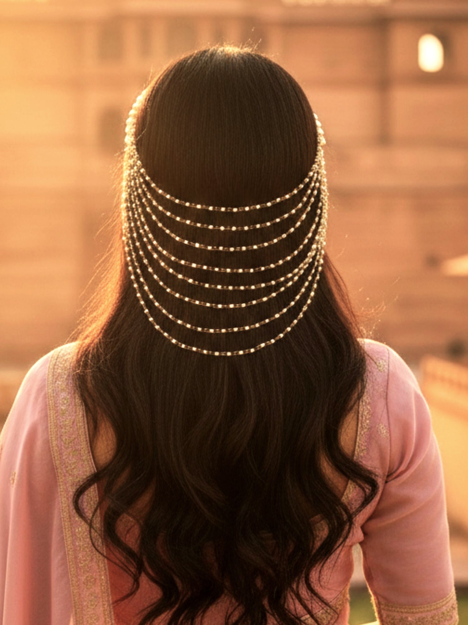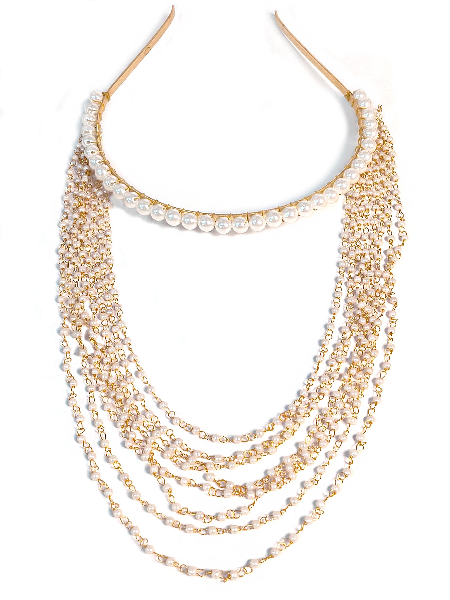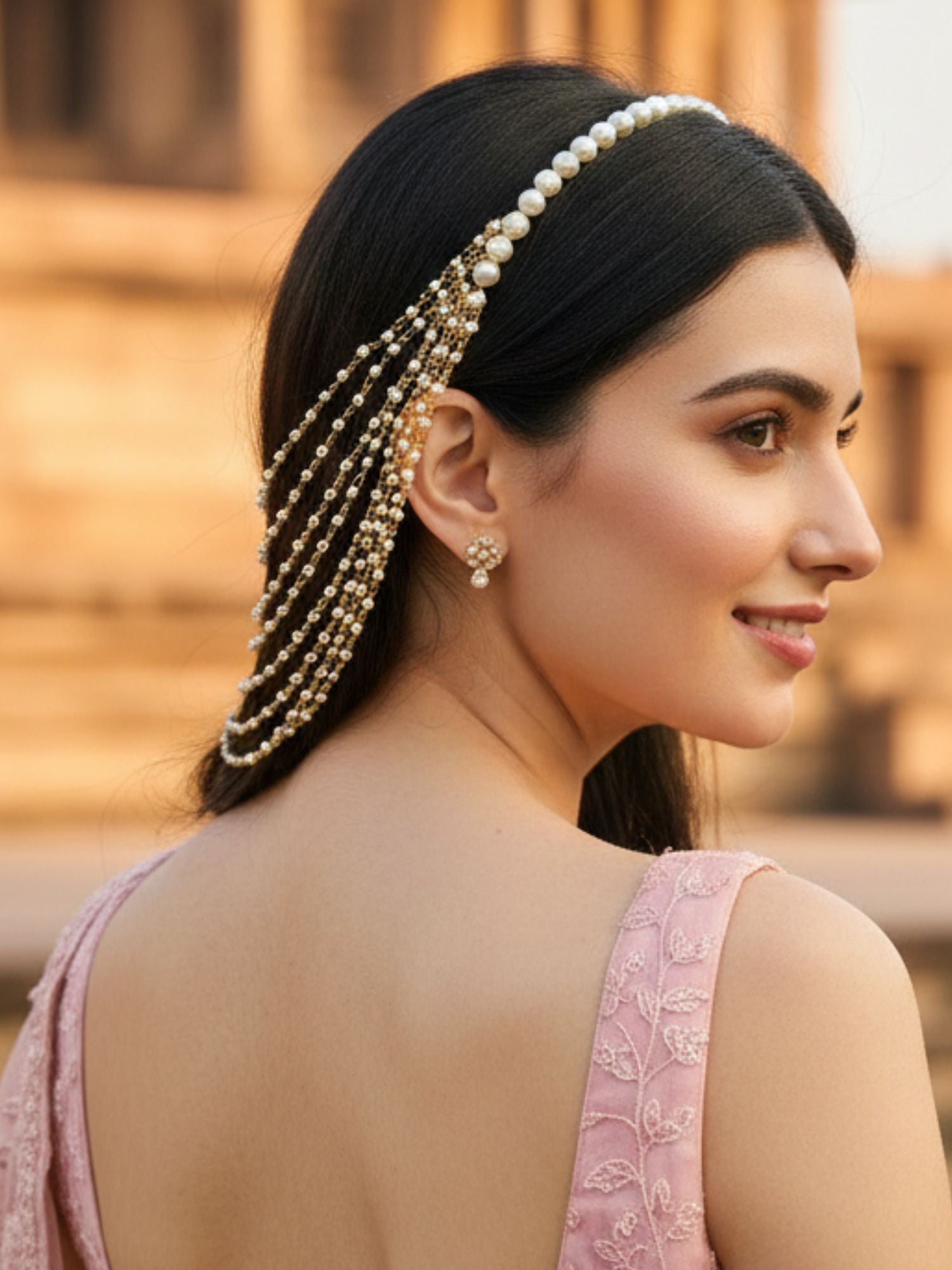 KARATCART Traditional Gold Plated Pearl Hairband with Multi Layer Chain for Women