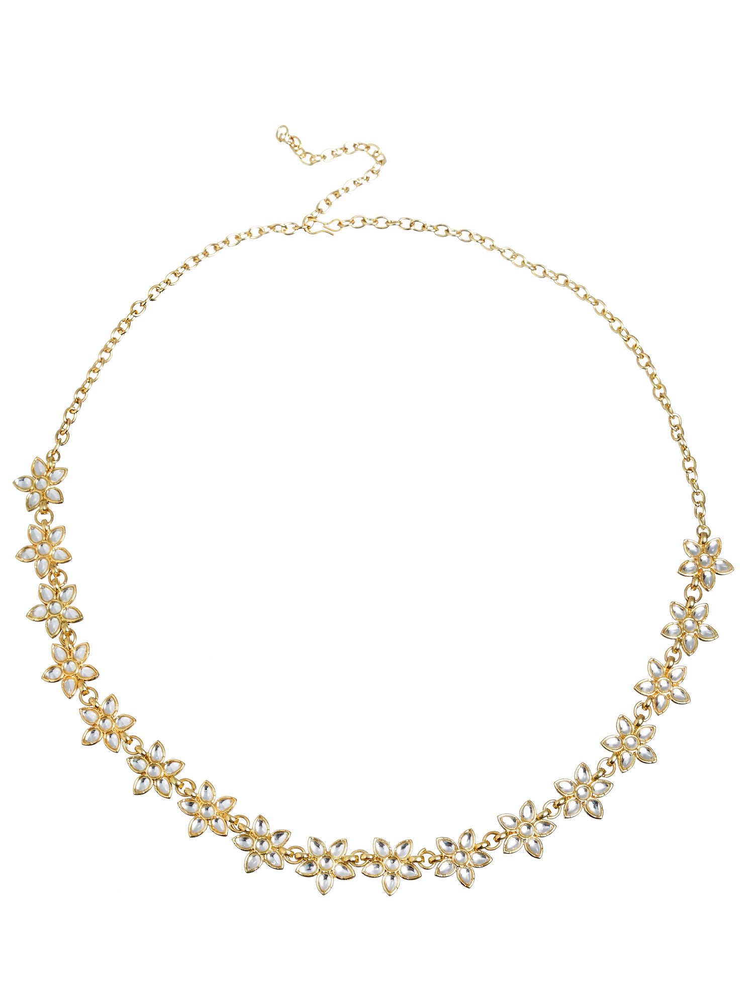 - Floral Shaped Kundan Studded Gold Plated Hairband. A Delicate Glossy Finish Lightweight Kundan Hairband for Women's. Intricate high polish creates glamorous reflections and adds a luxurious look. Perfect for Weddings, Festivals, Traditional Occasions. Best when paired with any Indian outfit.