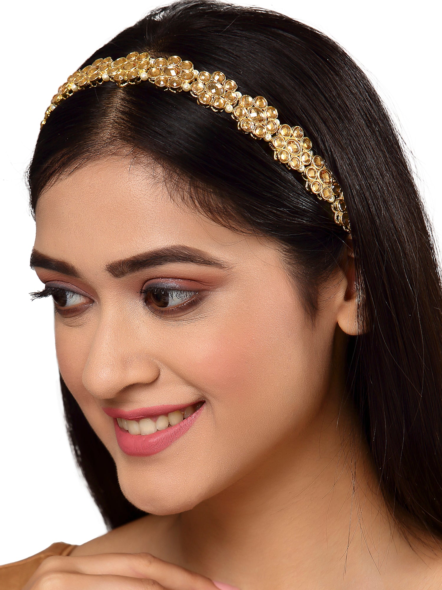 - Karatcart Ethnic Golden Kundan Embellished Hairband for Women. It's Five Layer Micro Gold Plated and Embellished with Kundan for High Durability. Intricate high polish creates glamorous reflections and adds a luxurious look. Perfect for Weddings, Festivals, Traditional Occasions. Best when paired with any Indian outfit.